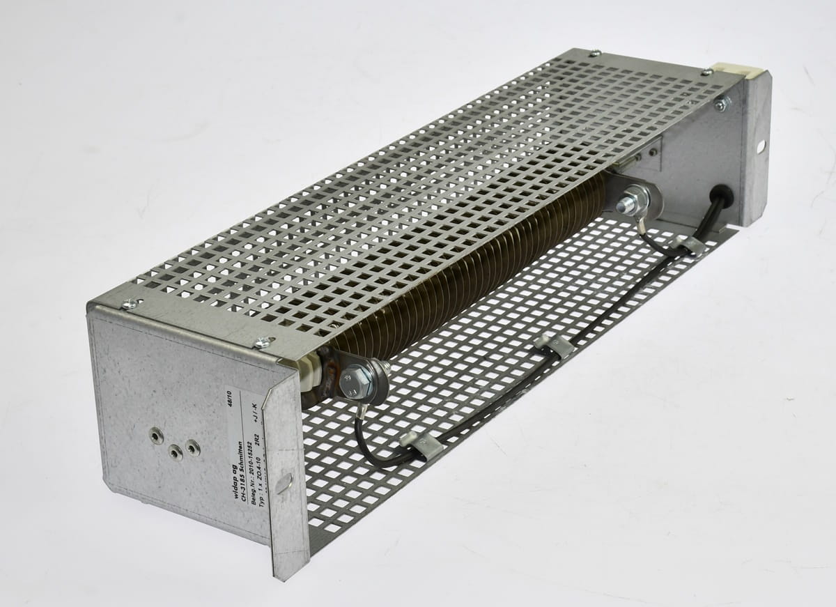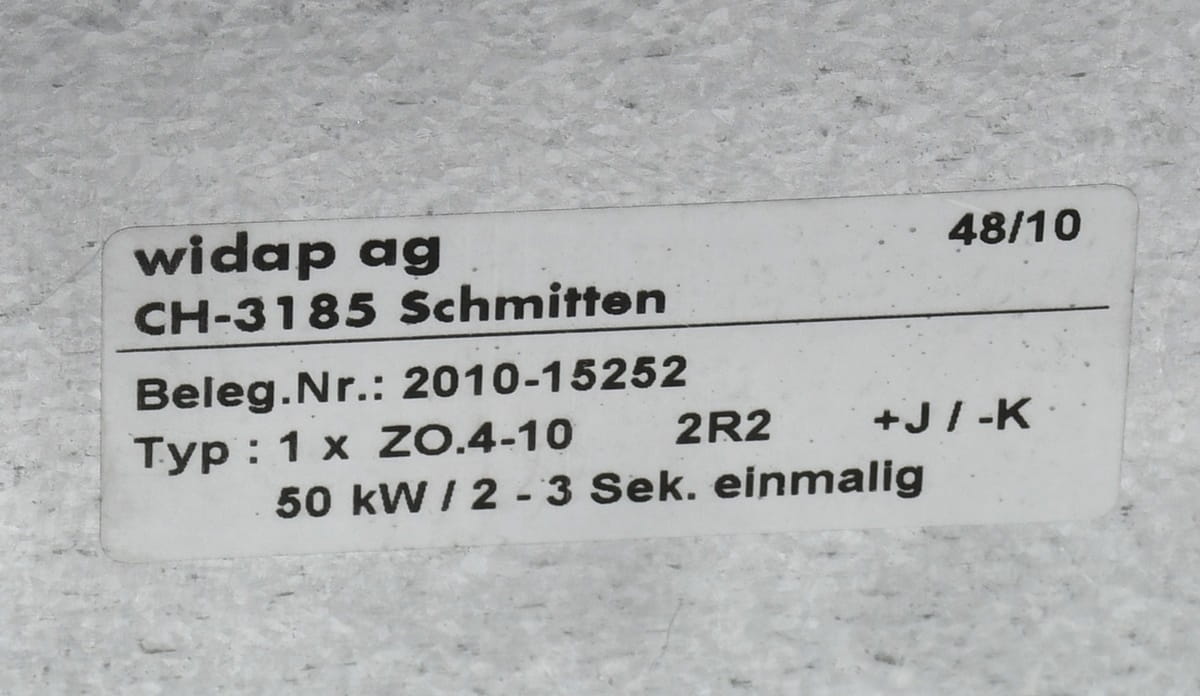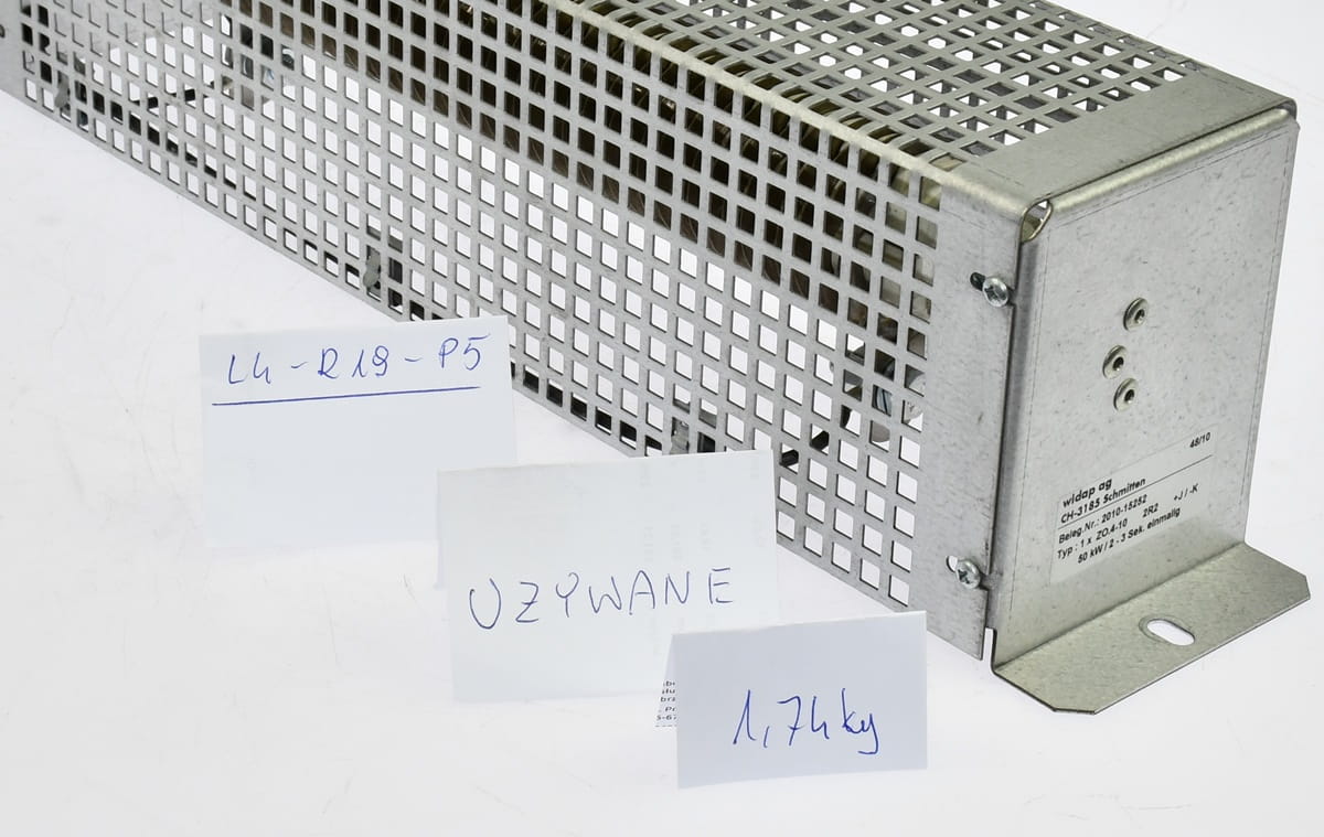 Używany, całkowicie sprawny element o symbolu: 1 x ZO.4-10 2R2 +J/-K, producent: widap ag, kod produktu: 2010-15252. Rezystor dużej mocy stosowany w ukłądach napędów sterowanych numerycznie do hamowania. Chwilowa moc do 50 kW (2 ... 3 sec.). Pochodzi z demontażu całkowicie sprawnych maszyn przemysłowych.