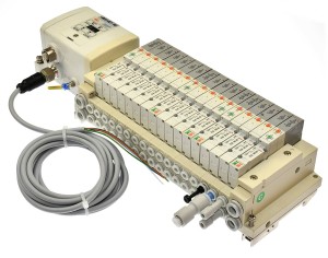 Używana, całkowicie sprawna wyspa zaworowa renomowanej firmy SMC złożona z sekcji o symbolach: 10-SV1100-5FUD - 12 sztuk; 10-SV1A00-5FUD - 5 sztuk. Sterowanie cyfrowe za pomocą modułu o symbolu: EX250-SPR1 również firmy SMC, moduł szeregowy zapewnia komunikację z wyspą za pomocą dostępnych protokołów: DeviceNet, CC-Link, AS-i, Profibus-DP oraz CANopen.