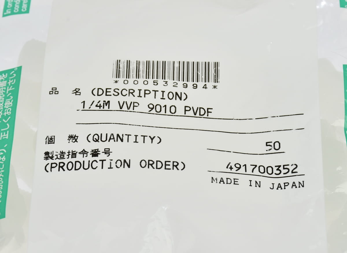 Nie używany element o oznaczeniu: 1/4M VVP 9010 PVDF produkt firmy H.Ikeuchi&Co.,Ltd. Dysza rozpylająca do cieczy. Wykonana z polifluorku winylidenu wysoce odpornego na czynniki chemiczne. Gwint mocowania 1/4 cala.