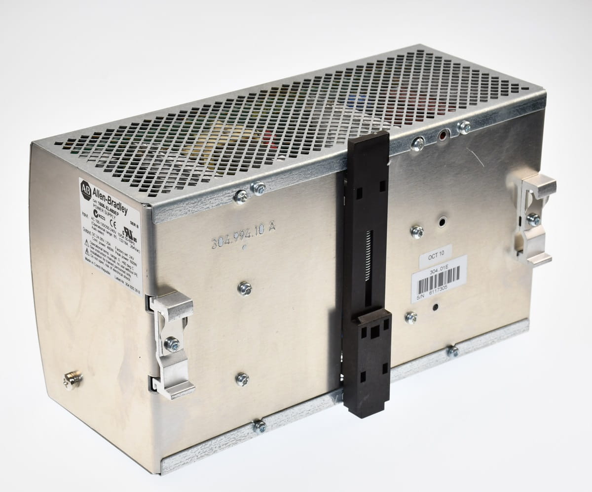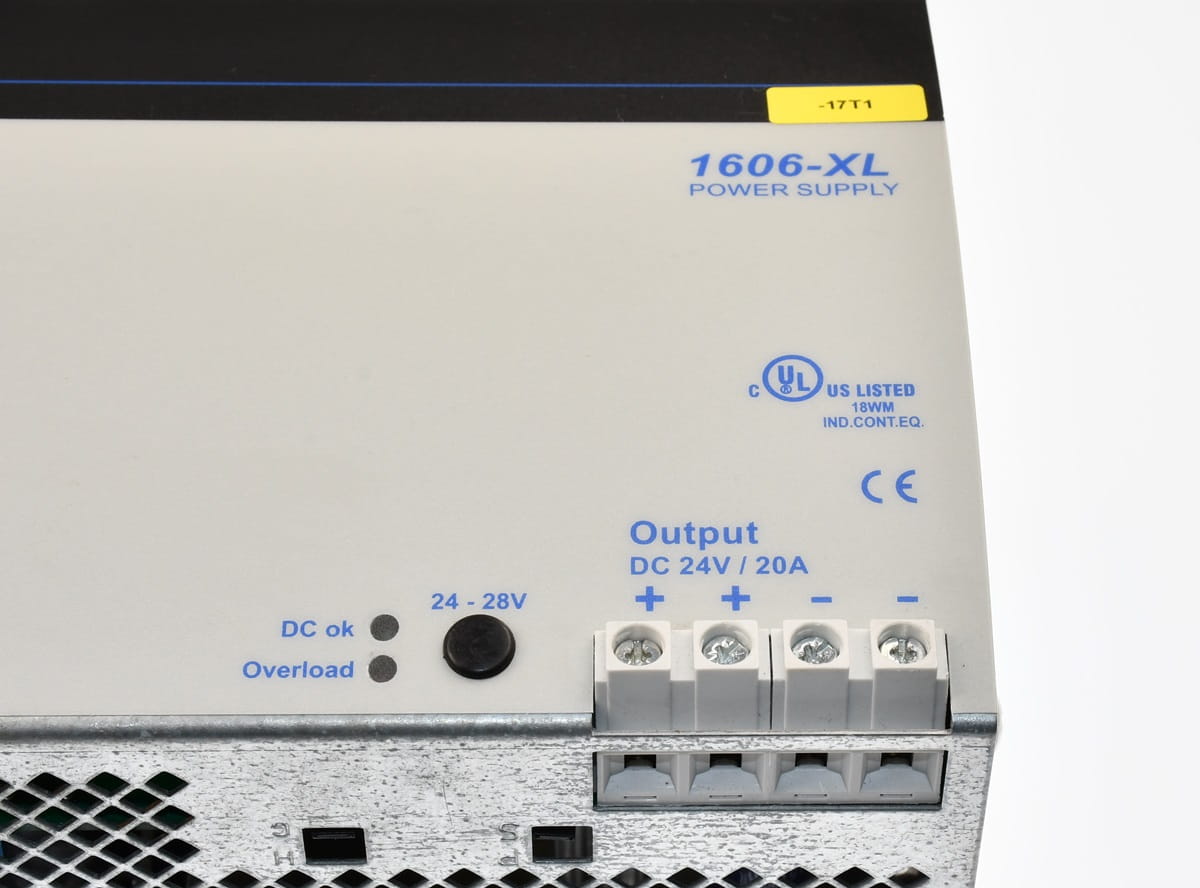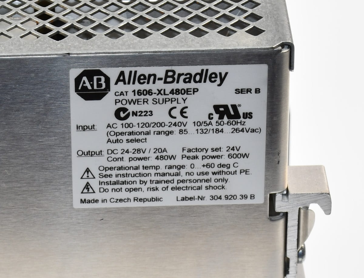 Używany, całkowicie sprawny i w idealnym stanie zasilacz impulsowy przeznaczony do montażu na szynach DIN, produkt o symbolu: 1606-XL480EP, produkt firmy Allen-Bradley. Moc ciągła zasilacza 480W, chwilowo 600W. Na wyjściu 24V (24 - 28V) z wydajnością prądu do 20A.