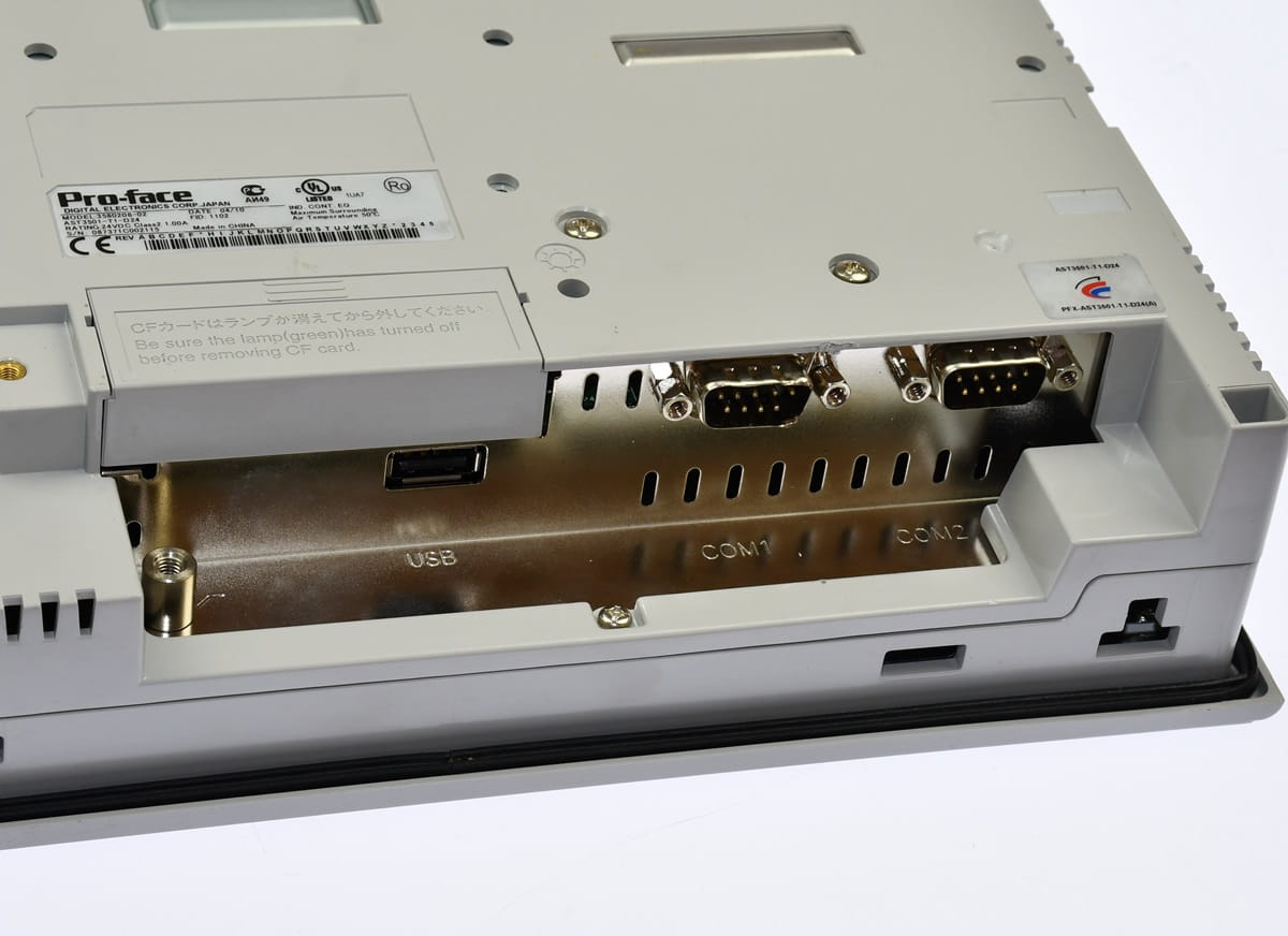 Używany, całkowicie sprawny element o symbolu: 3580208-02, AST3501-T1-D24, produkt firmy PRO-FACE. Duży - 10,4'', kolorowy panel dotykowy HMI. Zdemontowany ze sprawnej maszyny produkującej elektronikę w pomieszczeniu Clean-room. Posiada jedno wgniecenie obudowy oraz zgięte nieznacznie złącze COM1 - oba te mankamenty zaznaczyliśmy na zdjęciach Nr 4 i 6. Po za tym obraz idealny, działanie dotyku idealne.