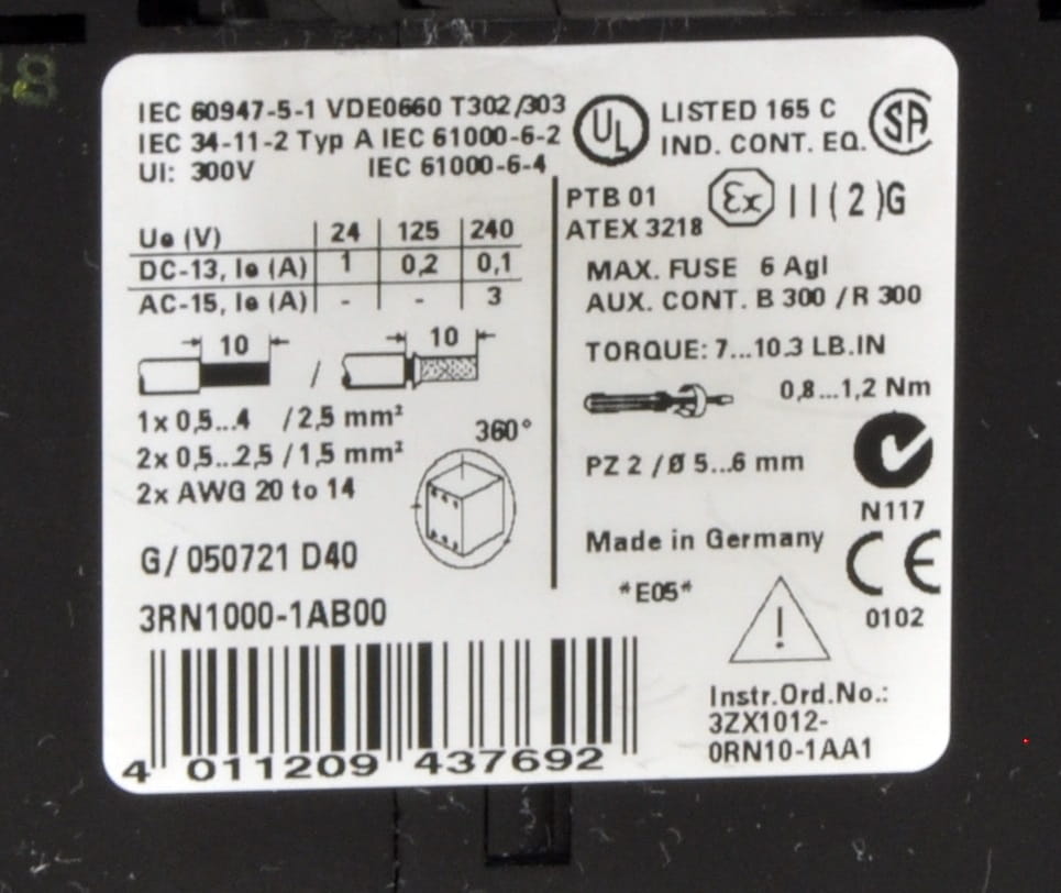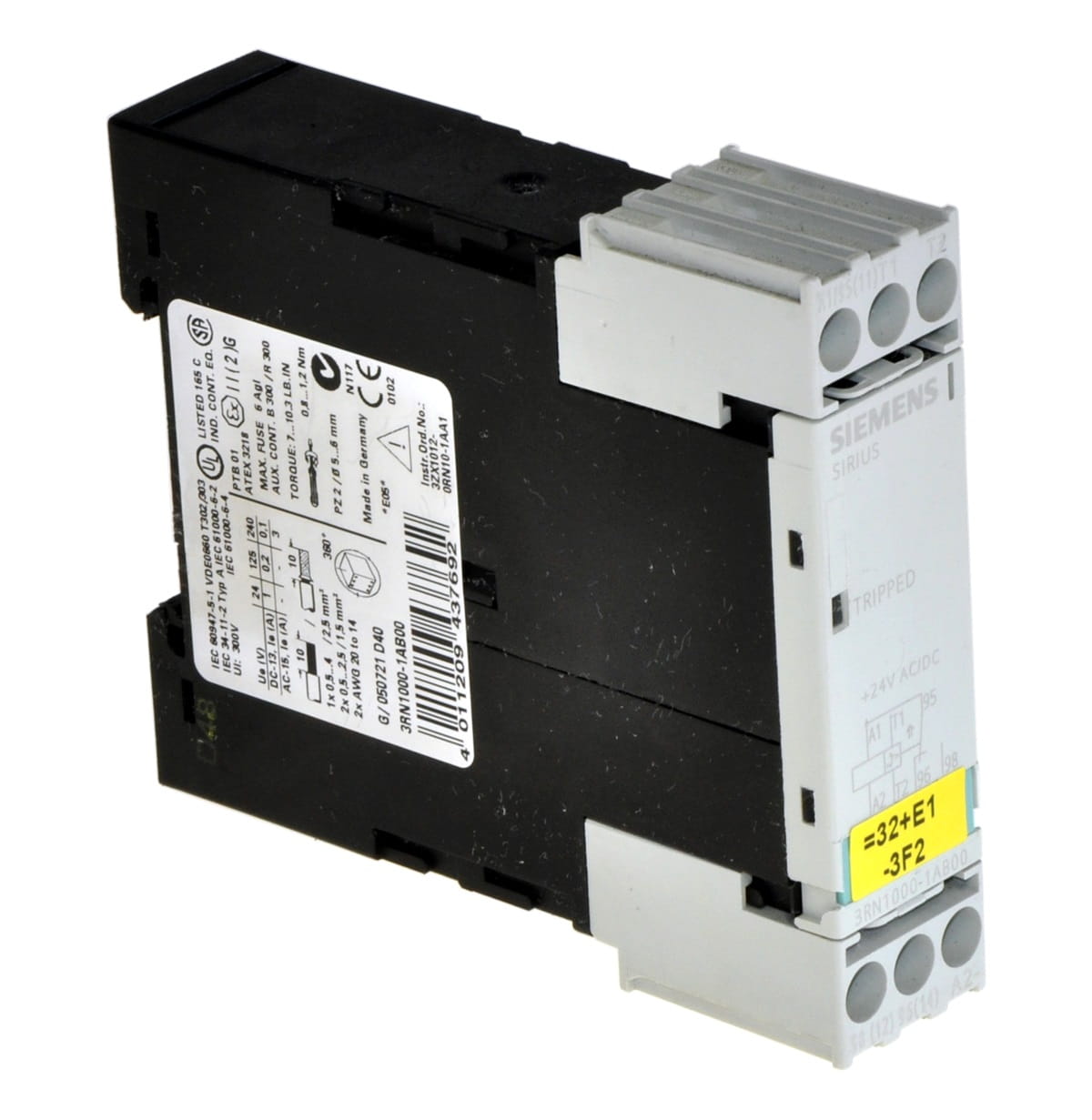 Używany, całkowicie sprawny Przekaźnik monitorujący zabezpieczenia termistorowego silnika, Uz 24 V AC/DC, styki SPDT. Produkt renomowanej firmy Siemens, jego symbol: 3RN1000-1AB00. Monitoruje temperaturę uzwojeń silnika, wymaga wbudowanego w silnik termistora, w razie przegrzania zmienia stan wyjścia, co może poinformować automatykę o konieczności zmniejszenia obciążenia lub wyłączenia silnika.