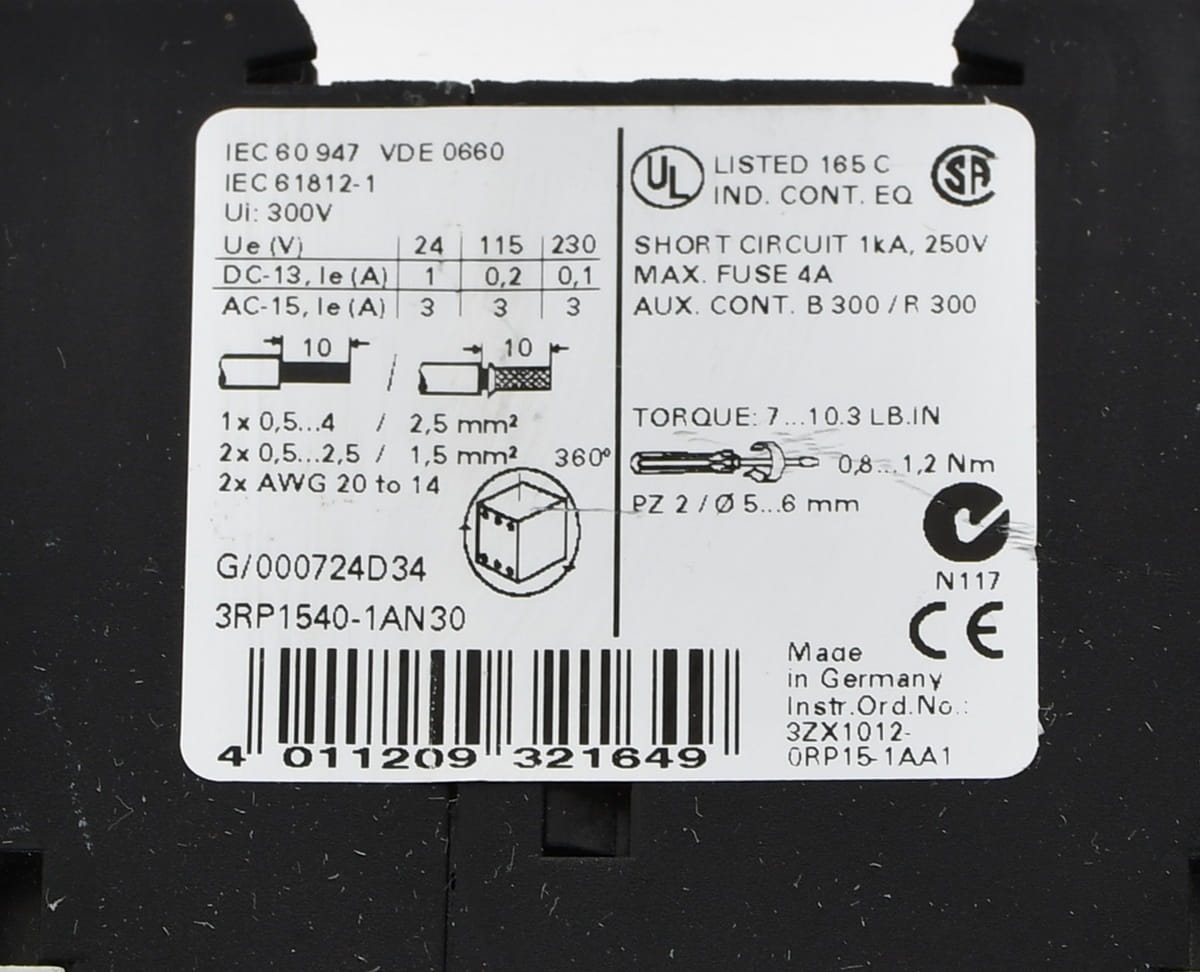 Używany, całkowicie sprawny element o oznaczeniu: 3RP1540-1AN30 produkt firmy Siemens. Przekaźnik czasowy w funkcji OFF-DELAY, nastawa czasu w 7 zakresach 1-100s. Sterowanie AC.DC 200...240V. Pochodzi z demontażu całkowicie sprawnych maszyn przemysłowych.