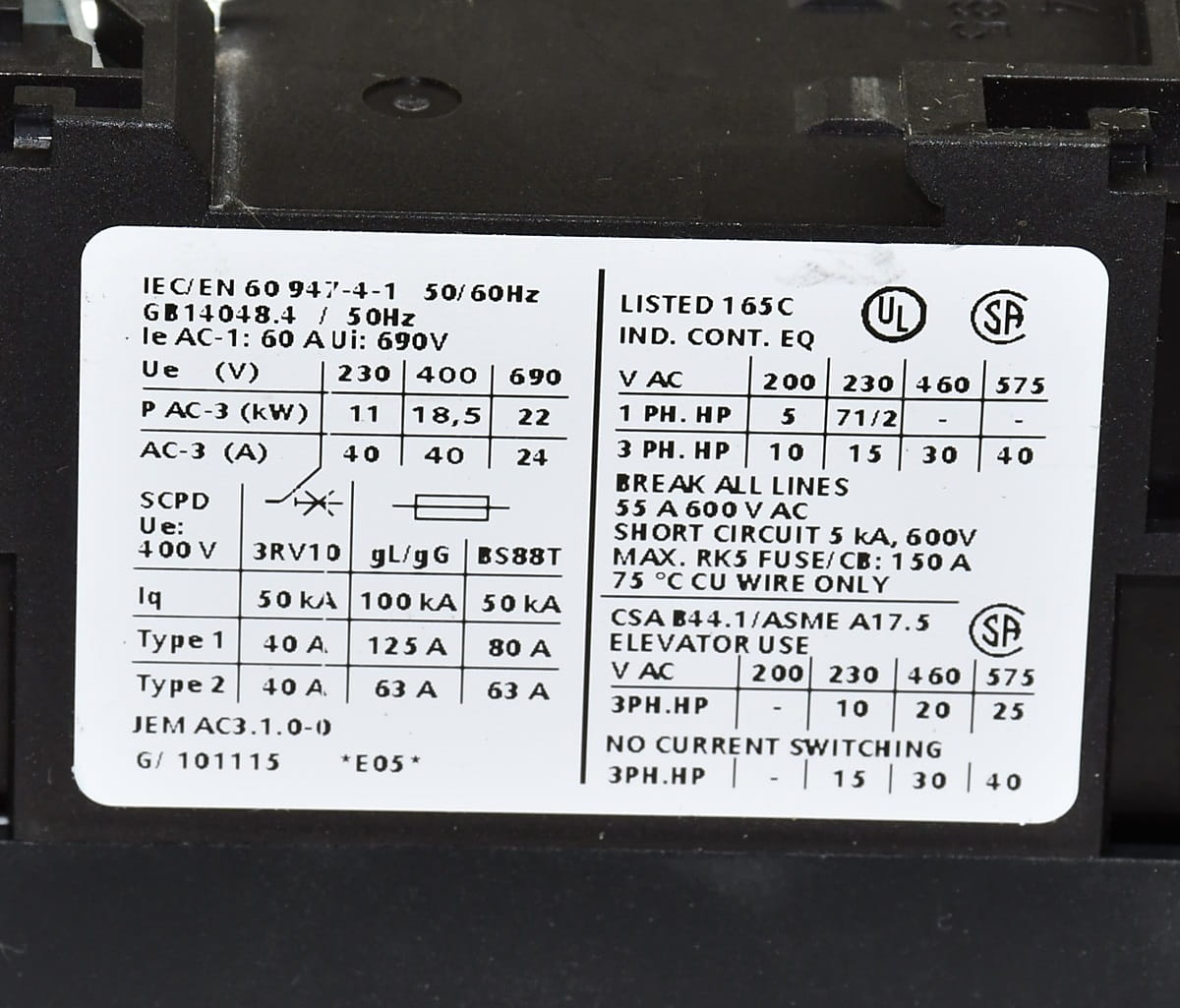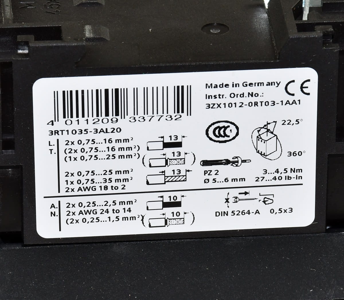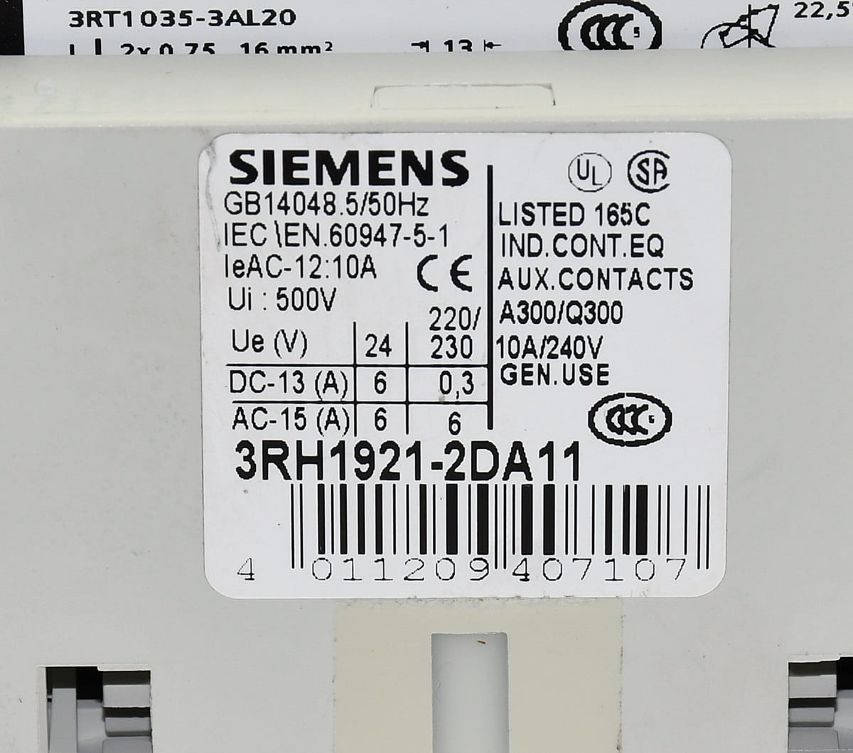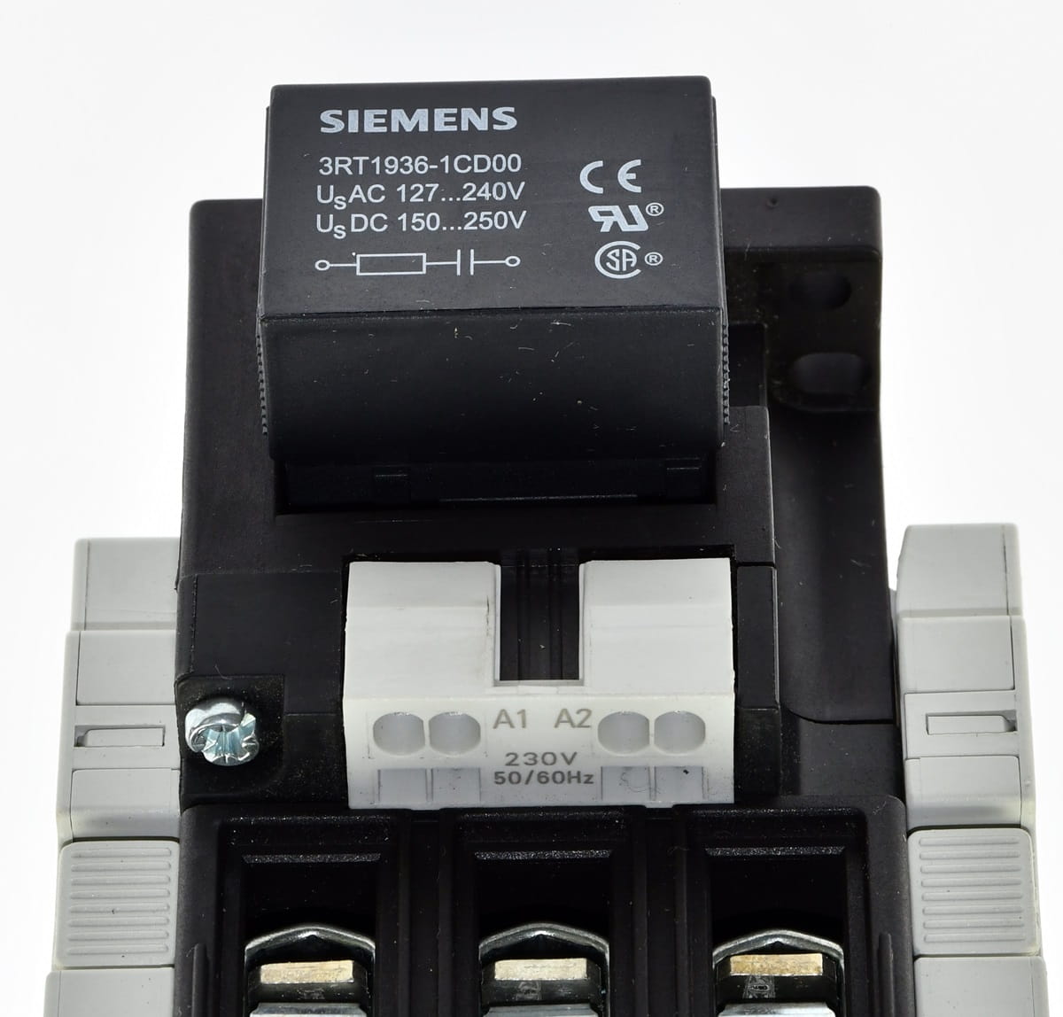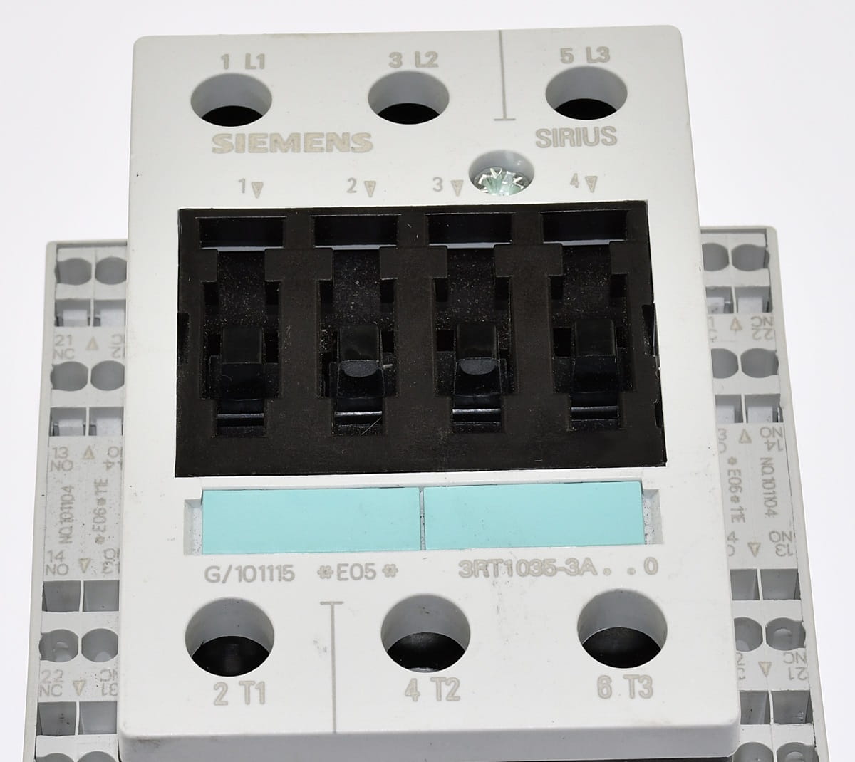 Używany, całkowicie sprawny i w idealnym stanie element o symbolu: 3RT1035-3AL20, stycznik trójfazowy renomowanej firmy Siemens, moc przełączeniowa 18,5kW, Cewka sterowana napięciem przemiennym 230V. W zestawie dwa styki pomocnicze o symbolu: 3RH1921-2DA11 oraz zabezpieczenie przeciwprzepięciowe cewki: 3RT1936-1CD00. Styki są w idealnym stanie, brak zużycia.
