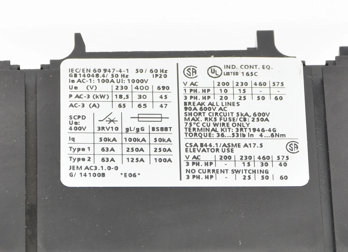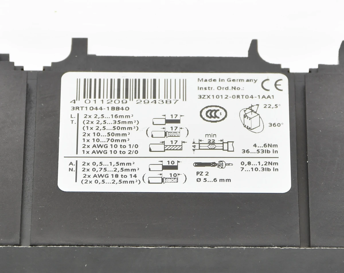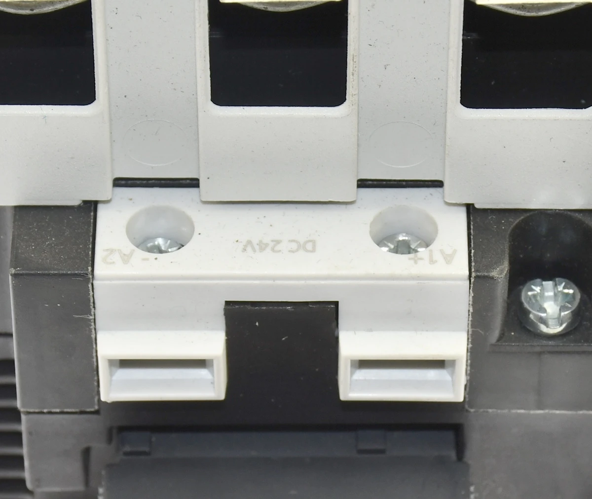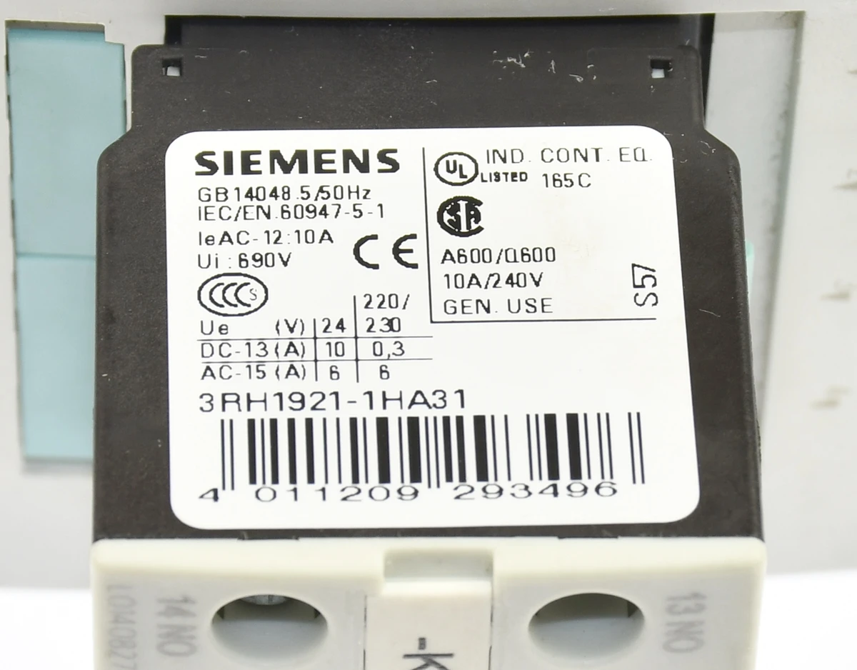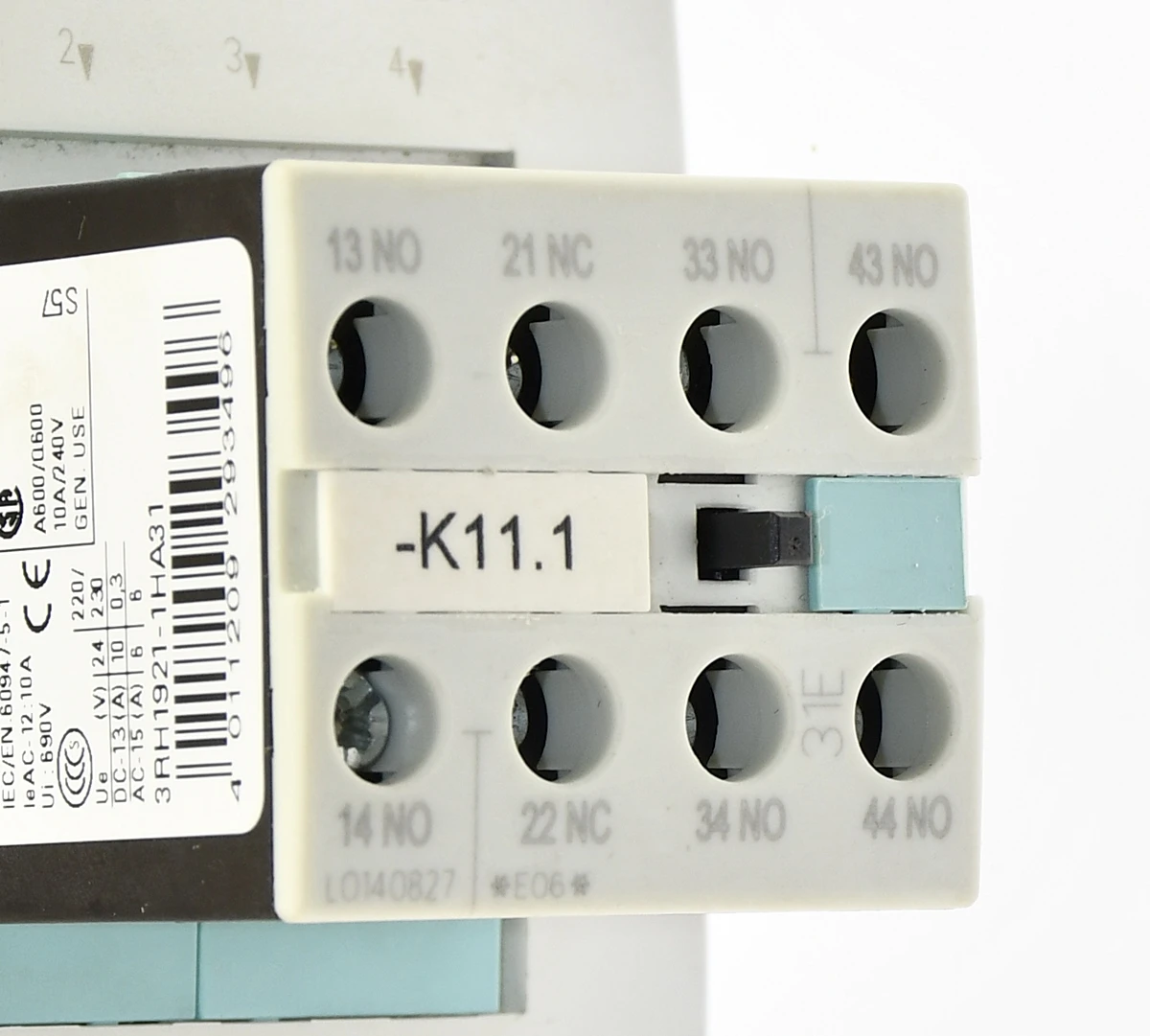 Używany, całkowicie sprawny i w idealnym stanie element o symbolu: 3RT1044-1BB40, stycznik trójfazowy renomowanej firmy Siemens, moc przełączeniowa 30kW, Cewka sterowana napięciem stałym 24V. W zestawie blok styków pomocniczy 3x NO i 1x NC o symbolu: 3RH1921-1HA31 również od Siemens. Jest też dławik przepięć o oznaczeniu: 3RT1936-1CB00 też od Siemens. Stan styków bardzo dobry, bez śladów zużycia.