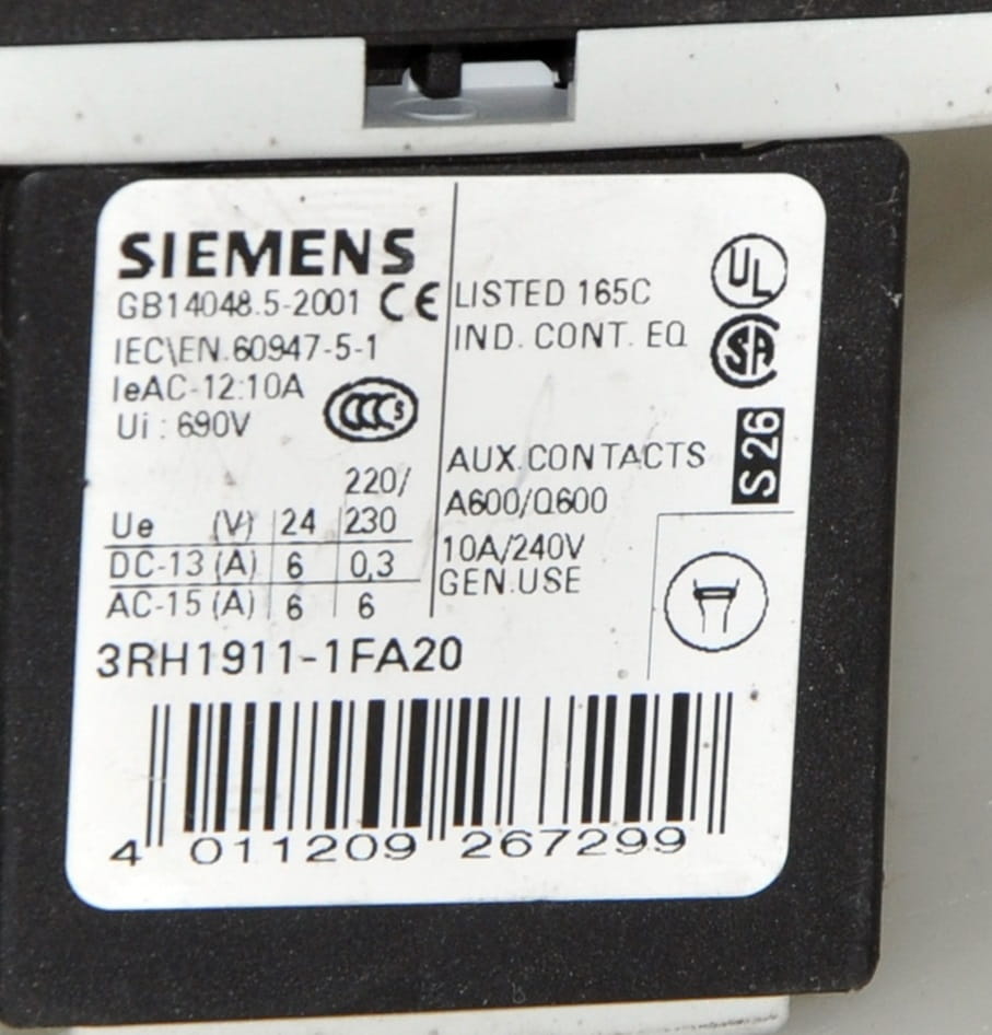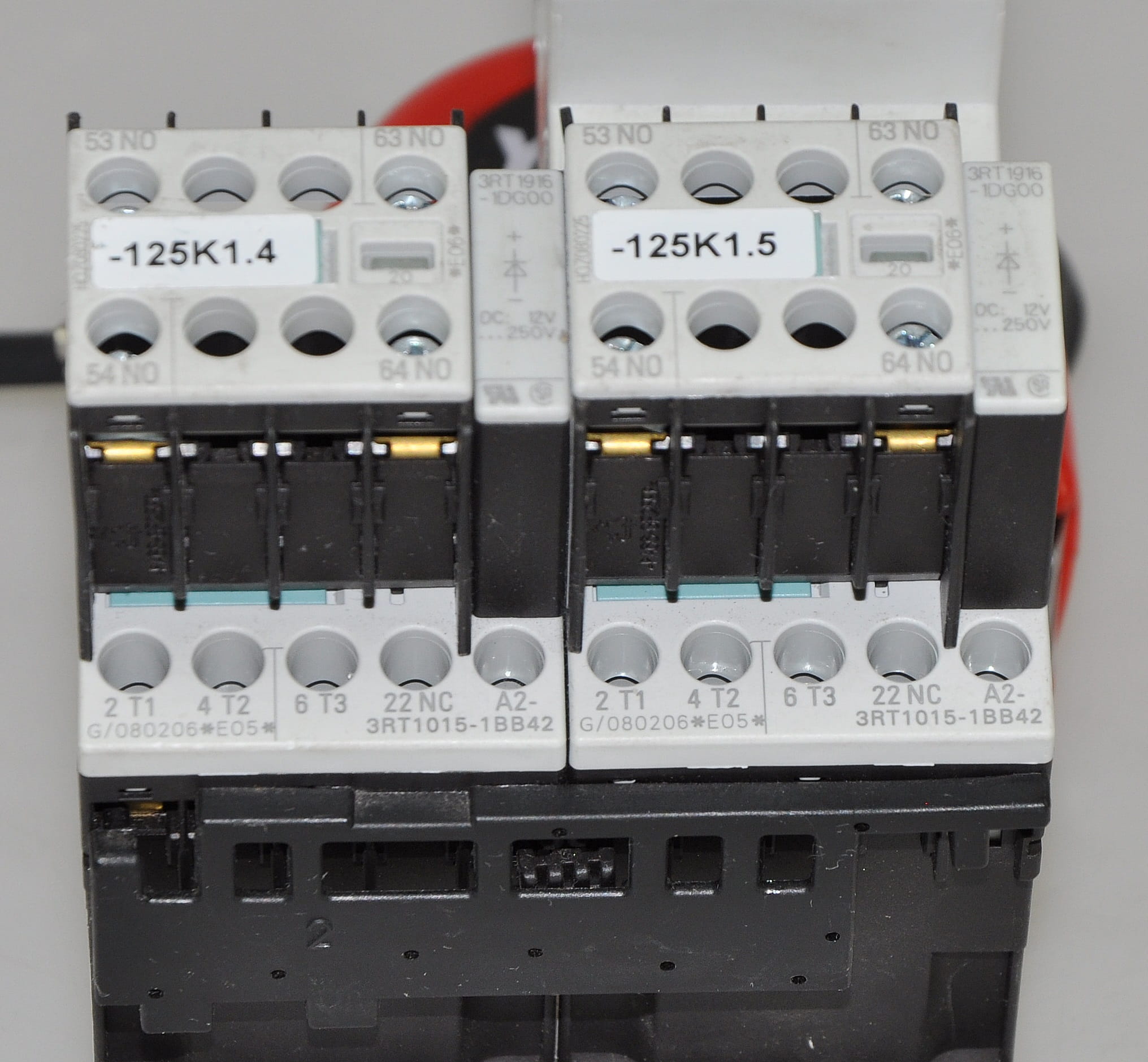 Używany wyłącznik termiczny silnika trójfazowego o symbolu: 3RV1011-0HA10 w zestawie z dwoma stycznikami o symbolu: 3RT1015-1BB42. Wyłącznik termiczny posiada nastawę wyzwalania w zakresie 0,55 do 0,8A. Styczniki posiadają cewki sterowane napięciem stałym 24V, posiadają też zestawy styków dodatkowych o oznaczeniu: 3RH1911-1FA20 oraz gasiki 3RT1916-1DG00.