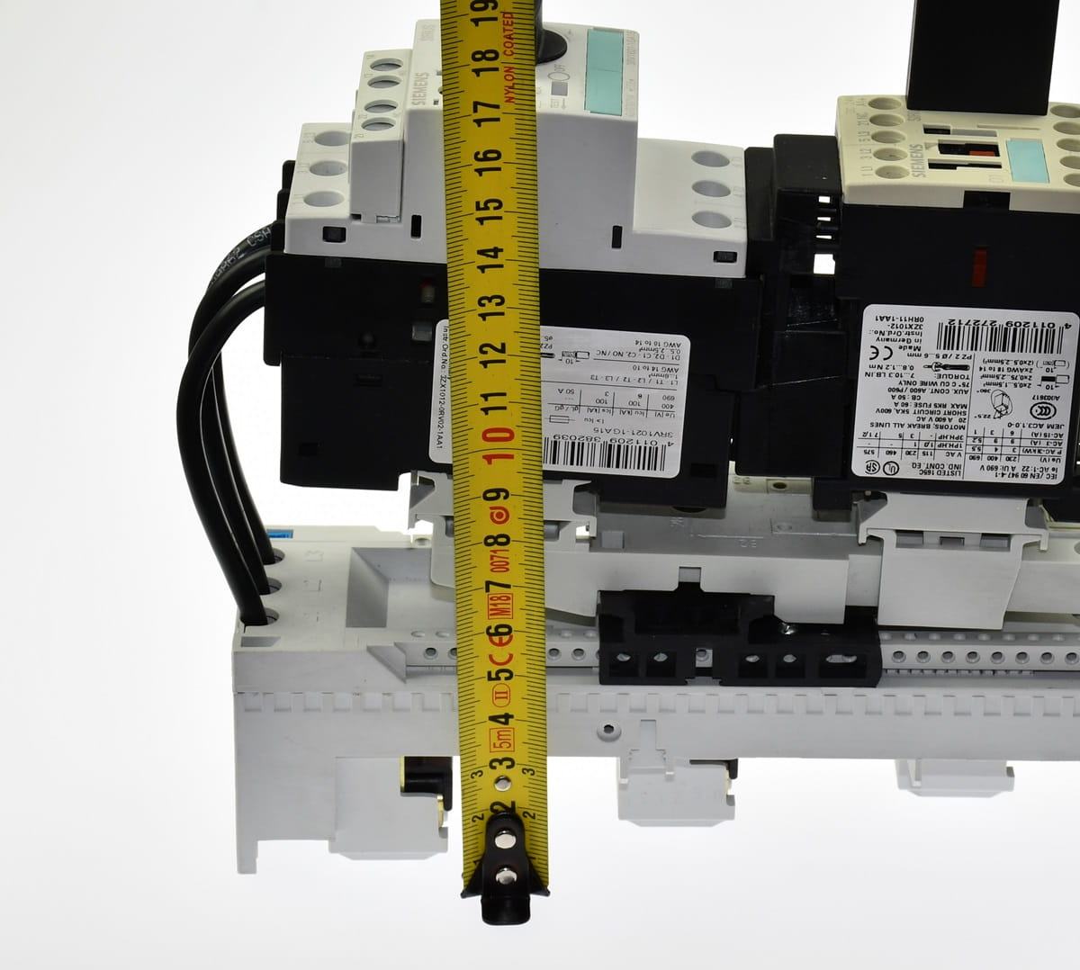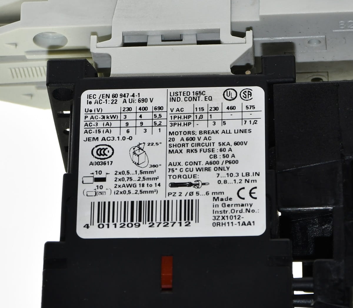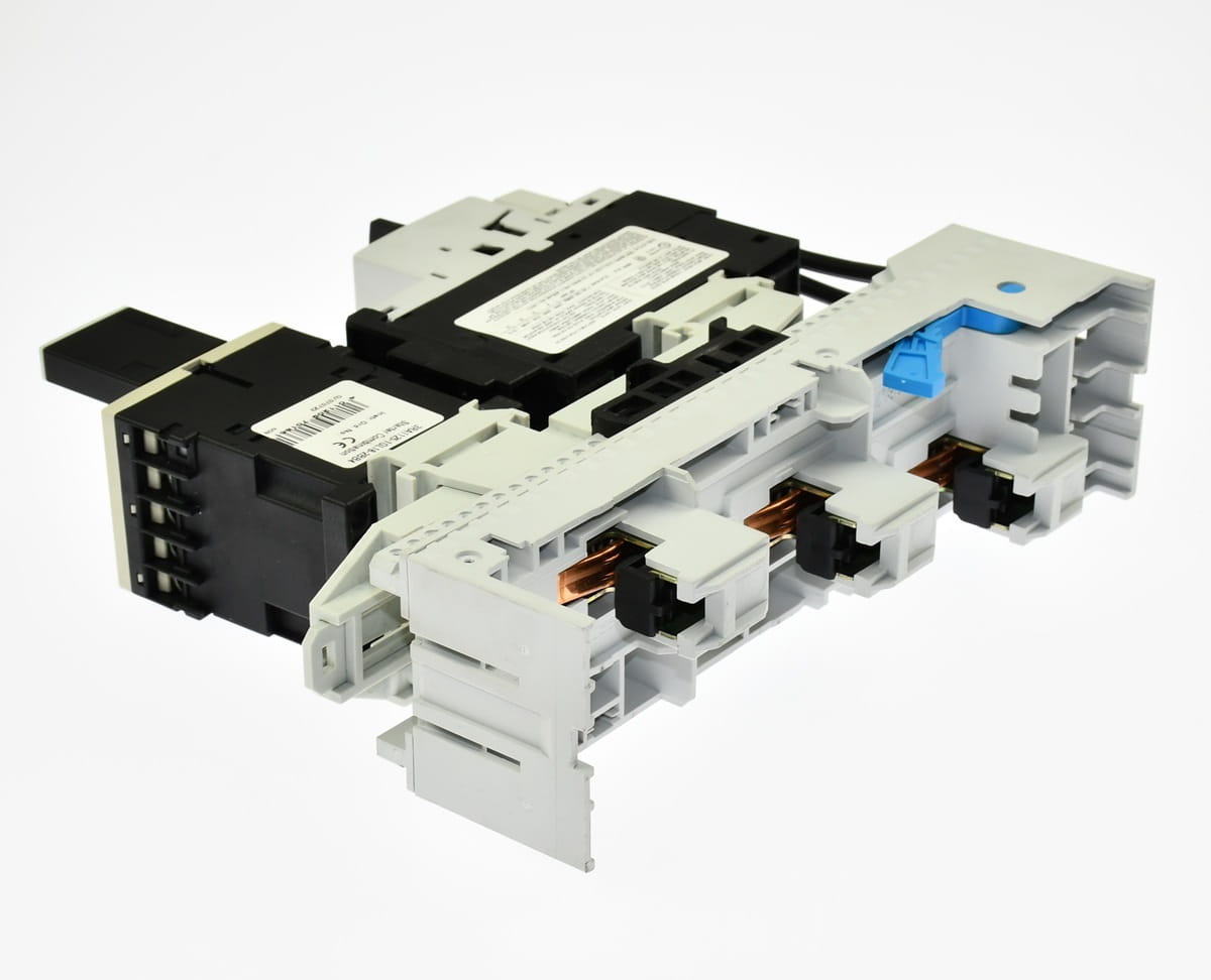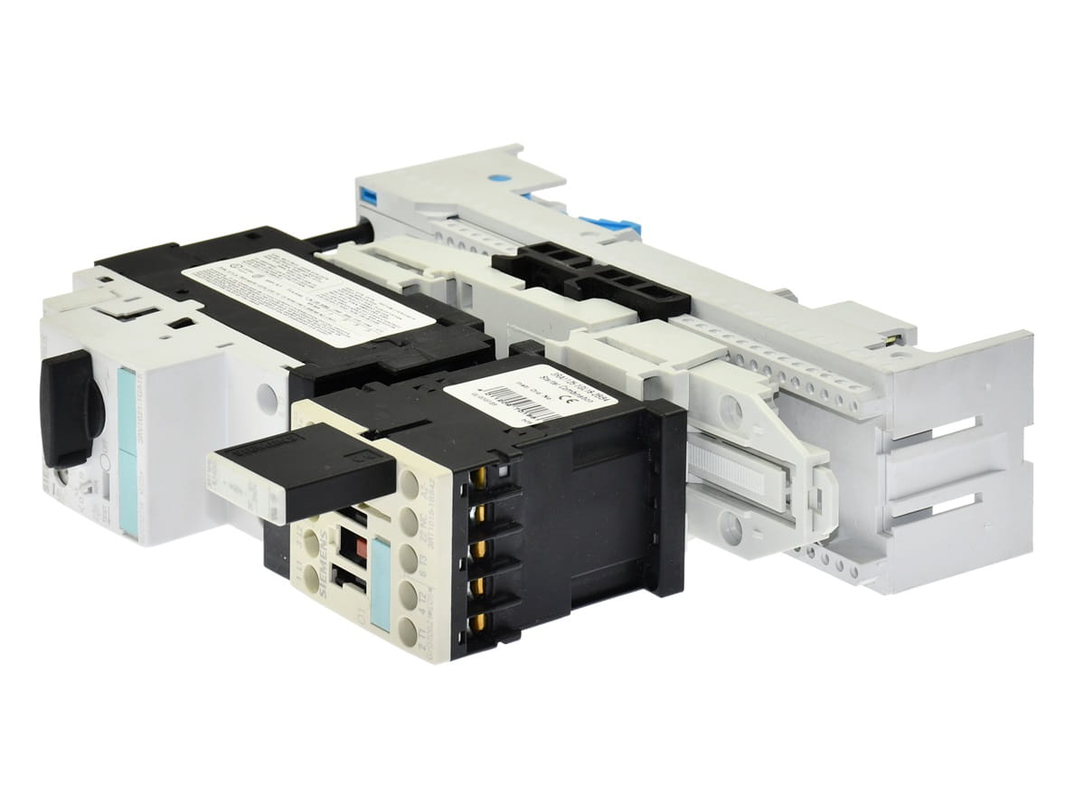 Używany zestaw z załączonych zdjęć. Składa się z wyłącznika silnikowego o symbolu: 3RV1021-1GA15, produkt firmy Siemens, Stycznika: 3RT1016-1BB42 sterowanego napięciem DC24V oraz szyny podłączeniowej firmy Wohner, Art.Nr. 32 442. Zakres nastawy zabezpieczenia 4,5 do 6,3A. Przy styczniku jest jeszcze gasik 3RT1916-1EH00.