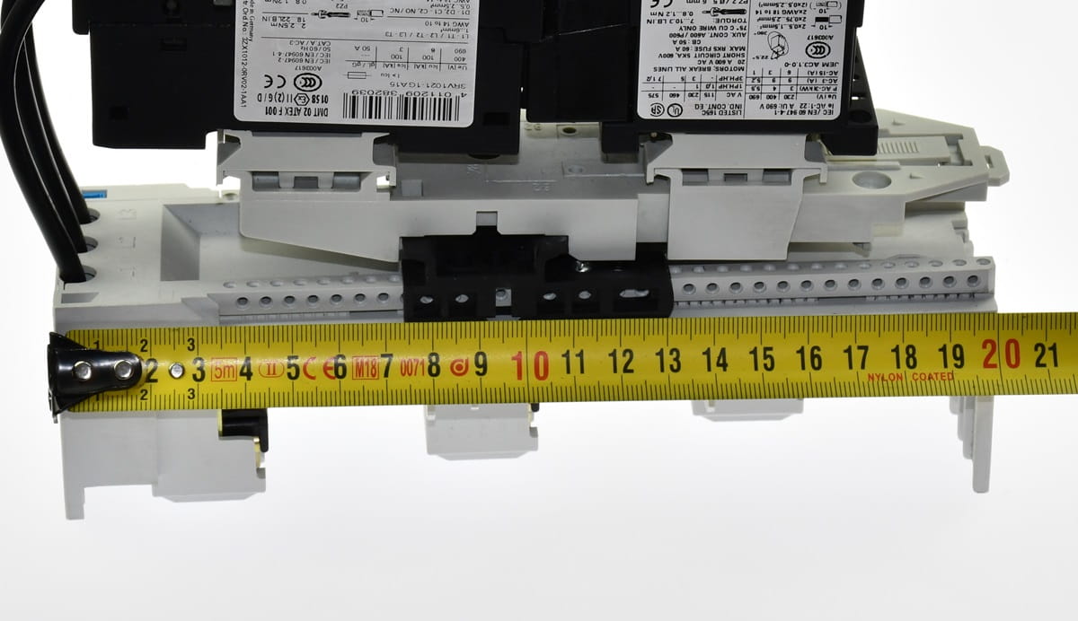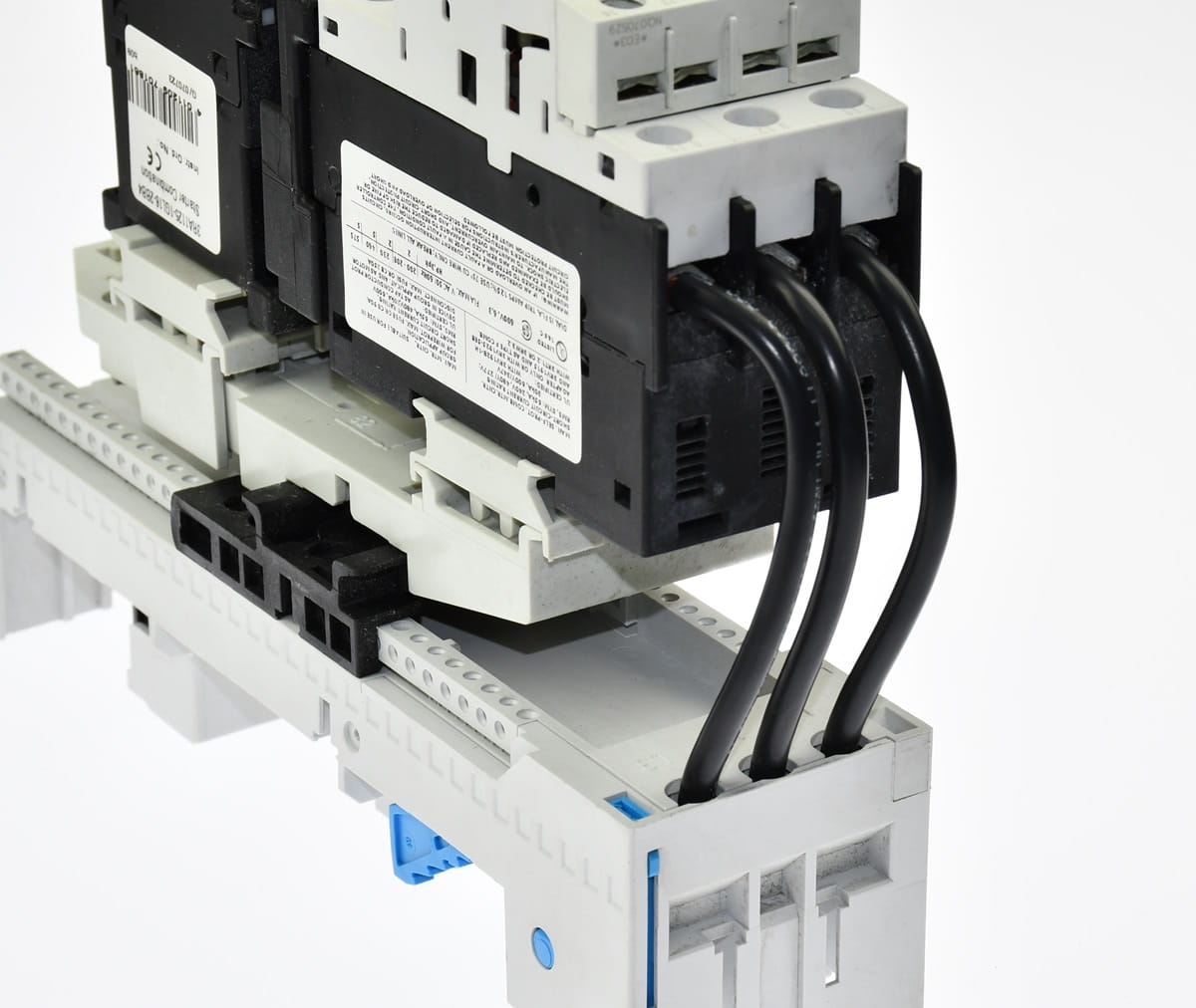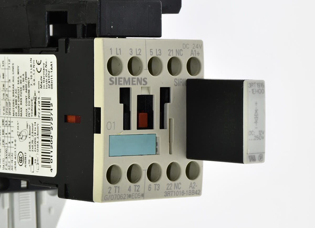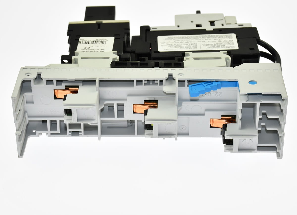 Używany zestaw z załączonych zdjęć. Składa się z wyłącznika silnikowego o symbolu: 3RV1021-1GA15, produkt firmy Siemens, Stycznika: 3RT1016-1BB42 sterowanego napięciem DC24V oraz szyny podłączeniowej firmy Wohner, Art.Nr. 32 442. Zakres nastawy zabezpieczenia 4,5 do 6,3A. Przy styczniku jest jeszcze gasik 3RT1916-1EH00.