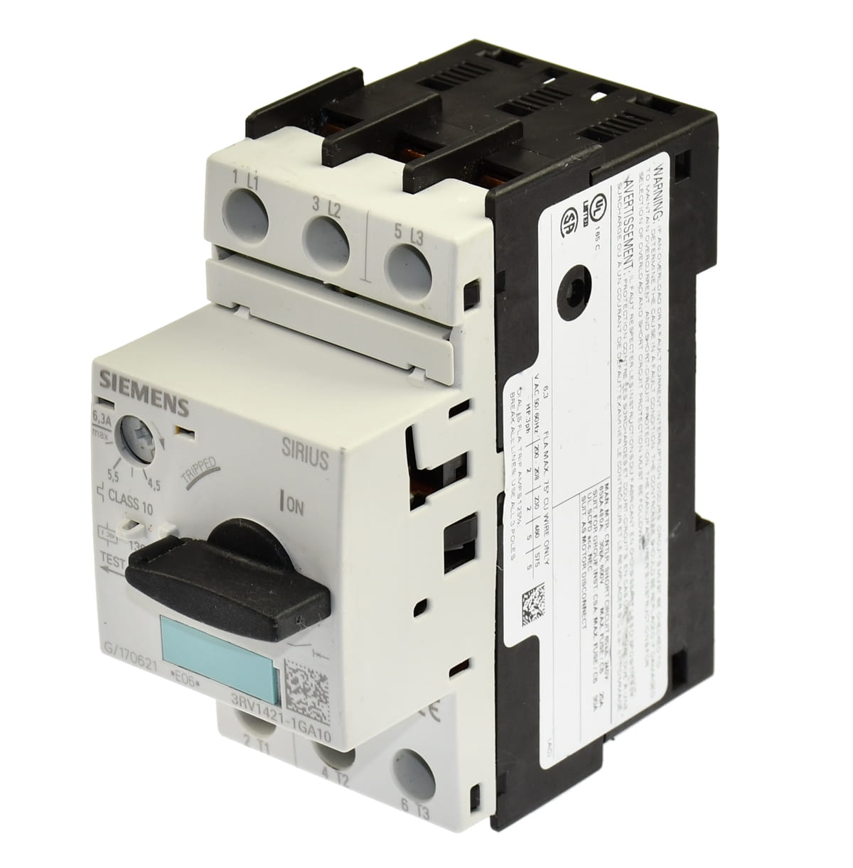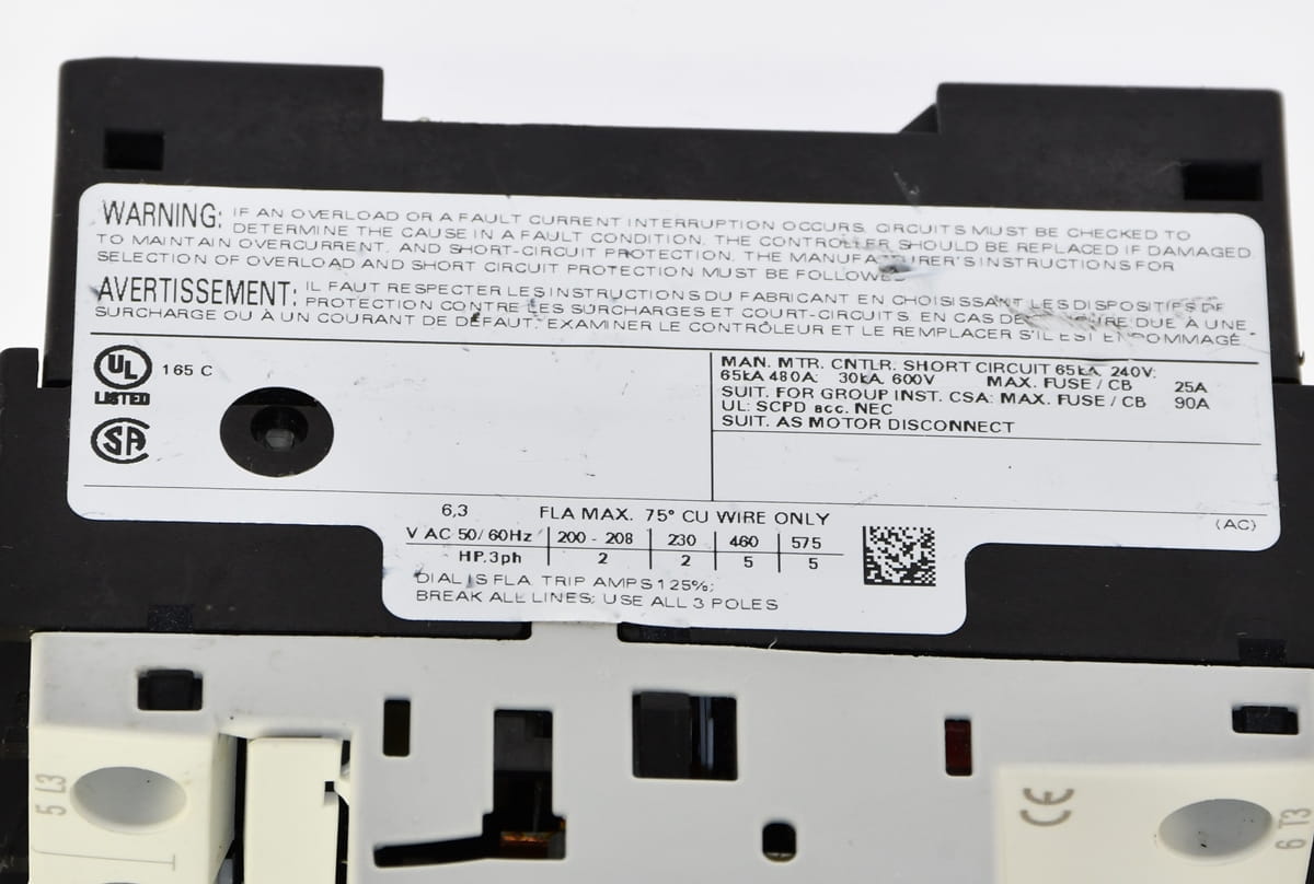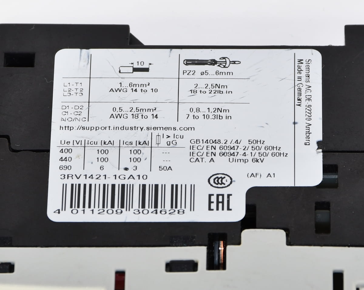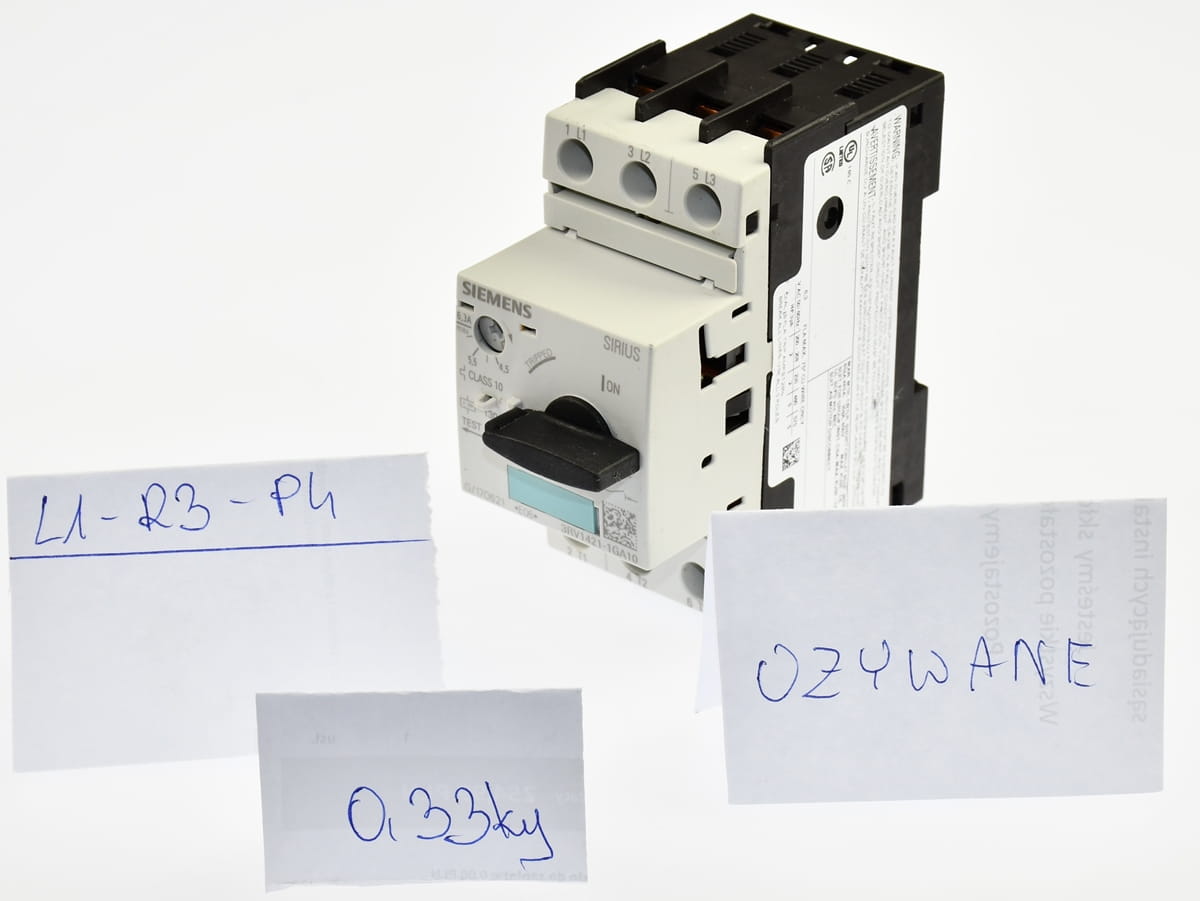 Używany trójfazowy wyłącznik silnikowy z zabezpieczeniem termicznym o nastawie prądu od 4,5 do 6,3A. Produkt firmy Siemens o symbolu: 3RV1421-1GA10 Pochodzi z demontażu całkowicie sprawnych maszyn przemysłowych.