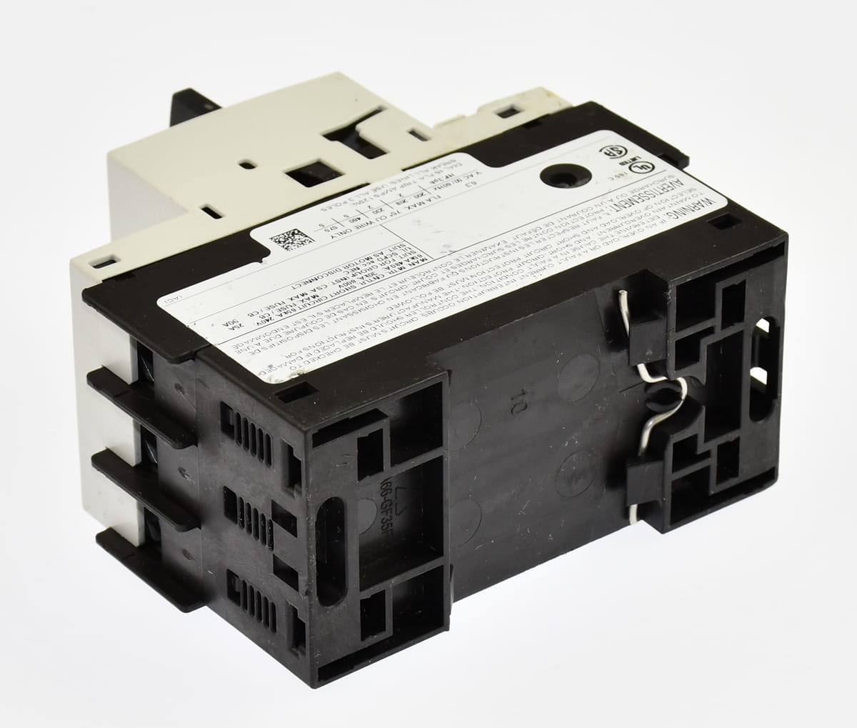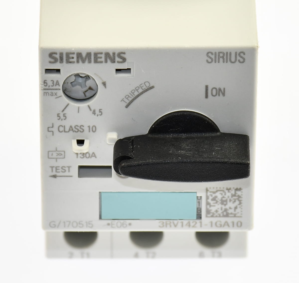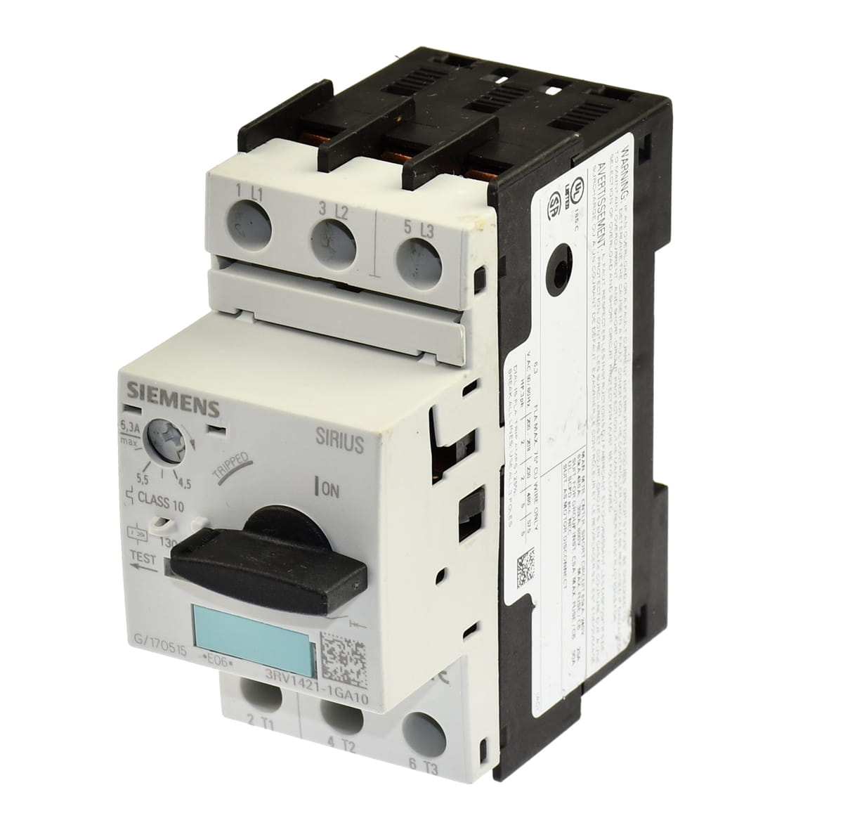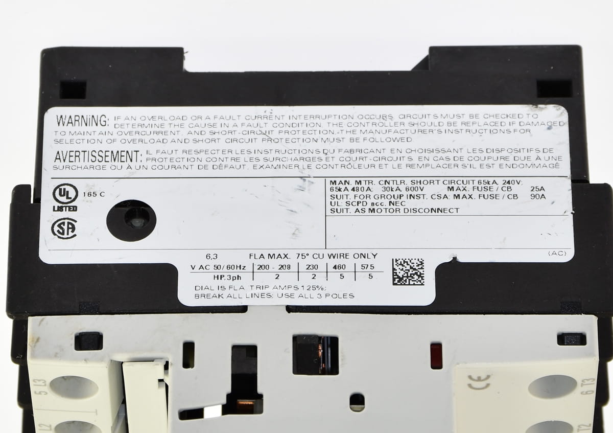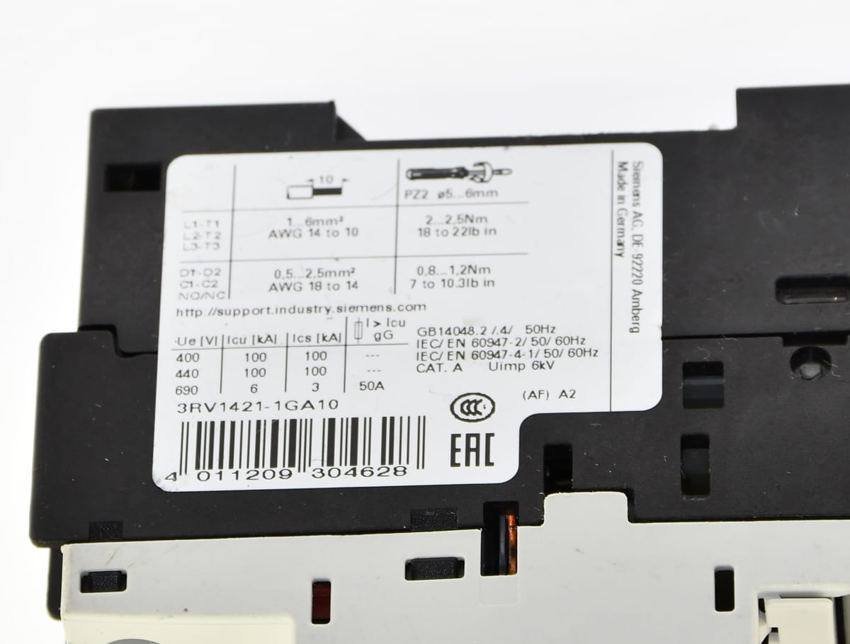 Używany trójfazowy wyłącznik silnikowy z zabezpieczeniem termicznym o nastawie prądu od 4,5 do 6,3A. Produkt firmy Siemens o symbolu: 3RV1421-1GA10 Pochodzi z demontażu całkowicie sprawnych maszyn przemysłowych.
