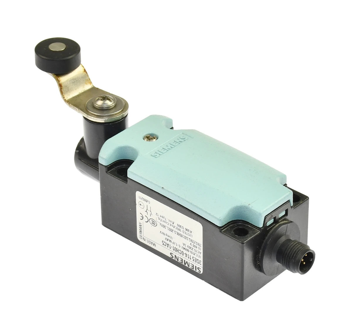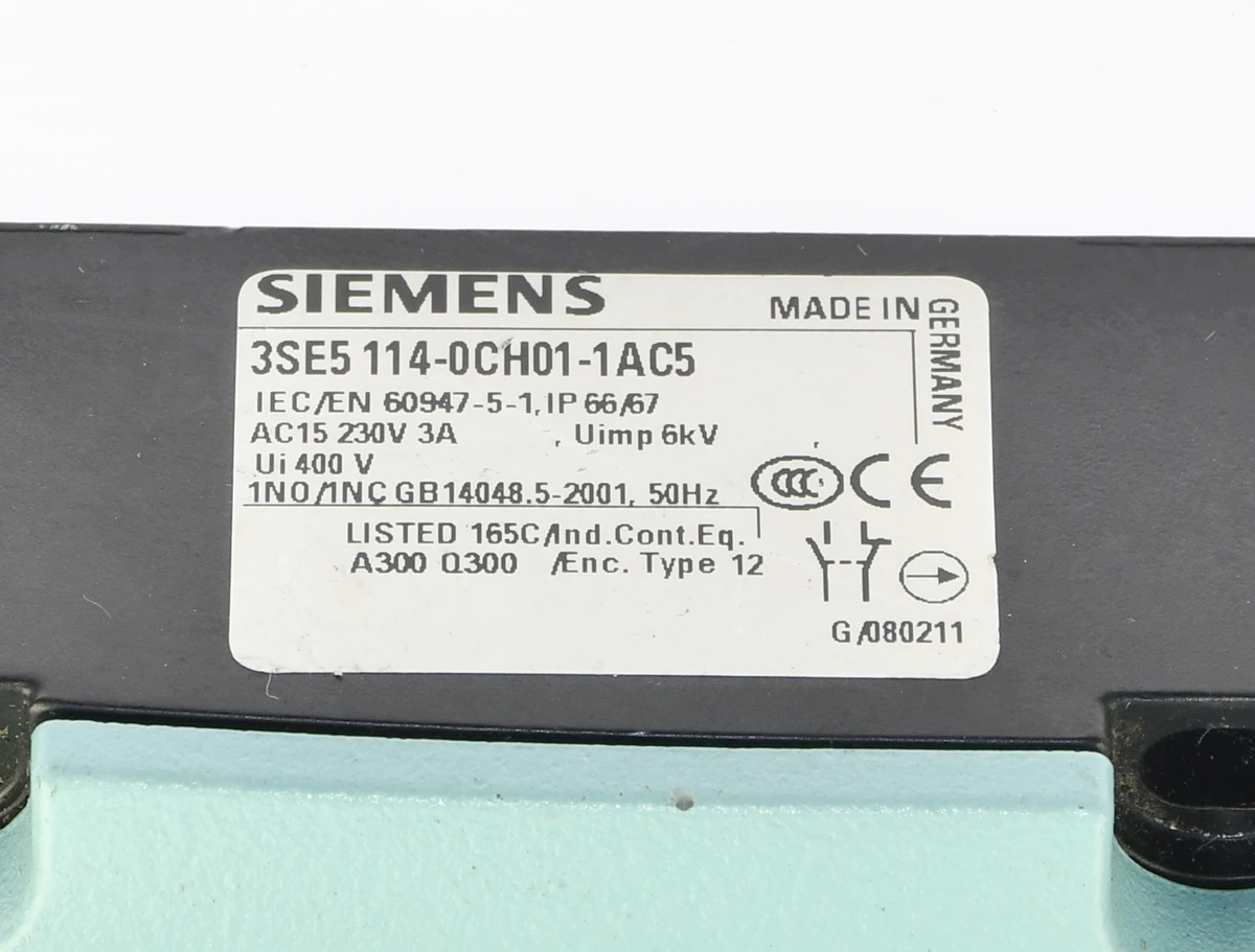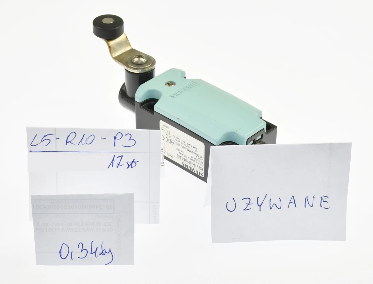 Używany, całkowicie sprawny element o oznaczeniu: 3SE5 114-0CH01-1AC5, produkt firmy: Siemens. Wyłącznik krańcowy dźwigniowy z rolką. Podłączenie elektryczne: wtyczka M12, stopień ochrony: IP67. Wyjście 1 NO/1 NC. Obudowa Metalowa. Napięcie do 125 VAC, prąd do 4A. Pochodzi z demontażu całkowicie sprawnych maszyn przemysłowych, stan bardzo dobry zarówno wizualnie jak i funkcjonalnie.