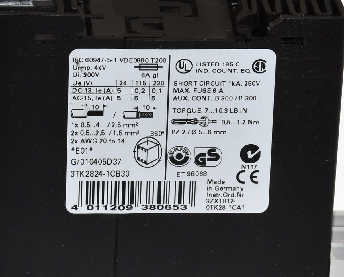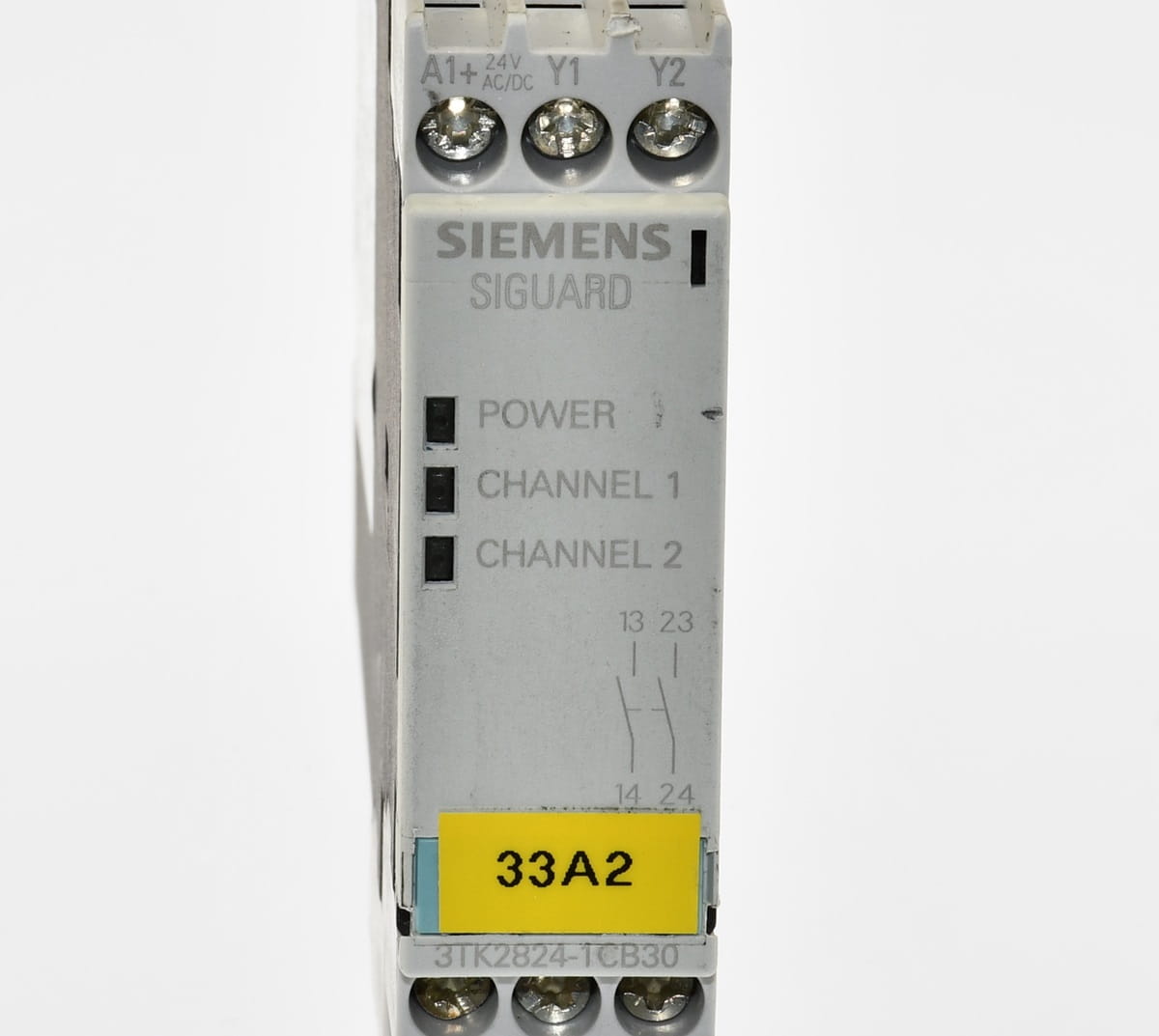 Używany element o oznaczeniu: 3TK2824-1CB30, produkt firmy Siemens. Przekaźnik bezpieczeństwa 2S 24V AC/DC. Pochodzi z demontażu całkowicie sprawnych maszyn przemysłowych.