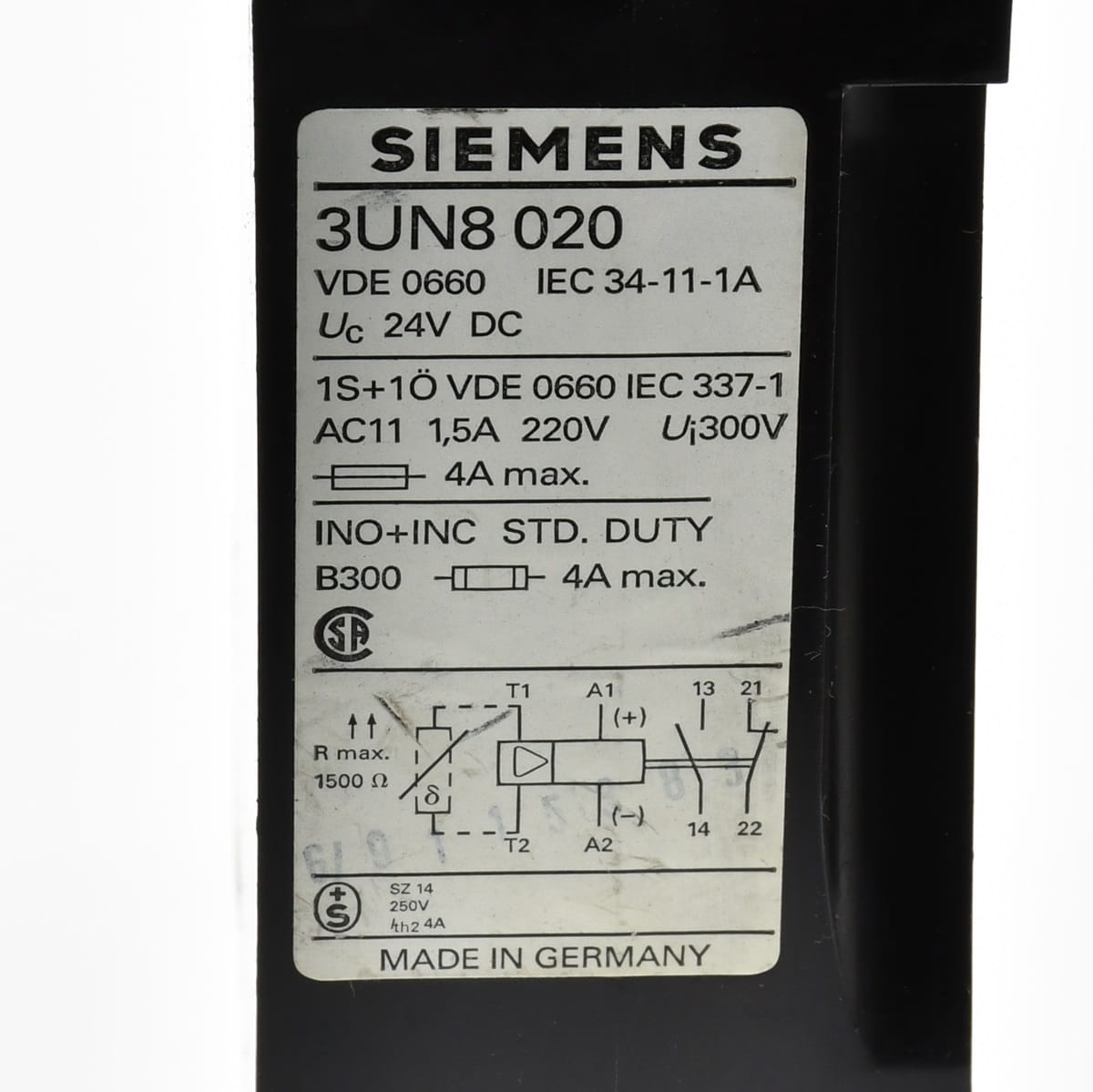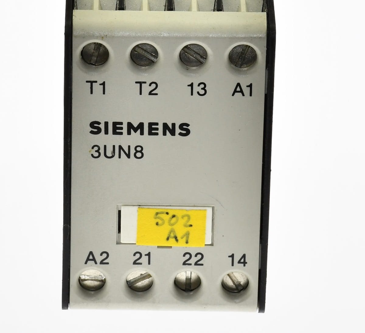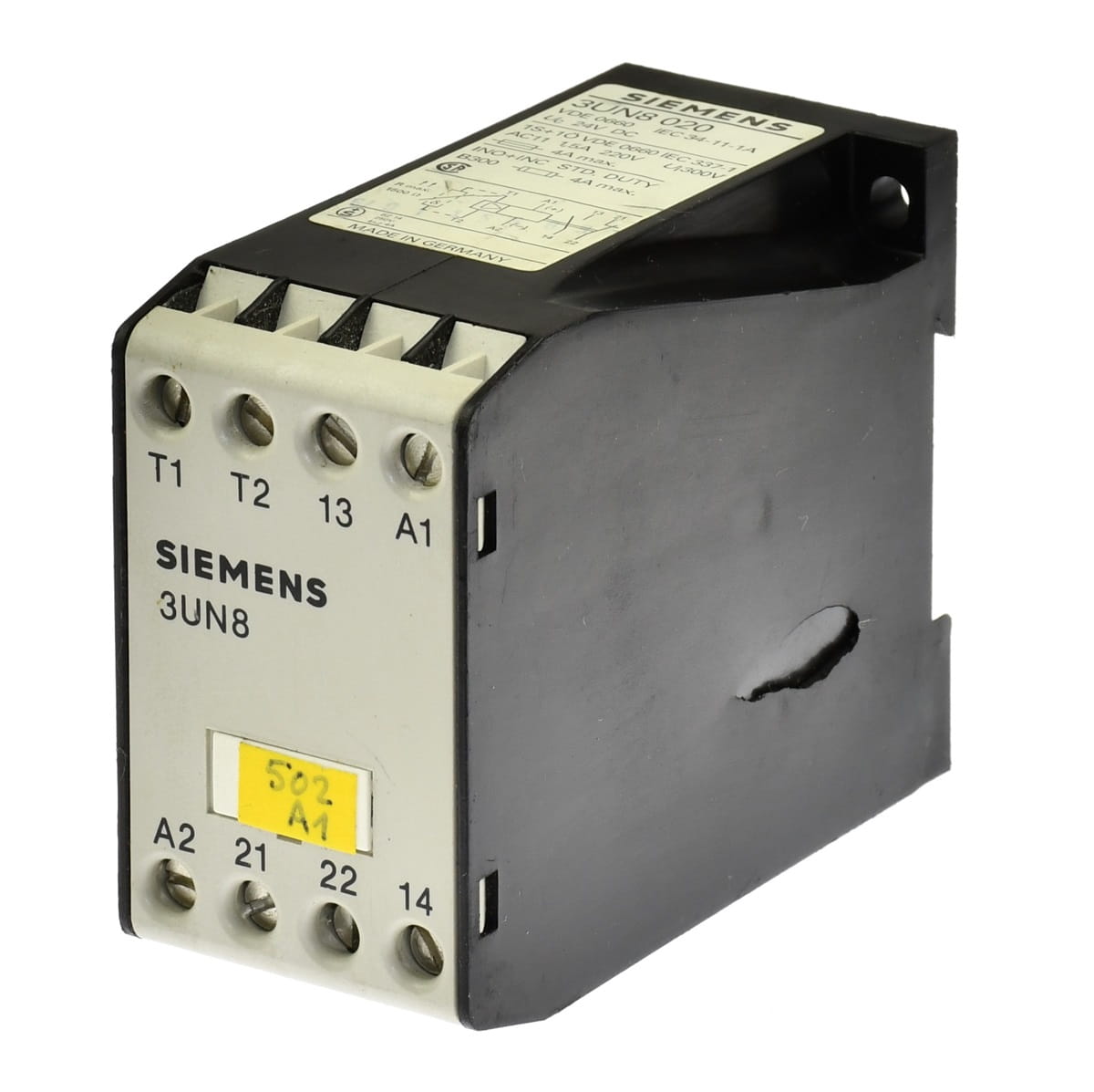 Używany, całkowicie sprawny funkcjonalnie element o oznaczeniu: 3UN8 020, produkt firmy Siemens. Przekaźnik termicznej ochrony silnika elektrycznego. Posiada wgniecenie obudowy, które pokazano na zdjęciu Nr. 4.