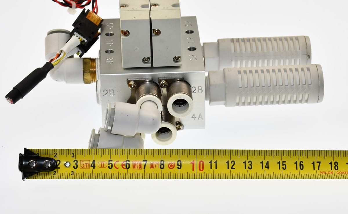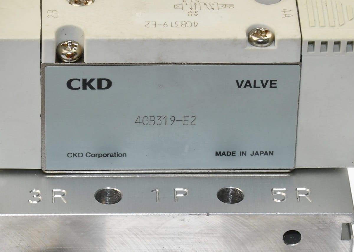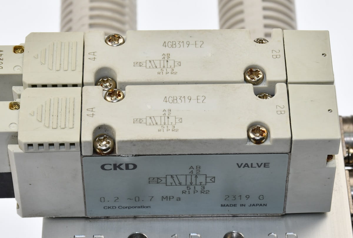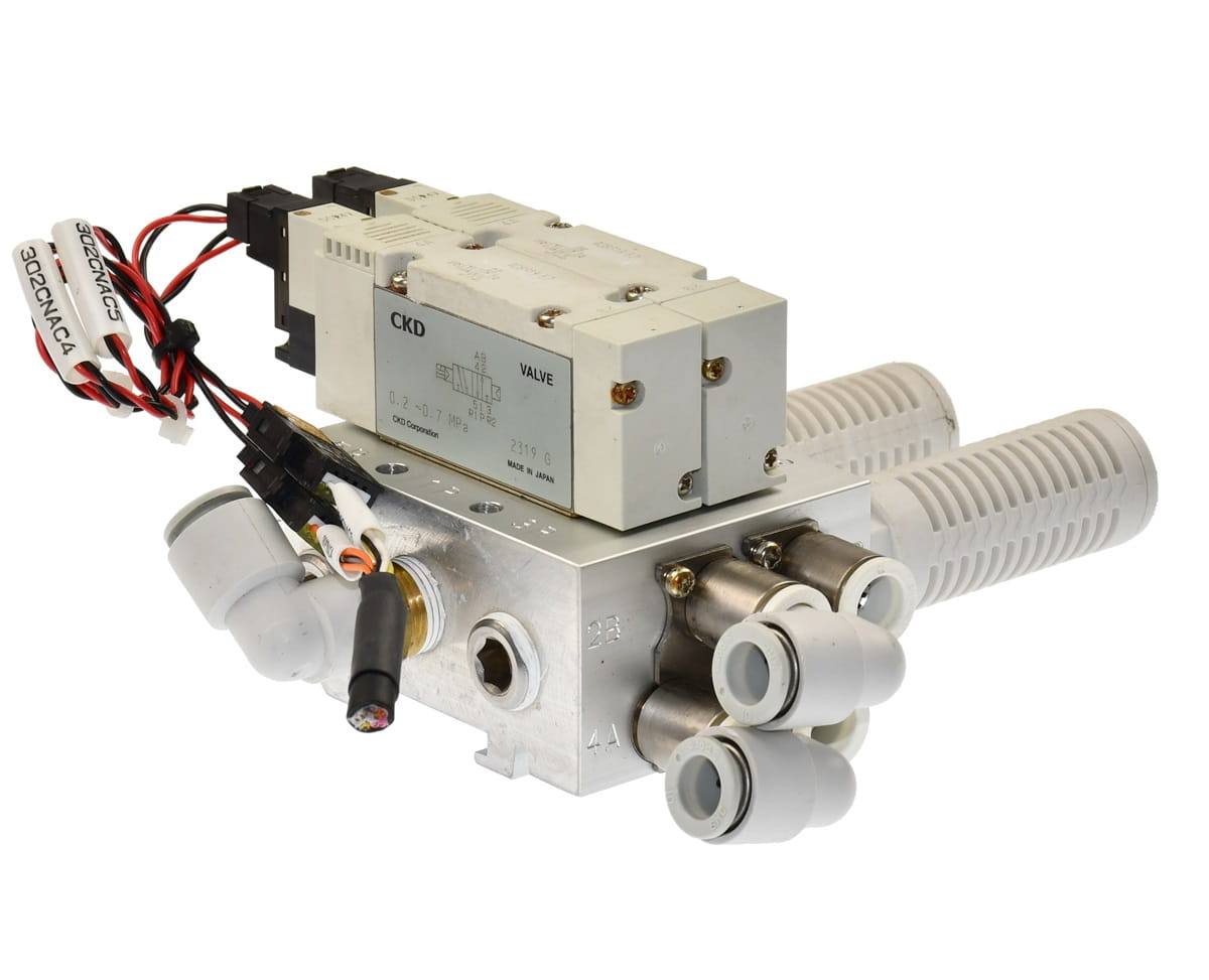 Używana, całkowicie sprawna wyspa zaworowa złożona z sekcji rozdzielających o oznaczeniach: 4GB319-E2 - 2 sztuki. Przeznaczona do sterowania dwoma siłownikami obustronnego działania, W zestawie są wszystkie szybkozłączki, dwa tłumiki spustowe oraz przewody do cewek. Produkt firmy CKD.