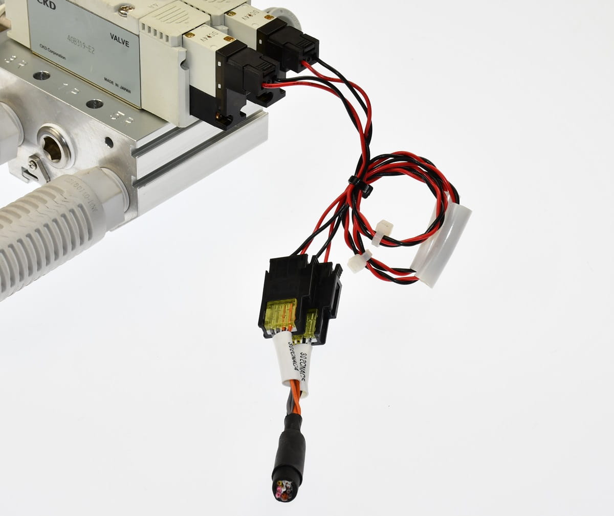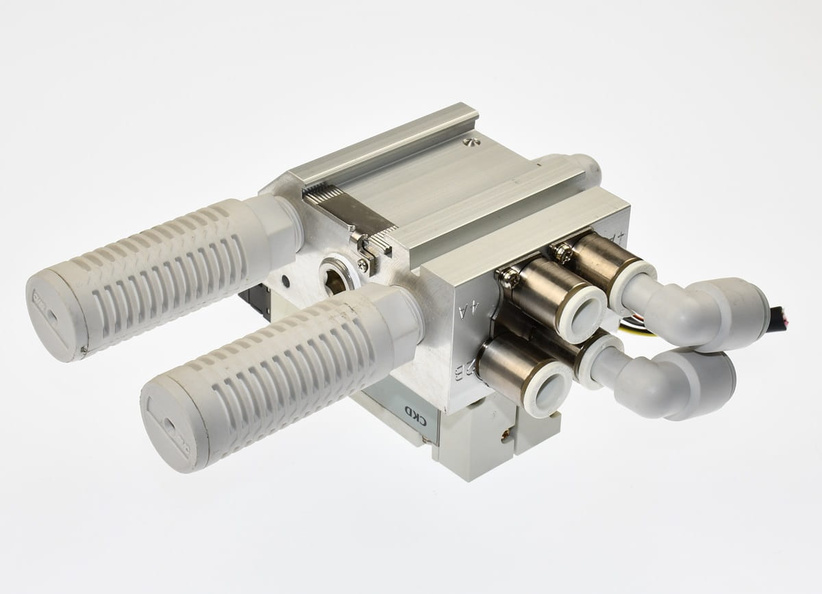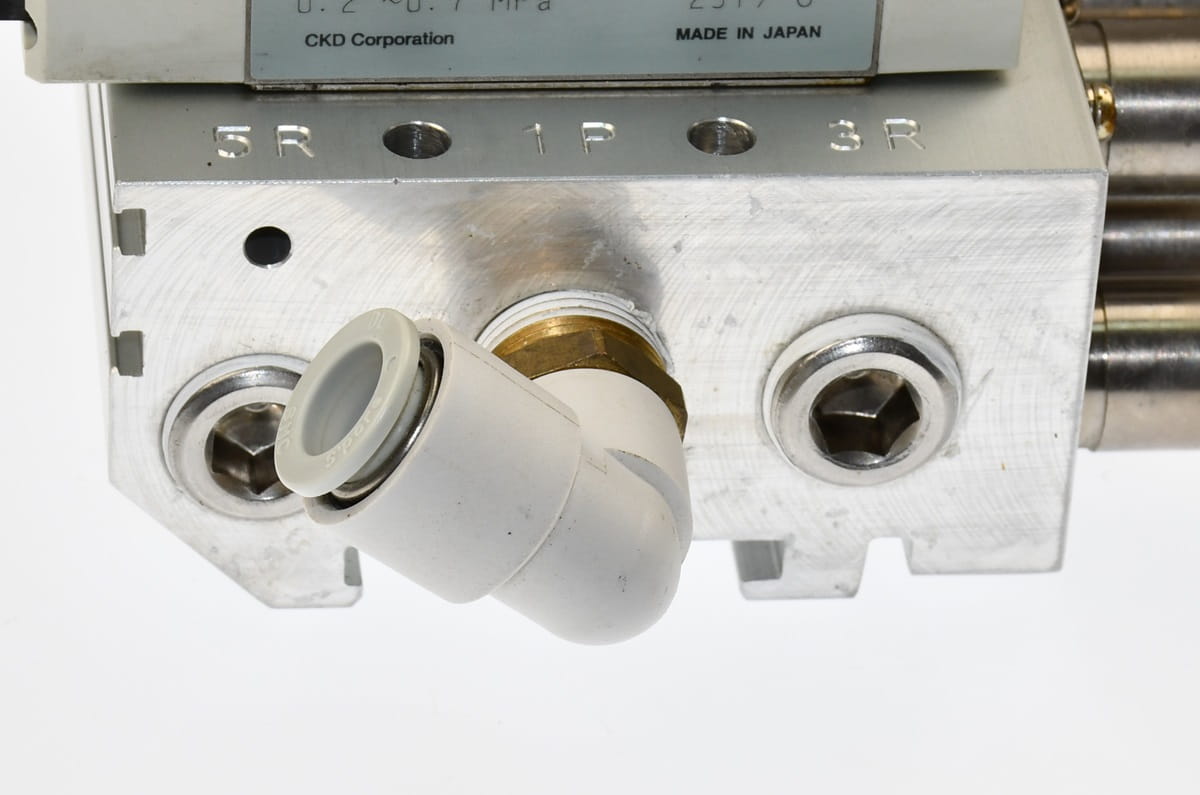 Używana, całkowicie sprawna wyspa zaworowa złożona z sekcji rozdzielających o oznaczeniach: 4GB319-E2 - 2 sztuki. Przeznaczona do sterowania dwoma siłownikami obustronnego działania, W zestawie są wszystkie szybkozłączki, dwa tłumiki spustowe oraz przewody do cewek. Produkt firmy CKD.