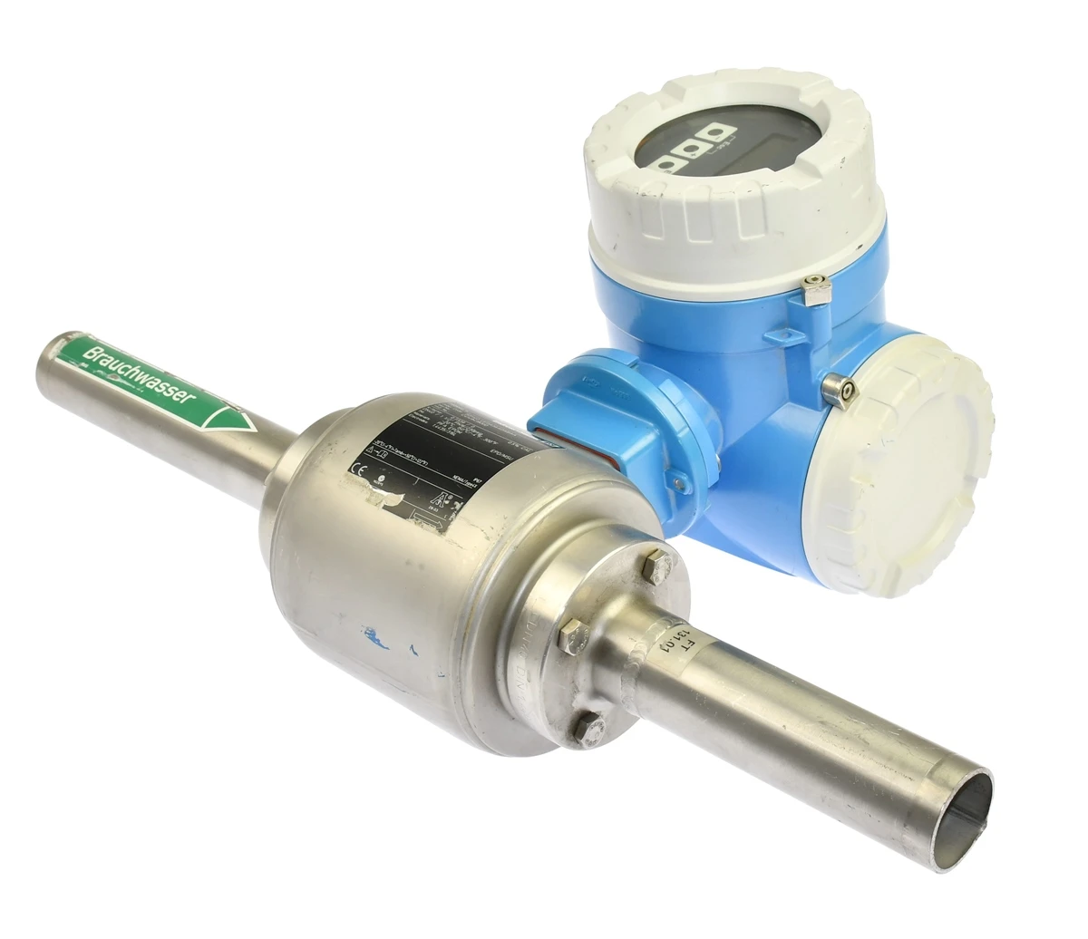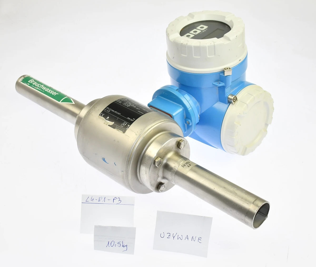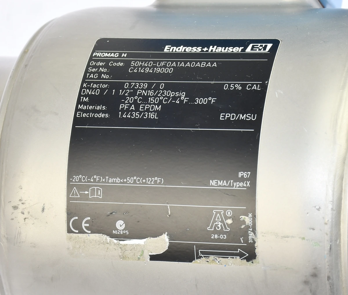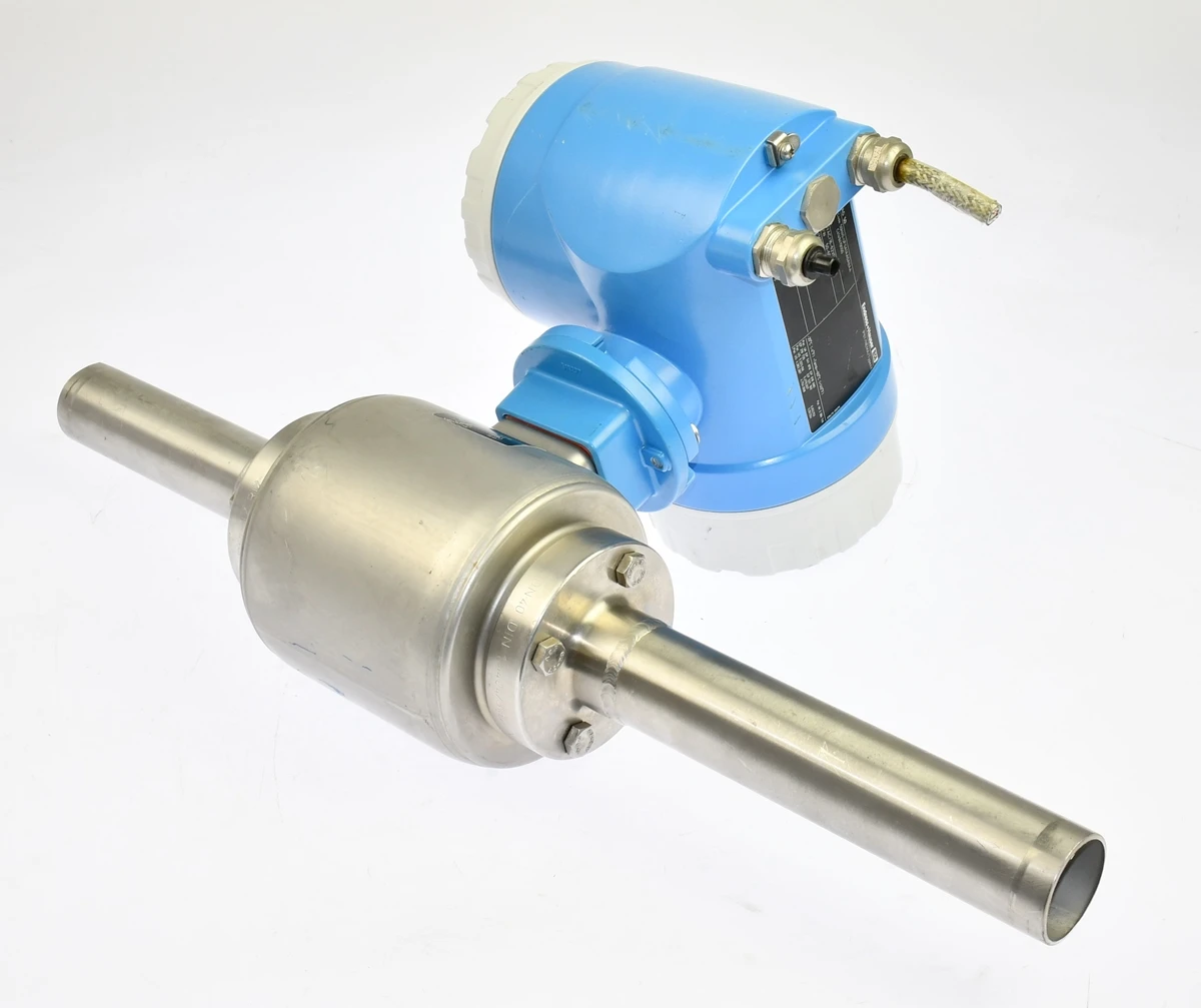Przepływomierz elektromagnetyczny renomowanej w branży firmy: Endress+Hauser, rodzina produktów: PROMAG H, kod produktu: 50H40-UF0A1AA0ABAA. DN40 PN16. Kompletny zestaw z czujnikiem i przetwornikiem w wersji kompaktowej, przeznaczony do pomiaru przepływu cieczy przewodzących w instalacjach przemysłowych, wykonanie z wykładziną PFA i elektrodami 316L zapewnia wysoką odporność chemiczną, zakres temperatur do 150°C, dokładność pomiaru około 0,5%, urządzenie stosowane w przemyśle wodnym, chemicznym i procesowym. Został przez naszą firmę profesjonalnie zdemontowany z likwidowanej instalacji technologicznej.
