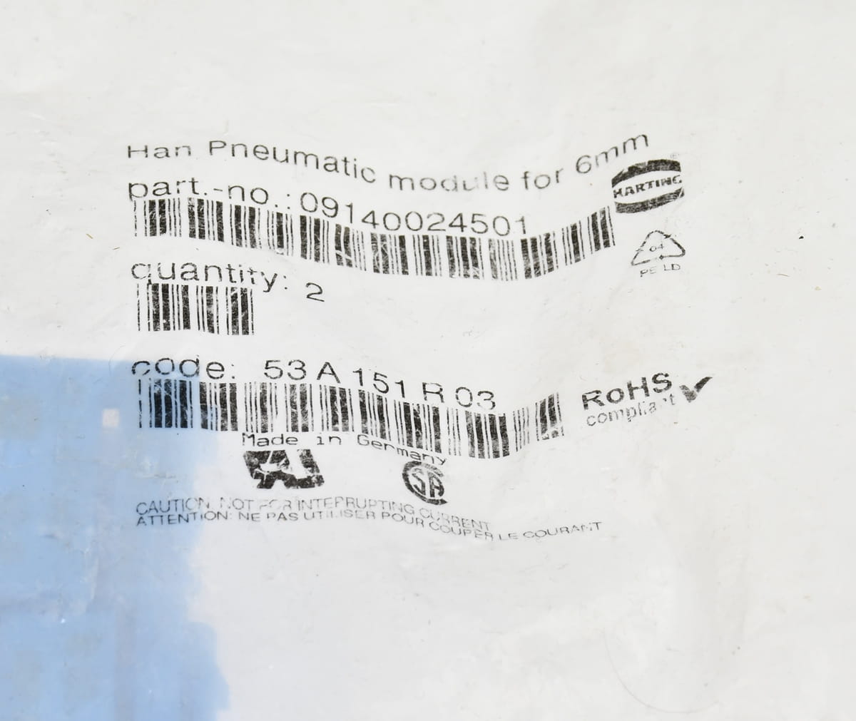 Nie używany komplet złącza o oznaczeniu: 53A151R03, producent: HARTING, kod produktu: 09140024501. Złącze pneumatyczne. Pochodzi z likwidowanych zasobów magazynu utrzymania ruchu, w swoim oryginalnym opakowaniu.