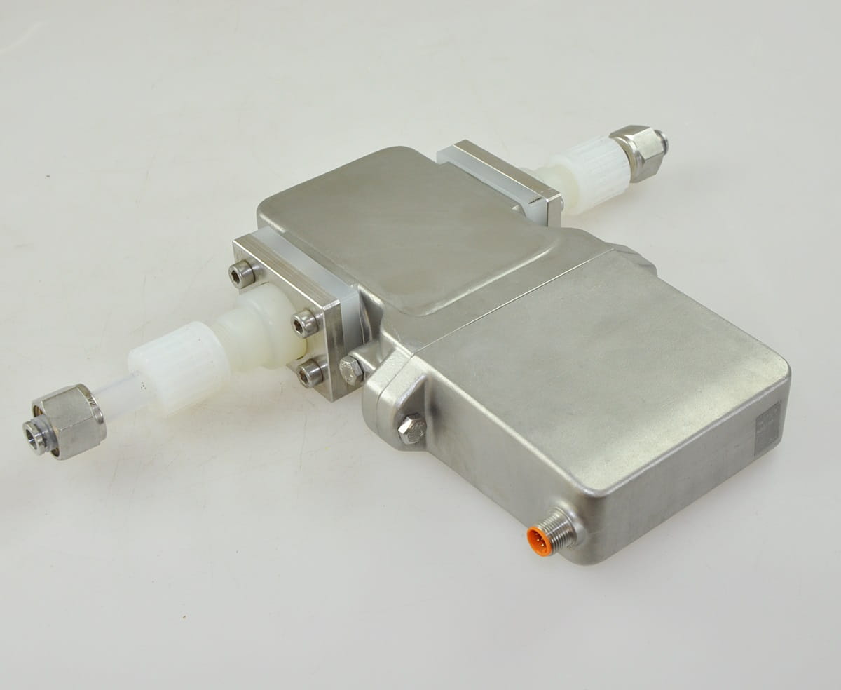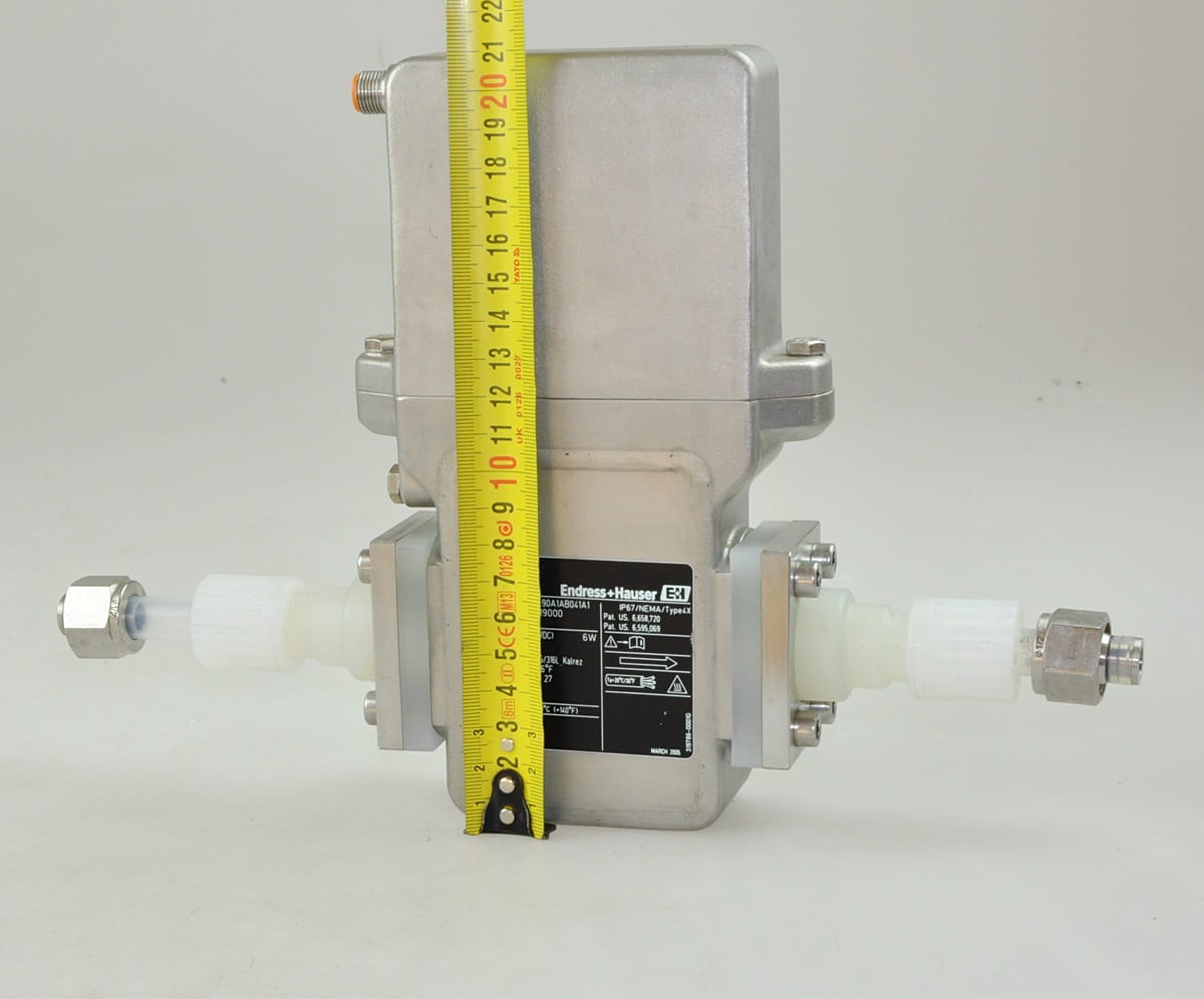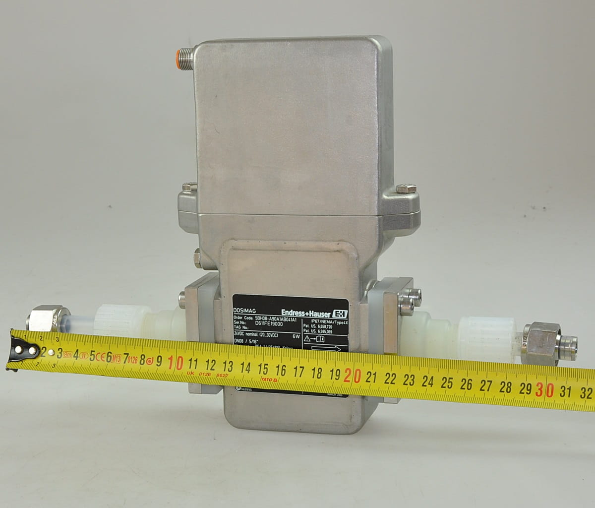 Używany, całkowicie sprawny magnetyczny piernik przepływu cieczy przewodzących. Produkt o symbolu: 5BH08-A90A1AB041A1 DOSIMAG wyprodukowany przez firmę Endress+Hauser. Przepływomierz o dużej dokładności pomiaru i powtarzalności przy zapewnieniu wysokiej czystości linii pomiarowej. W zestawie są widoczne na zdjęciach podłączenia płynu z tworzywa sztucznego.