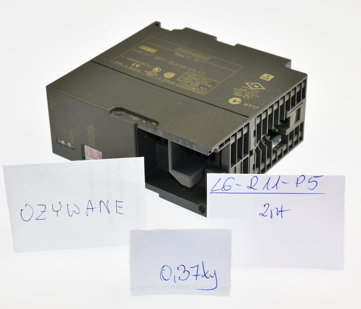 Używany, całkowicie sprawny zasilacz impulsowy firmy Siemens z rodziny SIMATIC S7-300, produkt o symbolu: 6ES7 307-1BA00-0AA0. Zasilacz impulsowy, na wejściu 230VAC, wyjście: 24V DC z wydajnością prądu 2A. Brak frontowej klapki osłaniającej przyłącza.