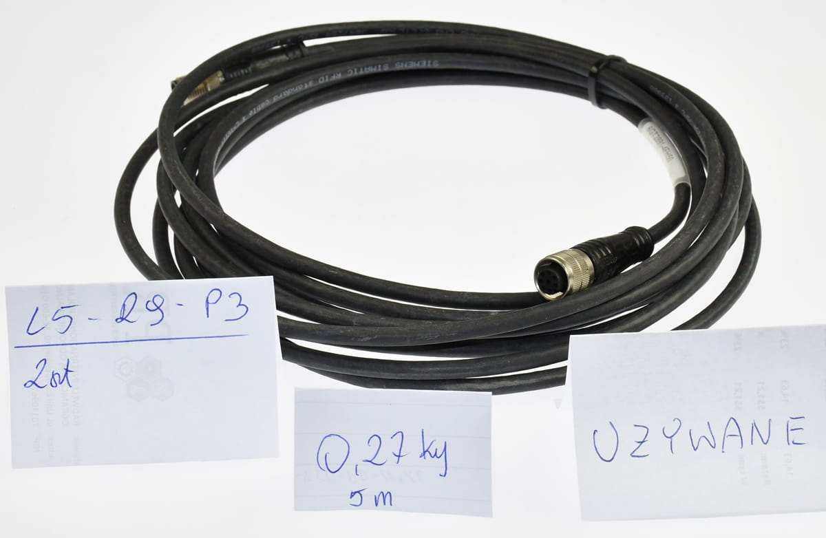 Nowy, nie używany, całkowicie sprawny element o oznaczeniu: 6GT2891-4FH50, produkt firmy Siemens. Przewód do elementów komunikacji z rodziny SIMATIC RF IO-Link connecting cable. Długość przewodu 5mb. złącza M12 (male, 8 pin, straight) / M12 (female, 8 pin, straight), Pochodzi z likwidowanych zapasów magazynu utrzymania ruchu, nie posiada oryginalnego opakowania.