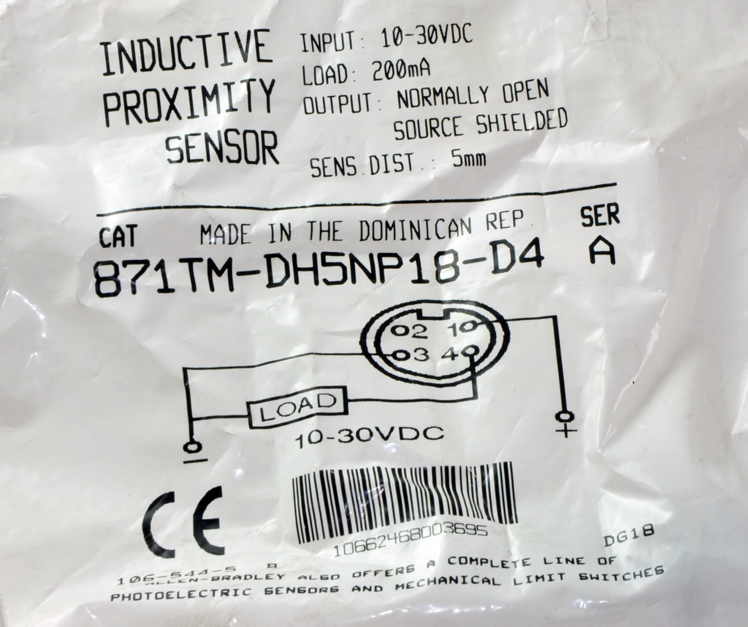 Nowy, nigdy nie używany element o symbolu: 871TM-DH5NP18-D4, produkt renomowanej firmy Allen-Bradley. Posiada oryginalne opakowanie. Proximity Sensor, Inductive, 3-Wire DC, 18 mm Tubular, Metal Face, 10 - 30 Volt DC, 5 mm Sensing Distance, Shielded, Normally Open Output, Micro QD Connection.