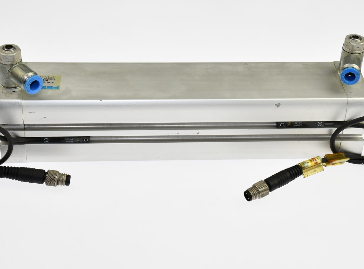Używany, element o symbolu: ADN-32-180-A-P-A, produkt firmy FESTO, Nr katalogu: 536267. Siłownik pneumatyczny obustronnego działania. W zestawie dwie wtykowe szybkozłączki z funkcją regulacji przepływu oraz dwa magnetyczne czujniki położenia tłoka o oznaczeniu BMF0072 firmy Balluff oraz przegub na trzpieniu. Zestaw pochodzi z demontażu całkowicie sprawnych maszyn przemysłowych.