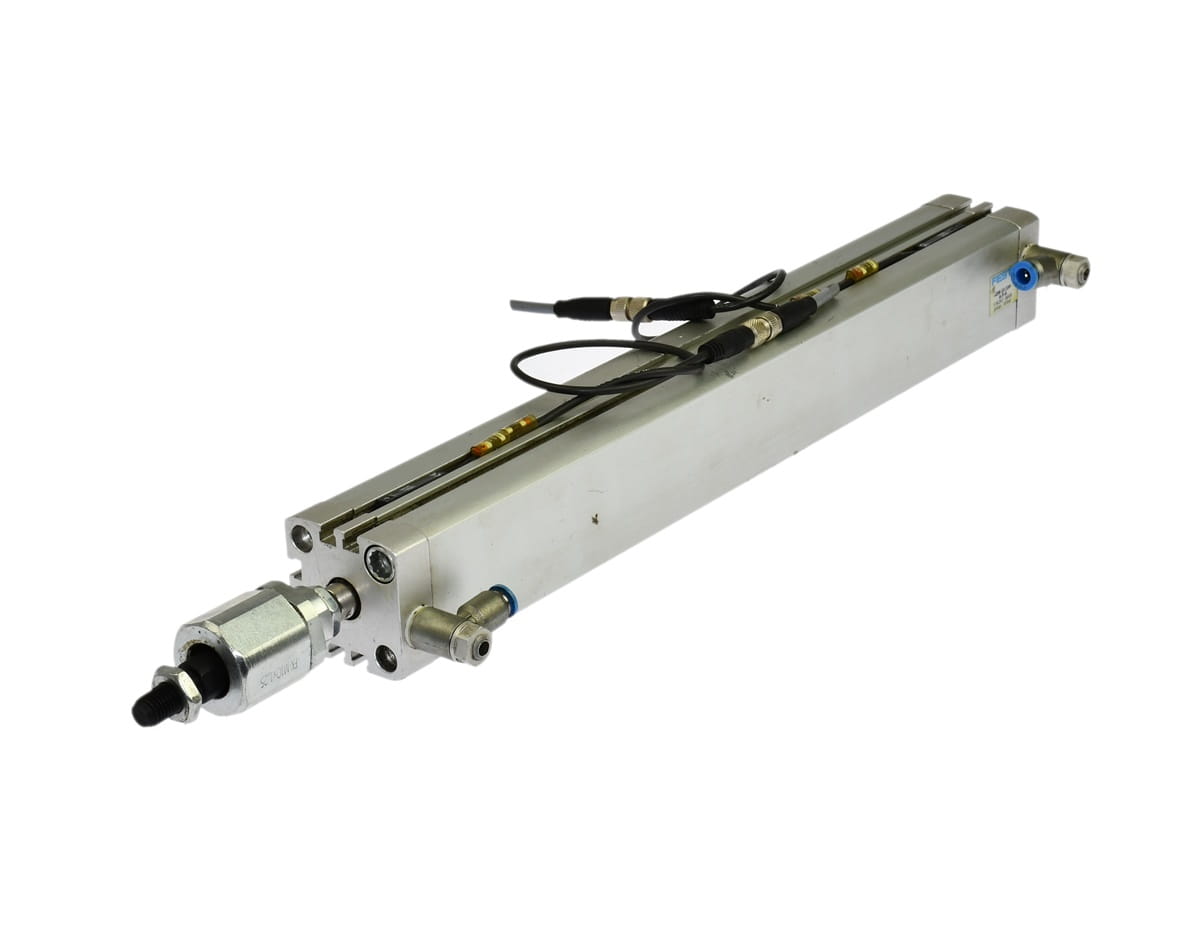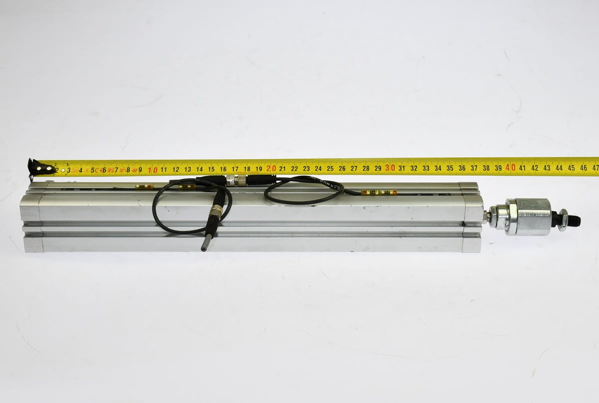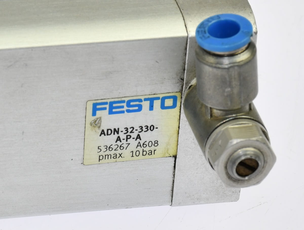 Używany, element o symbolu: ADN-32-330-A-P-A, produkt firmy FESTO, Nr katalogu: 536267. Siłownik pneumatyczny obustronnego działania. W zestawie dwie wtykowe szybkozłączki z funkcją regulacji przepływu oraz dwa magnetyczne czujniki położenia tłoka o oznaczeniu BMF0072 firmy Balluff. Jest też przegub o oznaczeniu: FK-M10x1,25. Zestaw pochodzi z demontażu całkowicie sprawnych maszyn przemysłowych.