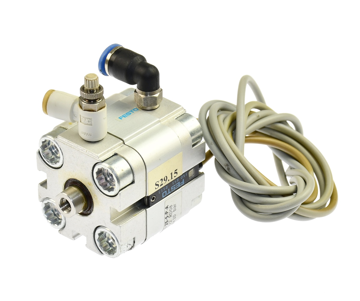 Używany, całkowicie sprawny siłownik pneumatyczny obustronnego działania o symbolu: ADVU-25-5-P-A, produkt renomowanej firmy FESTO. Kod produktu: 156522. W zestawie dwie szybkozłączki do podłączenia przewodów sprężonego powietrza oraz dwa czujniki położenia tłoka: 150 855 również od FESTO.