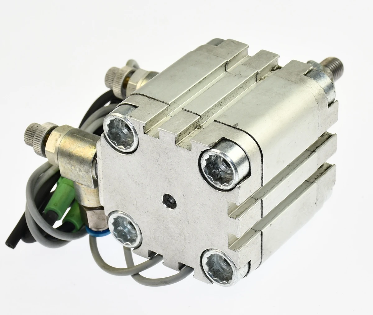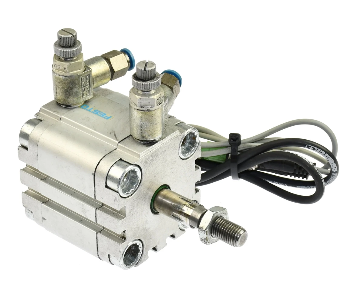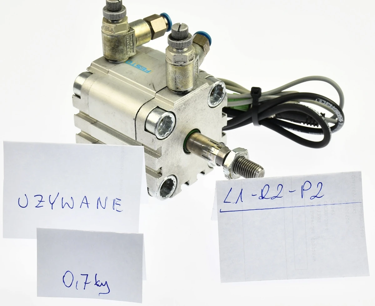 Używany, całkowicie sprawny element o oznaczeniu: ADVU-40-20-A-P-A, produkt firmy: FESTO, kod produktu: 156629. Siłownik pneumatyczny obustronnego działania. W zestawie dwa czujniki położenia o oznaczeniu: SMT-8F-PS-24V-K0,3-M8D, kod produktu: 525899, przewody z oryginalnymi wtyczkami M8, dodatkowo wtyczki do nich z odcinkami przewodów. W zestawie są jeszcze dwa zawory dławiące GRLA z szybkozłączami wtykowymi na wąż fi 6mm.