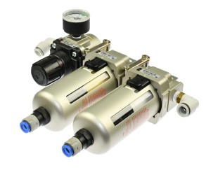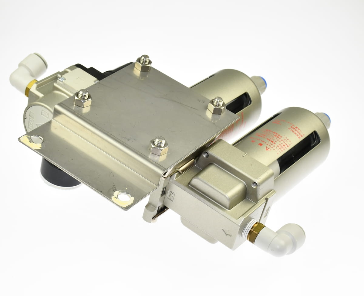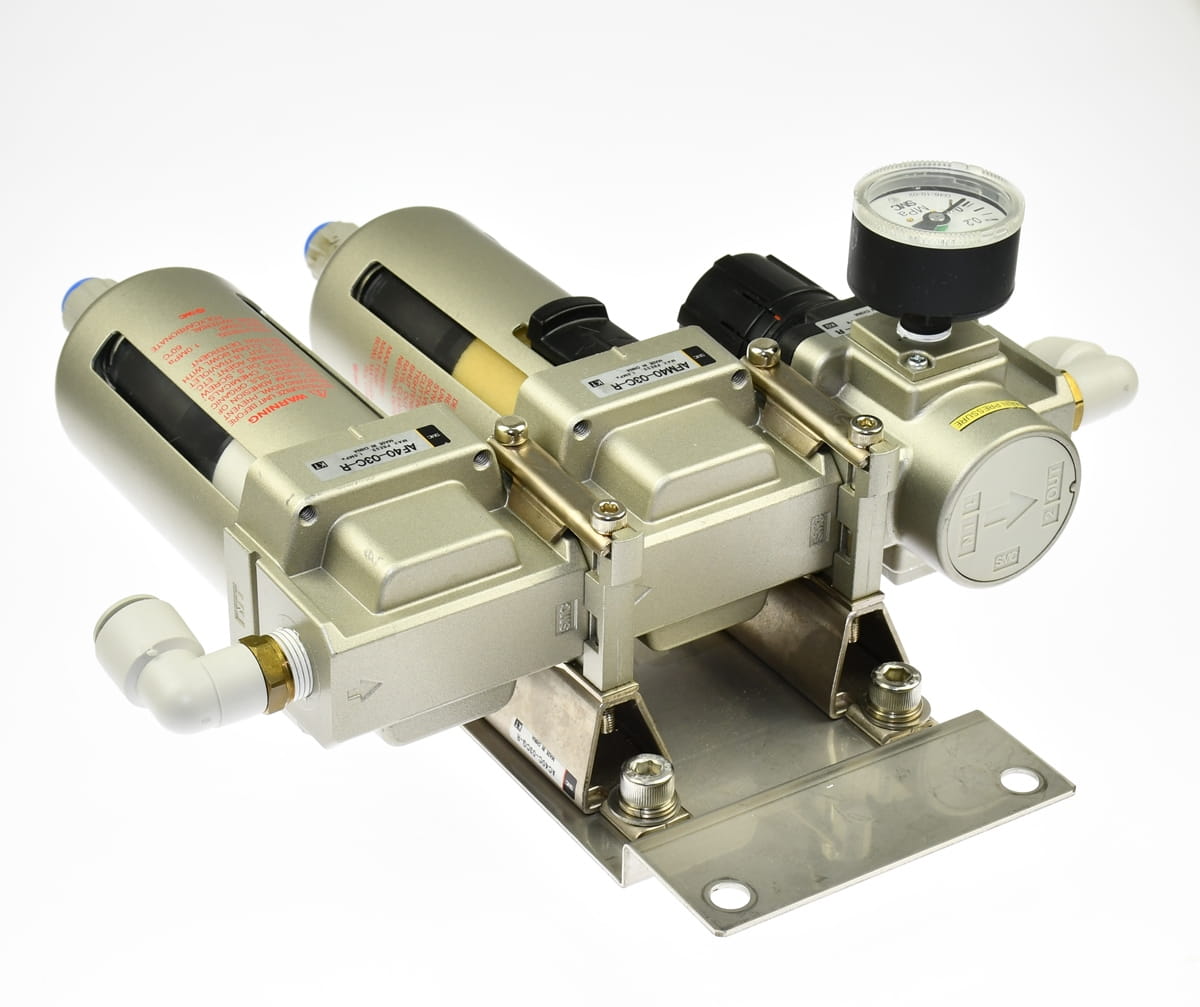 Używana, całkowicie sprawna stacja przygotowania sprężonego powietrza składająca się z następujących elementów: AFM40-03C-R separator; AF40-03G-R - regulator ciśnienia z manometrem; AF40-03C-R - filtr powietrza. Do tego mocowanie AC40C-03CG-R i szybkozłączki do podłączenia przewodów sprężonego powietrza. Całość przykręcona do płyty nierdzewnej.