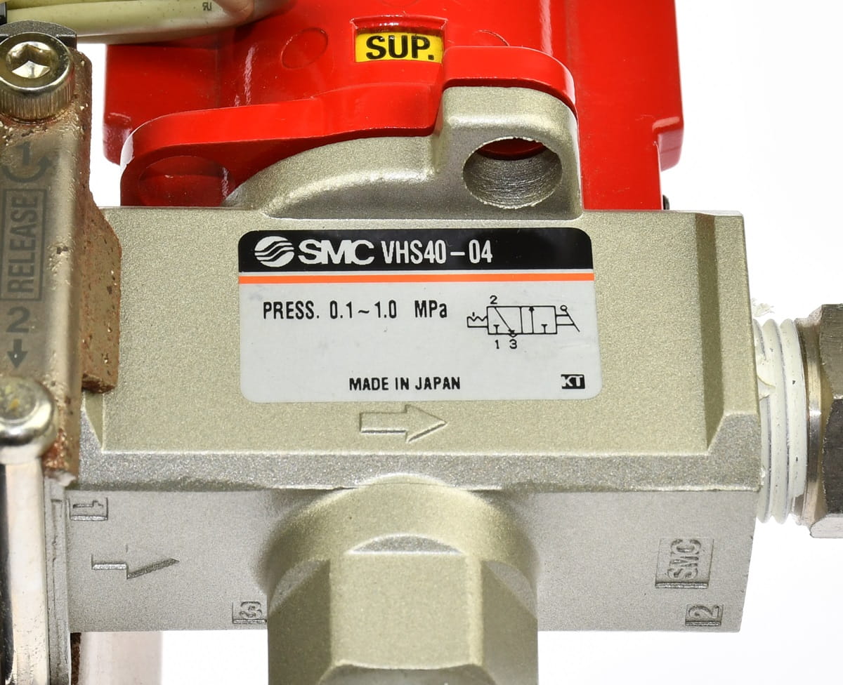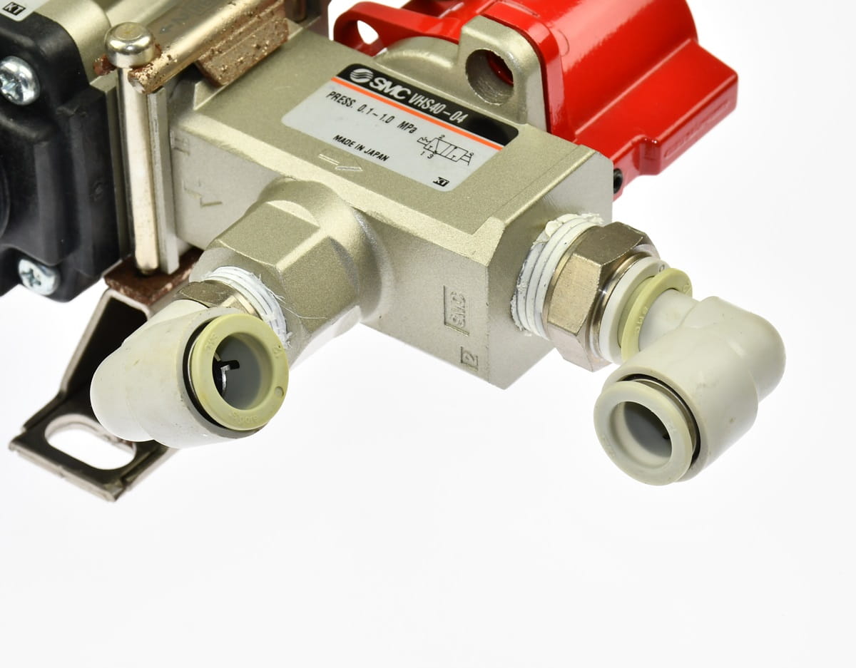 Używana, całkowicie sprawna stacja przygotowania sprężonego powietrza składająca się z następujących elementów: AF40-04 - filtr powietrza; AR40-04-X465A - regulator ciśnienia; ISE30-01-25-M - presostat z wyświetlaczem aktualnego ciśnienia; VHS40-04 - zawór bezpieczeństwa, odcinający ze spustem. Do tego mocowanie i szybkozłączki do podłączenia przewodów sprężonego powietrza.