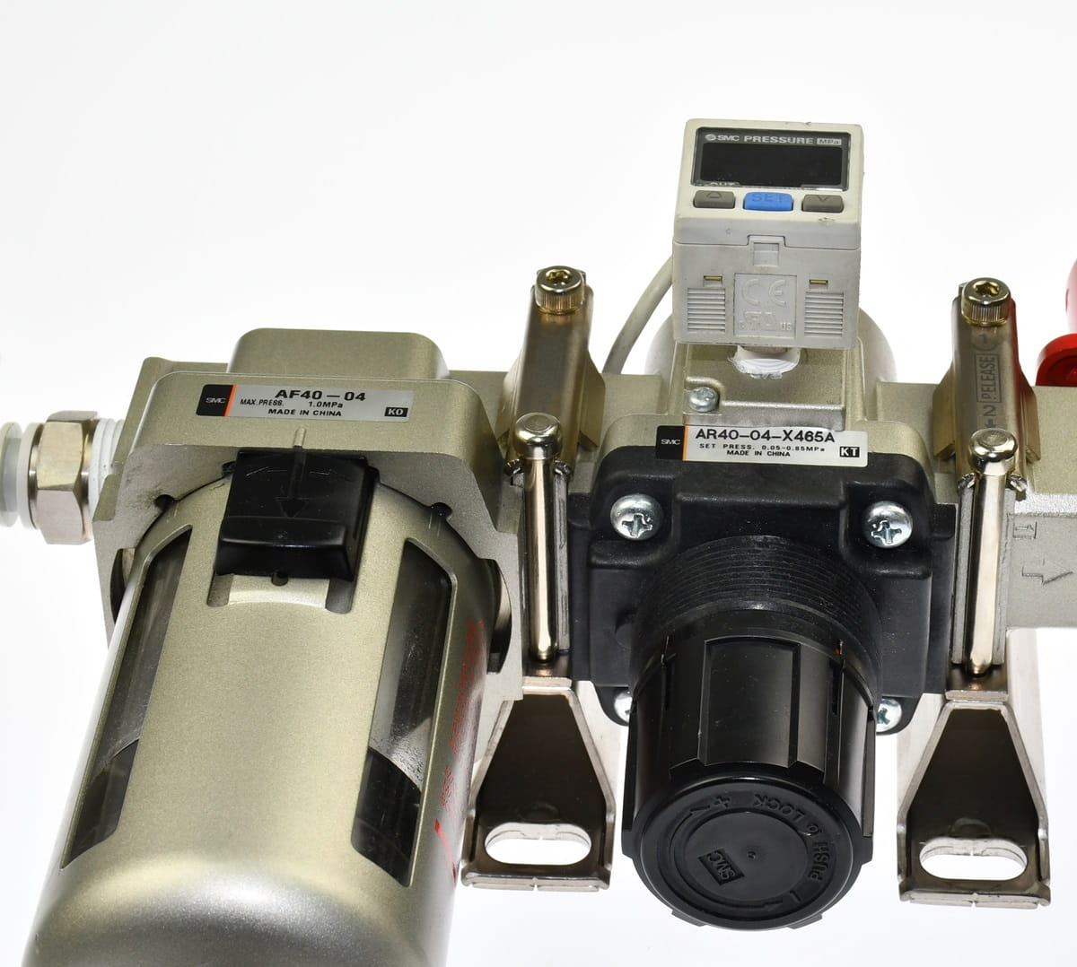 Używana, całkowicie sprawna i w naprawdę idealnym stanie stacja przygotowania sprężonego powietrza składająca się z następujących elementów: AF40-04-X465A; VHS40-04; AF40-04; ISE30-01-25-M. Do tego uchwyty mocowania i szybkozłącza. Producentem jest renomowana w branży firma SMC. Zestaw pochodzi z demontażu całkowicie sprawnych maszyn przemysłowych.