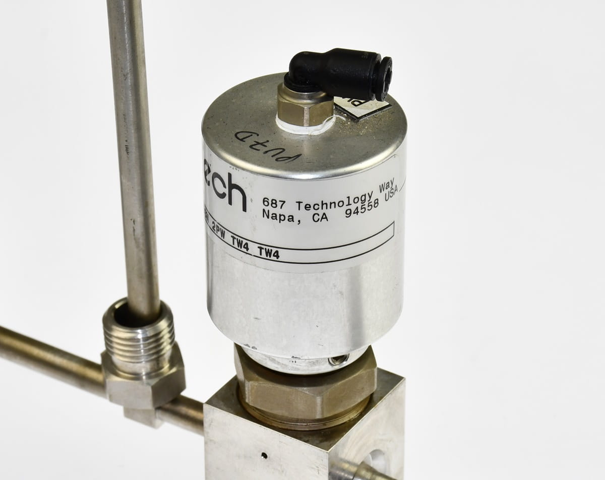Używany, całkowicie sprawny i w naprawdę idealnym stanie specjalistyczny zawór gazowy, membranowy o symbolu: AP3540SM 2PW TW4 TW4, produkt firmy APTech. W zestawie z armaturą i złączami Swagelok VCR. Zawór sterowany siłownikiem pneumatycznym jednostronnego działania. W zestawie jest szybkozłączka wtykowa. Pochodzi z demontażu instalacji nanoszenia cienkich warstw metodą CVD.