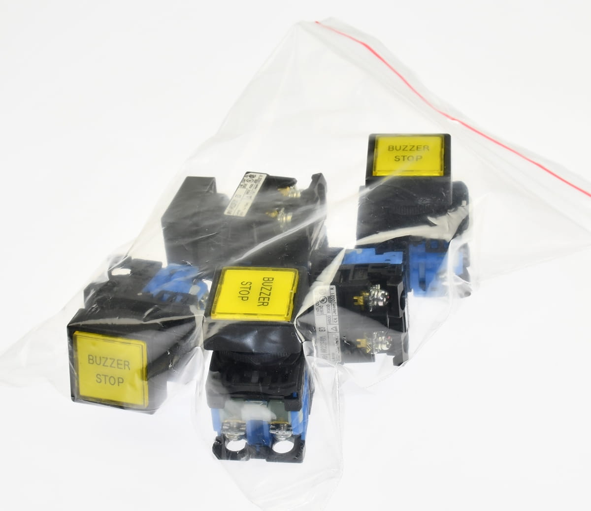 Używany, całkowicie sprawny element o symbolu: AR22F0M E3 firmy FUJI Electric. Wyłącznik do montażu panelowego. Moduły : AR9B292 lampa LED oraz AR9B280 ze stykiem N.O . Pochodzi z demontażu całkowicie sprawnych. Obsadzony front przeżroczysty, żółty z napisem Buzzer Stop, podświetlany lampką LED.