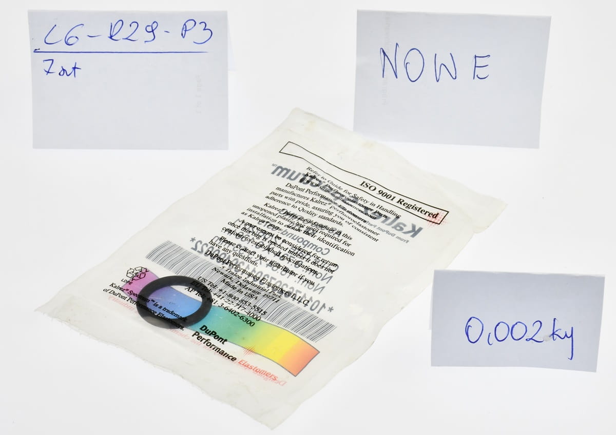 Nie używany, oryginalnie zapakowany element o oznaczeniu: AS-568 O-RING KALREZ, producent DuPont. O-ring wykonany z Perfluoroelastomeru, wymiar: 18,64x3,53 mm. Dla przemysłu procesów chemicznych. Pochodzi z likwidowanych zasobów magazynu utrzymania ruchu.