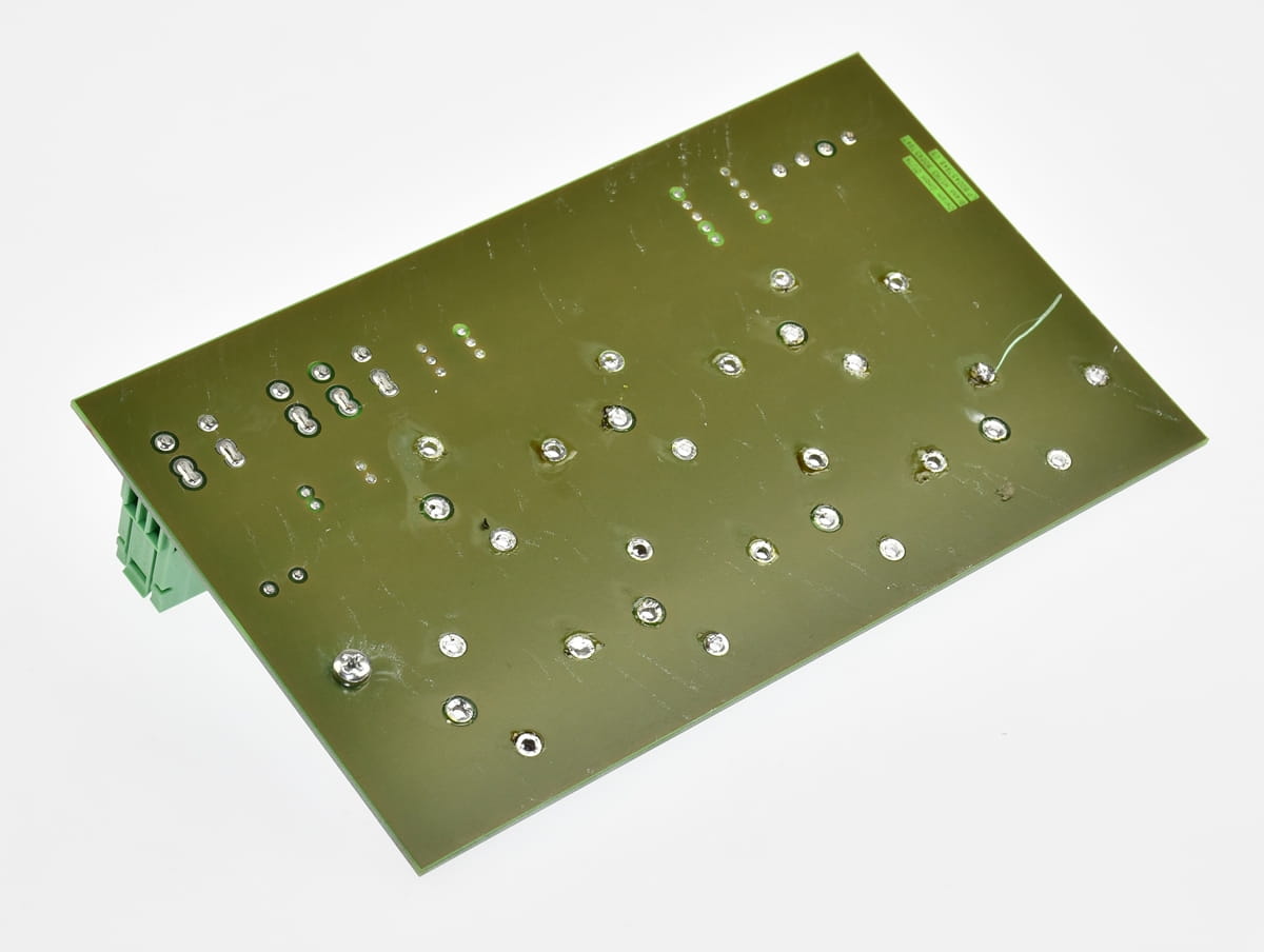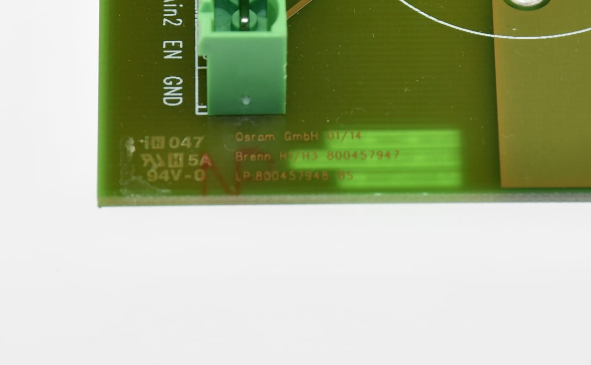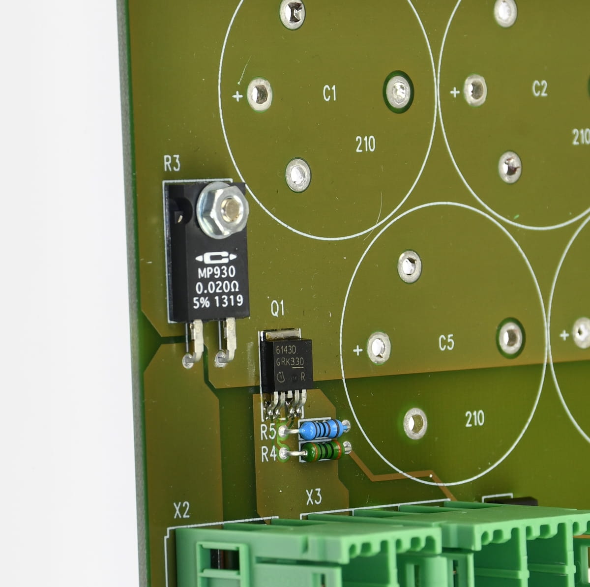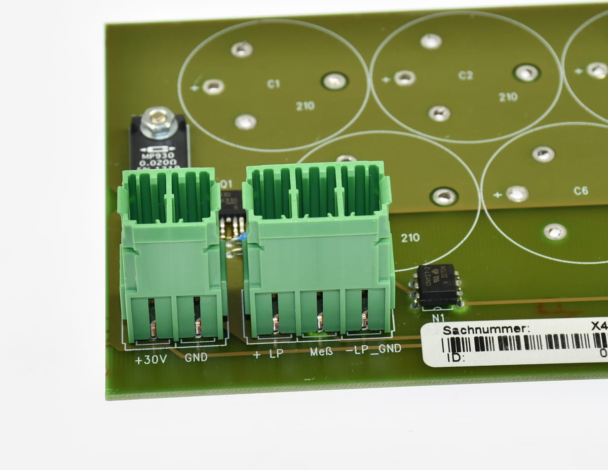 Używany moduł PCB z elementami na pokładzie: BTS6143D półprzewodnikowy przełącznik oraz MP930 Rezystor 0,020R. Na pokłądzie są jeszcze widoczne na zdjęciach złącza.