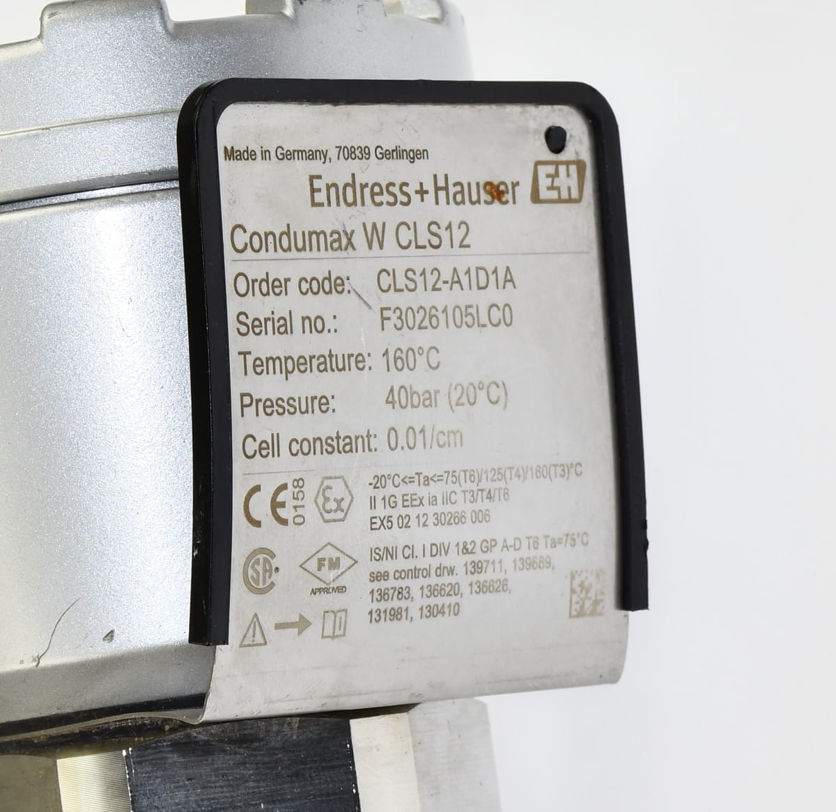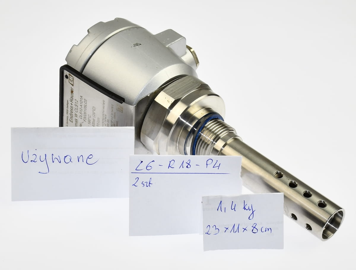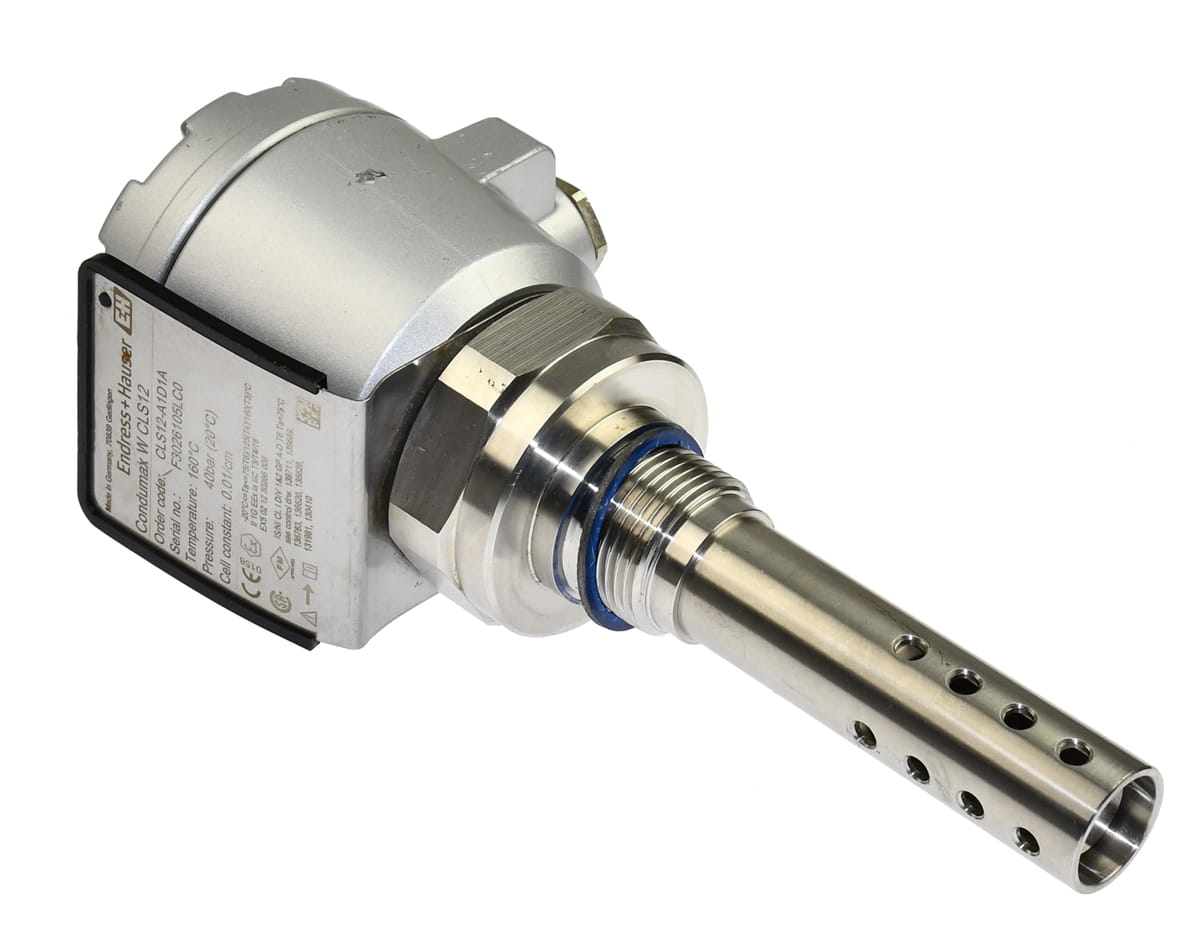 Używany przetwornik o symbolu: CLS12-A1D1A Condumax, produkt firmy Endress+Hauser. Jest to czujnik o wysokiej odporności cieplnej i mechanicznej, do pomiaru przewodności pary/wody w energetyce. Jest przeznaczony szczególnie do pomiaru mediów o niskiej przewodności, nawet w warunkach wysokich temperatur i ciśnień, celem zabezpieczenia instalacji przed odkładaniem się osadów i korozją. Pochodzi z demontażu całkowicie sprawnych maszyn przemysłowych.