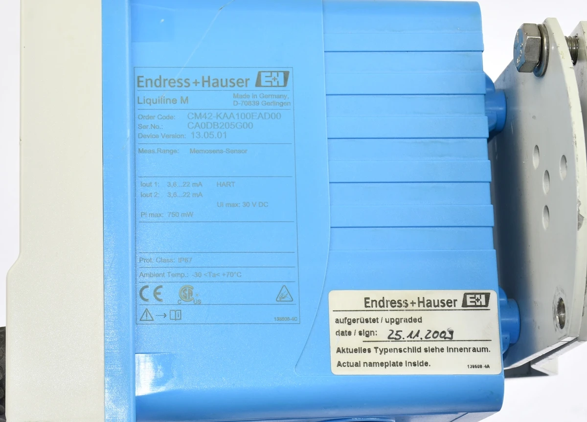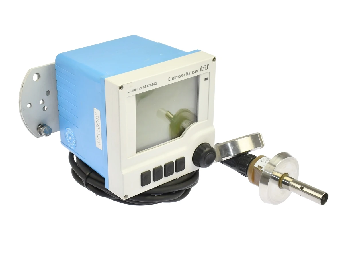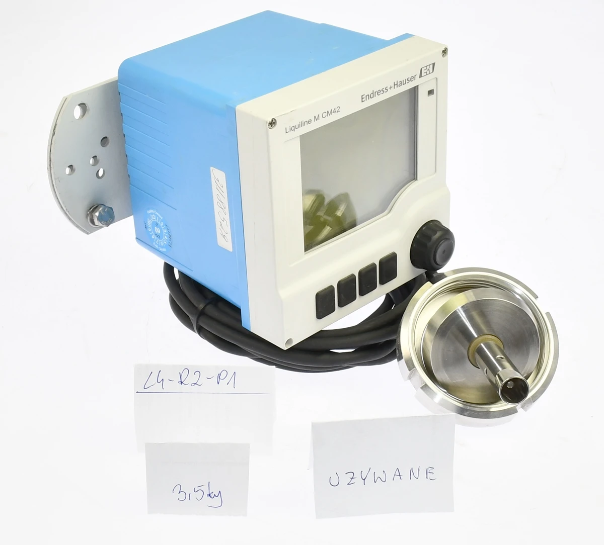 Używany, całkowicie sprawny kontroler o oznaczeniu: CM42-KAA100EAD00, produkt renomowanej firmy: Endress+Hauser z rodziny Liquiline M. Przetwornik (transmiter) analizy cieczy, w zestawie jest czujnik przewodności elektrycznej - konduktometr w wykonaniu przemysłowym z rodziny CLS, niestety etykietka jest uszkodzona więc nie znamy dokładnego modelu. Zestaw zdemontowany z działającej, likwidowanej linii przemysłowej z zasilania wodą demineralizowaną. W zestawie jest też widoczny na zdjęciach, oryginalny przewód sygnałowy łączący komponenty.