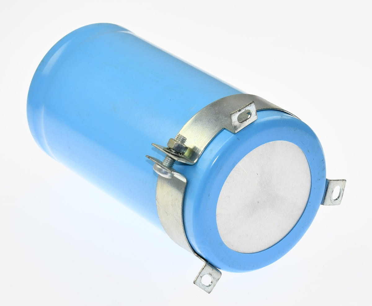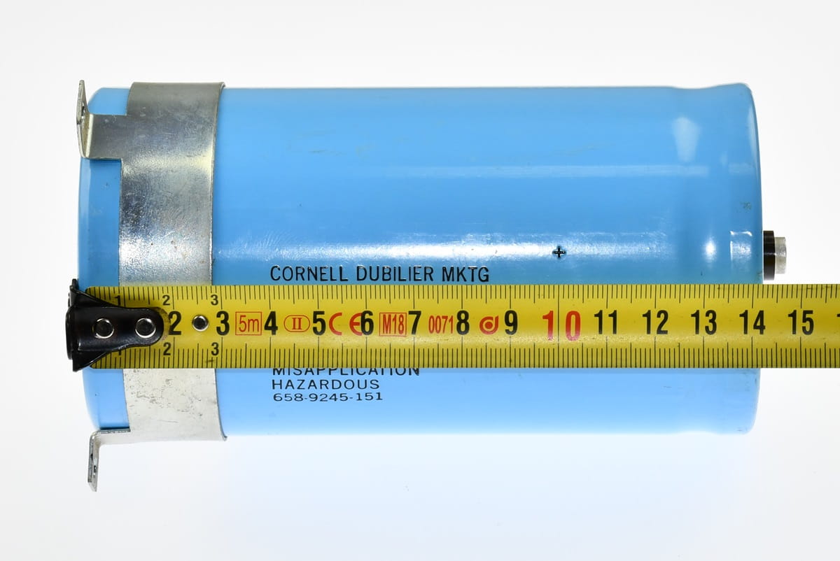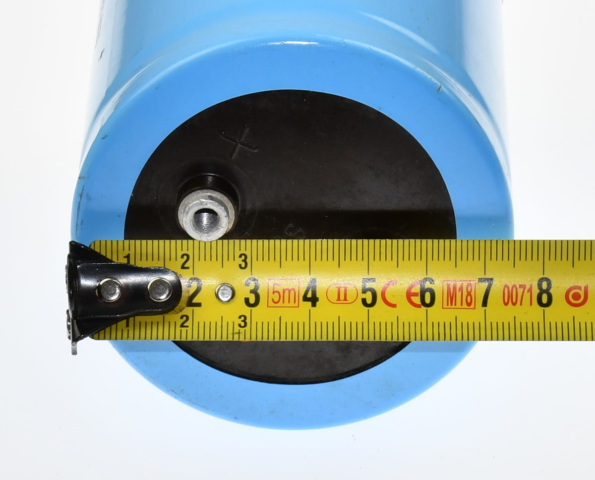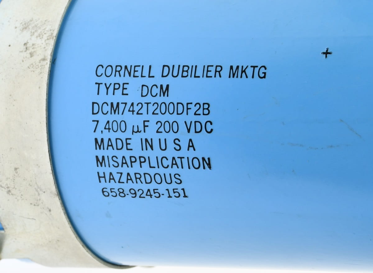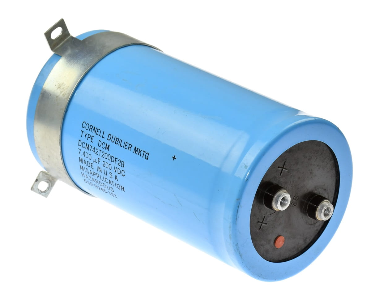 Używany, ale całkowicie sprawny i w bardzo dobrym stanie kondensator elektrolityczny o symbolu DCM742T200DF2B, producent: Cornell Dublier MKTG. Pojemność kondensatora 7400uF, napięcie 200V DC. W zestawie podstawka mocująca.