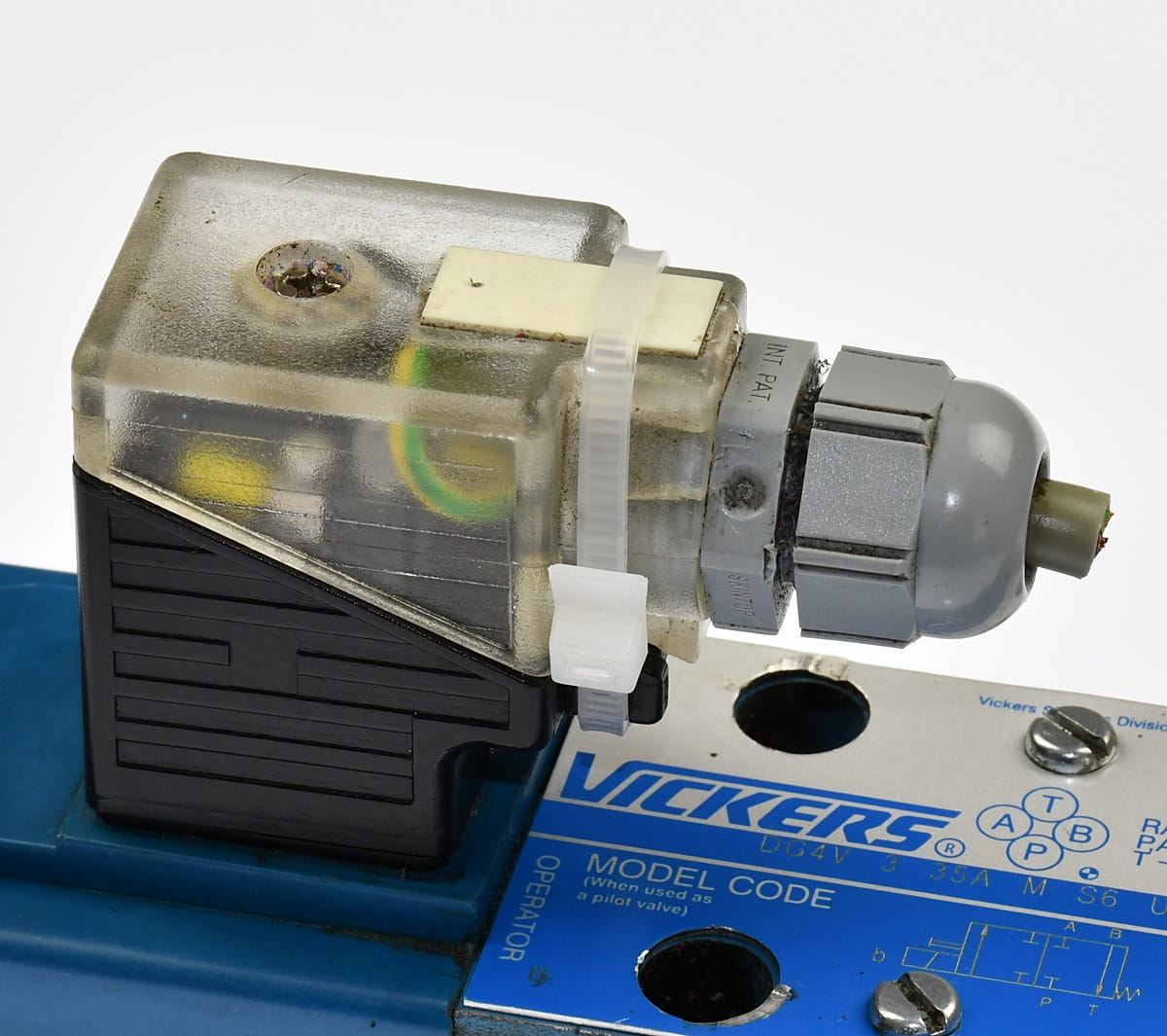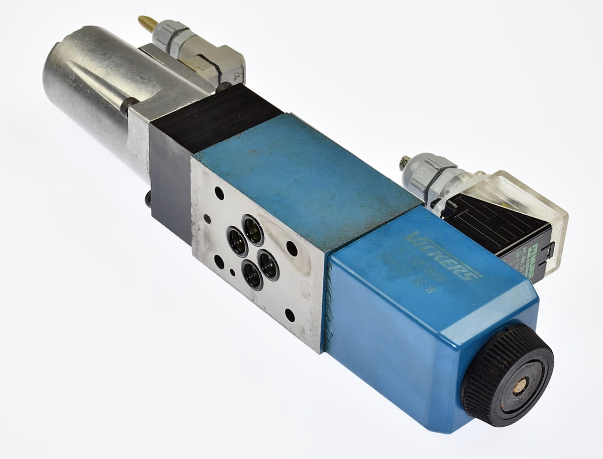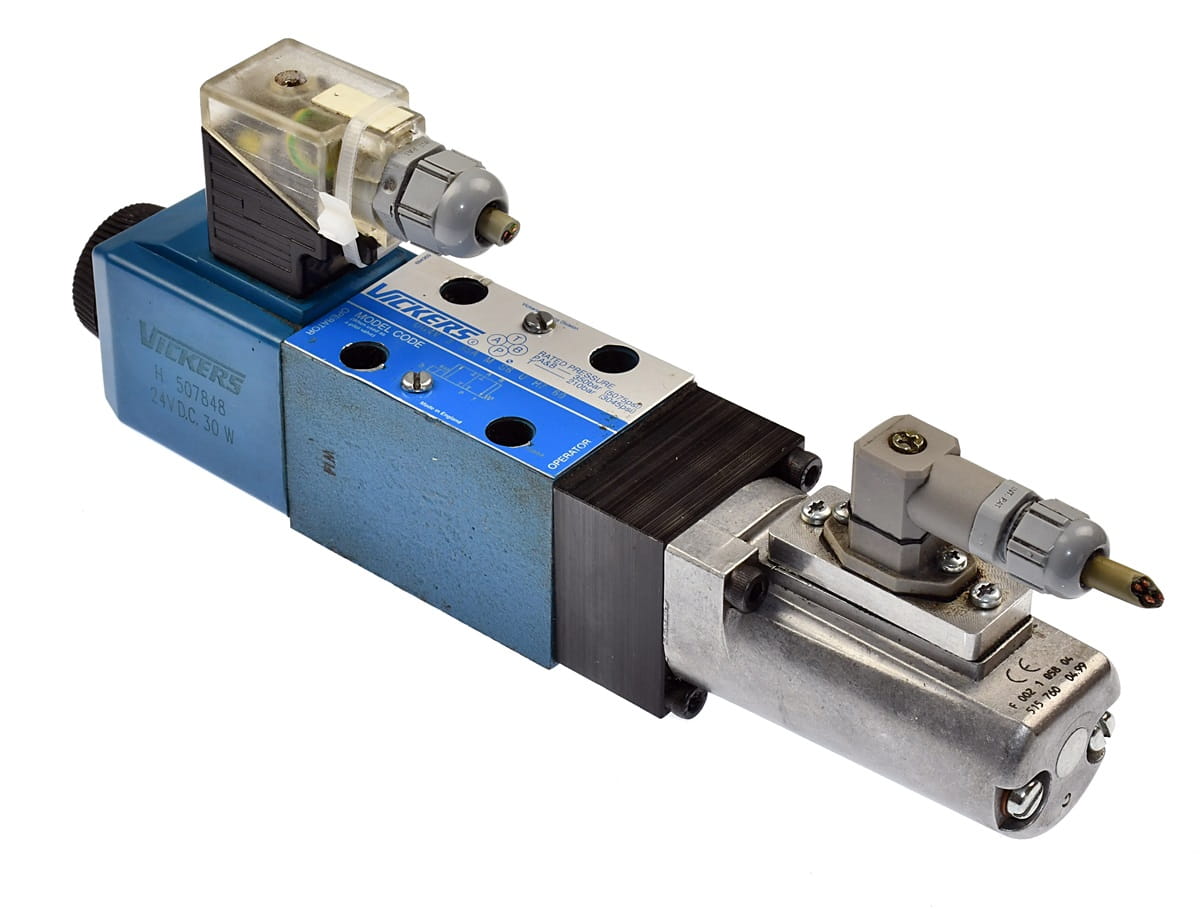 Używany, całkowicie sprawny elektrozawór hydrauliczny sterowany proporcjonalnie. Produkt o symbolu: DG4V 3 35A M S6 U H7 60, producent renomowana firma: VICKERS. W zestawie są widoczne na zdjęciach wtyczki sygnałowe.