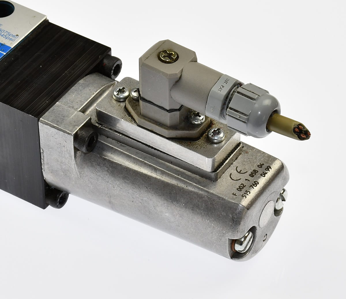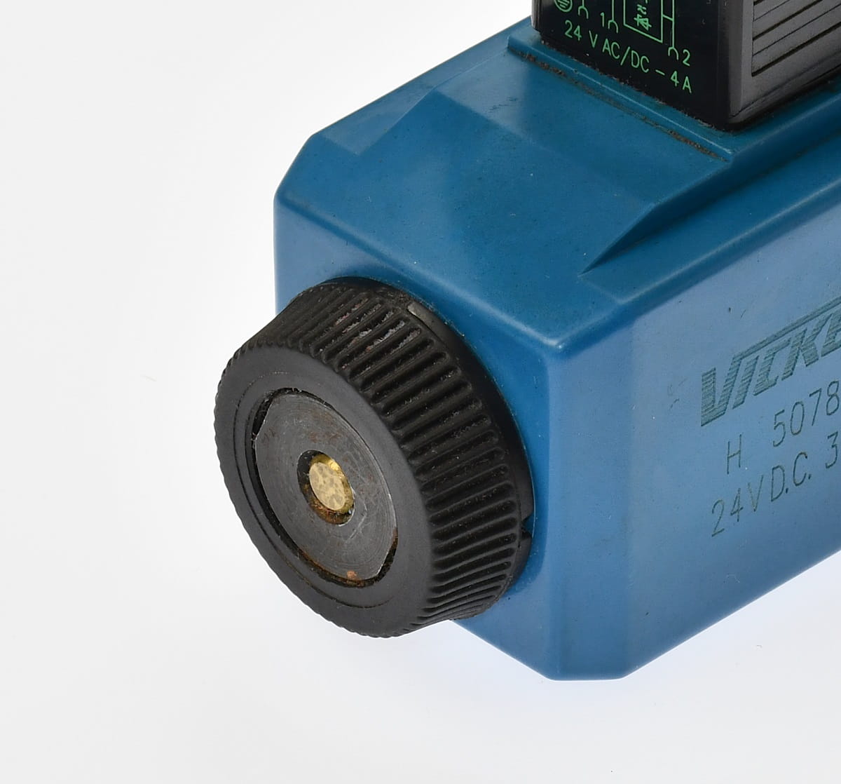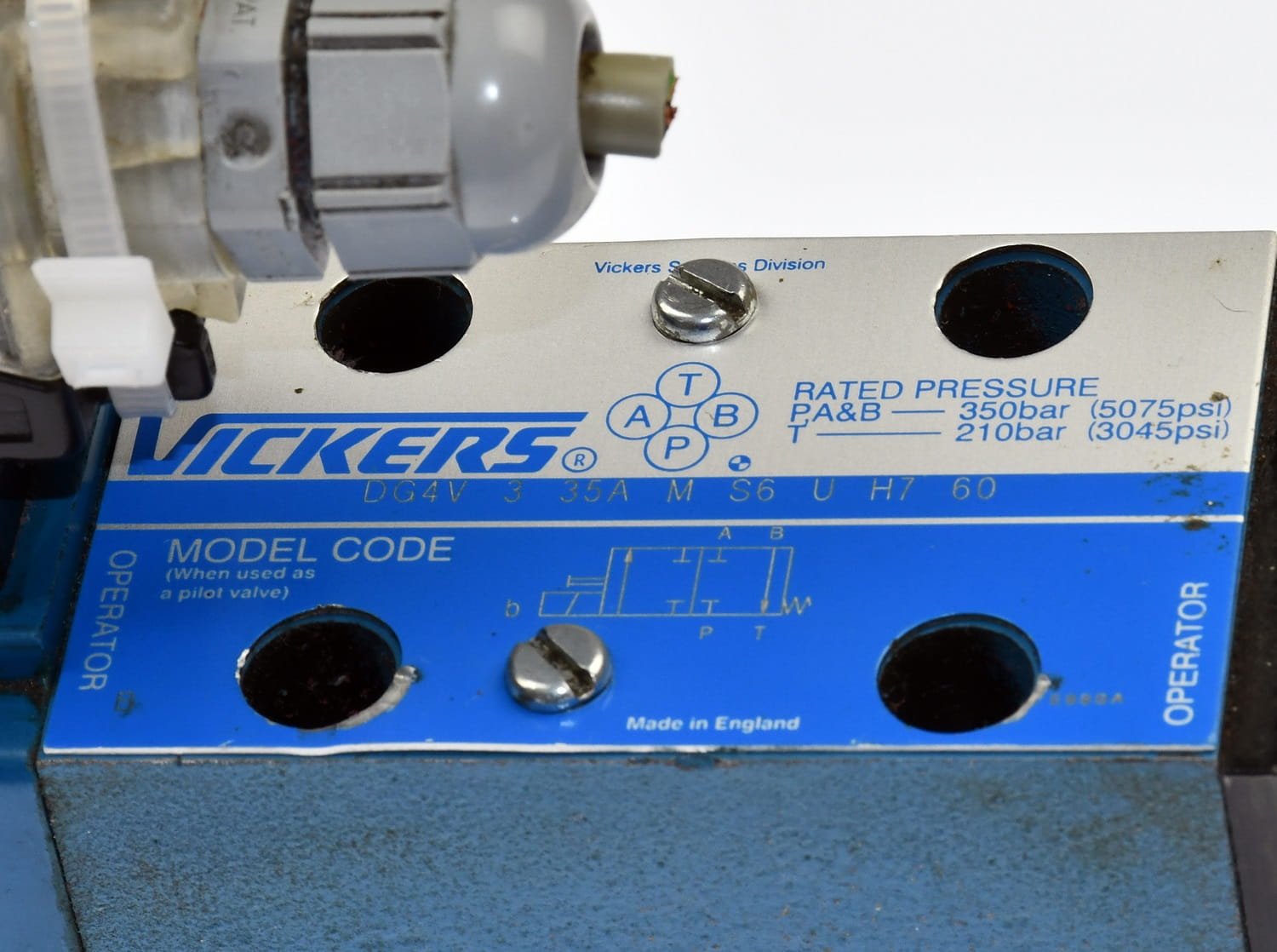 Używany, całkowicie sprawny elektrozawór hydrauliczny sterowany proporcjonalnie. Produkt o symbolu: DG4V 3 35A M S6 U H7 60, producent renomowana firma: VICKERS. W zestawie są widoczne na zdjęciach wtyczki sygnałowe.