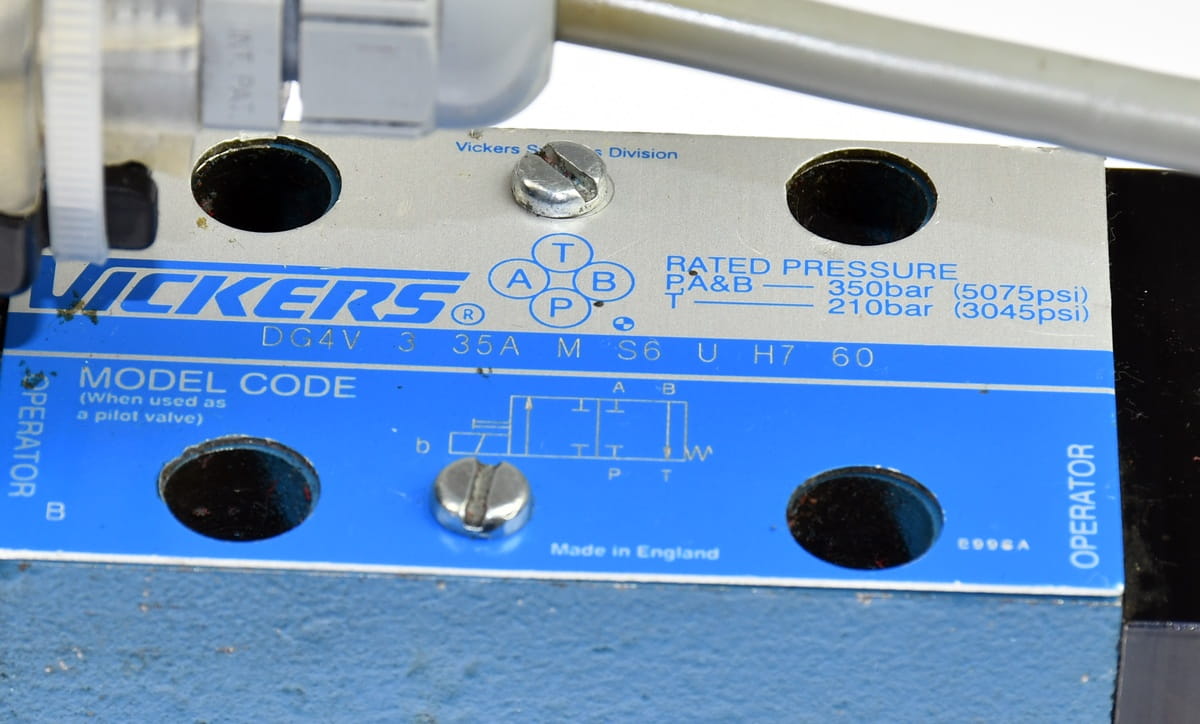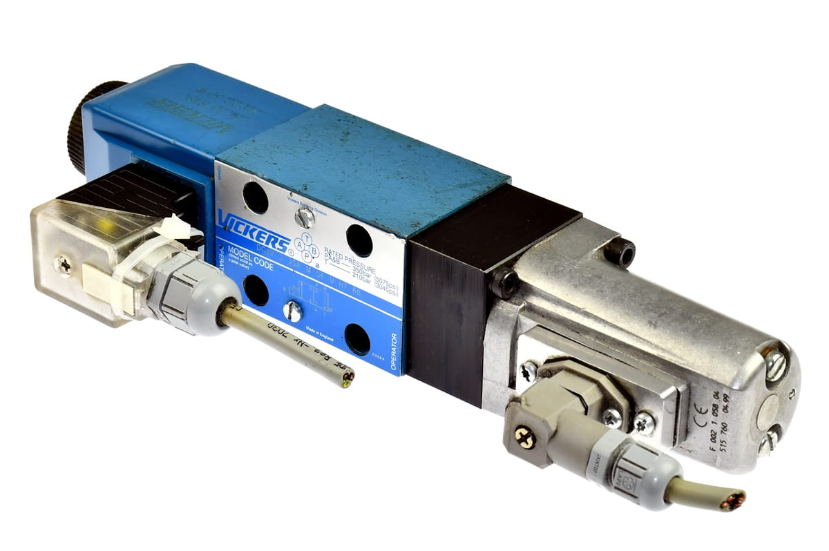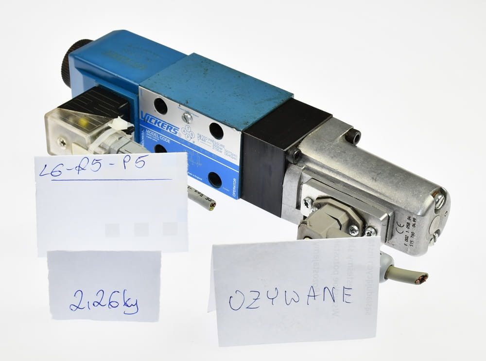Używany, całkowicie sprawny elektrozawór hydrauliczny sterowany proporcjonalnie. Produkt o symbolu: DG4V 3 35A M S6 U H7 60, producent renomowana firma: VICKERS. W zestawie są widoczne na zdjęciach wtyczki sygnałowe. Jedna z wtyczek ma uszkodzoną obudowę co pokazaliśmy na zdjęciu Nr 2. Urządzenie pochodzi z demontażu całkowicie sprawnych maszyn przemysłowych.