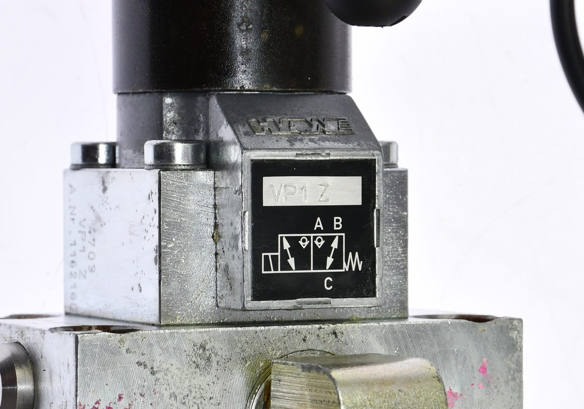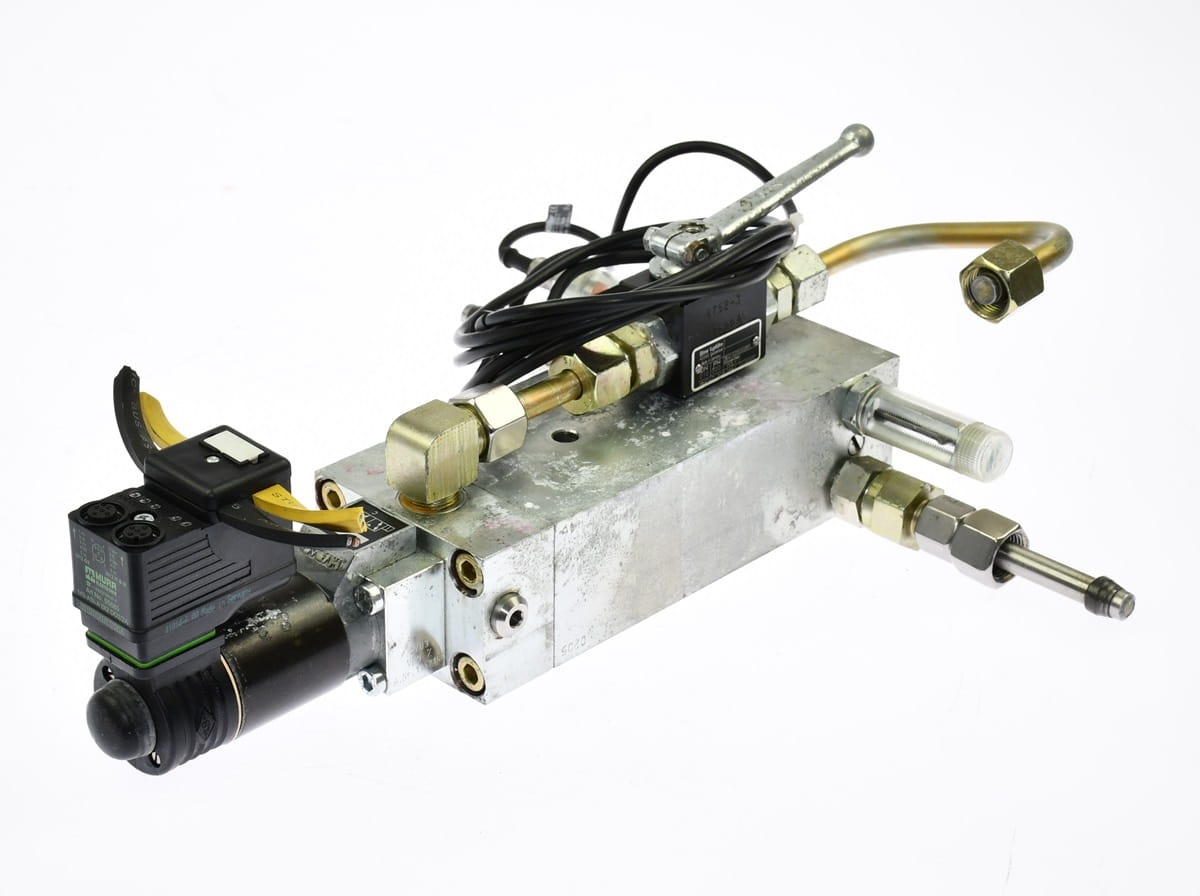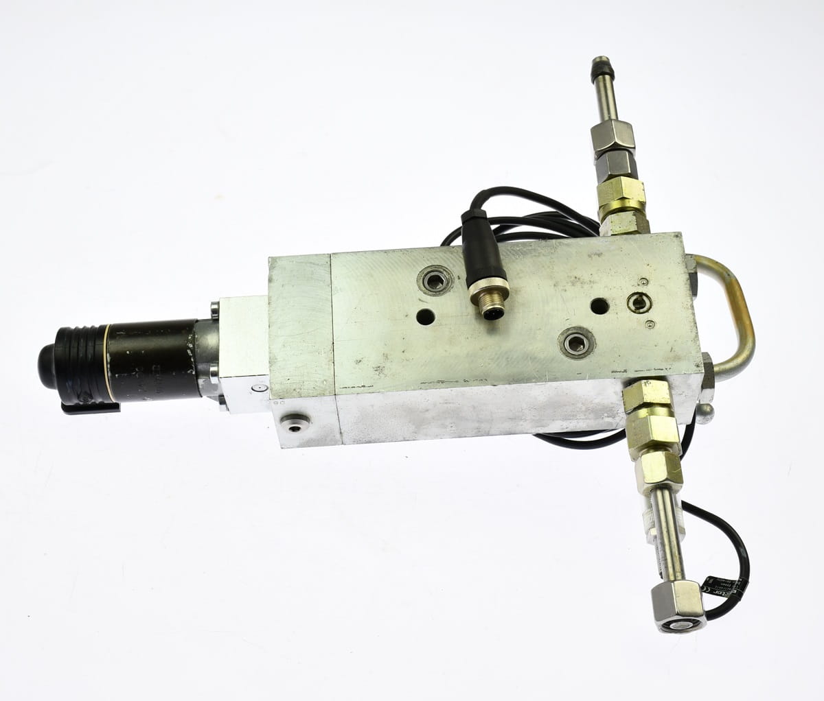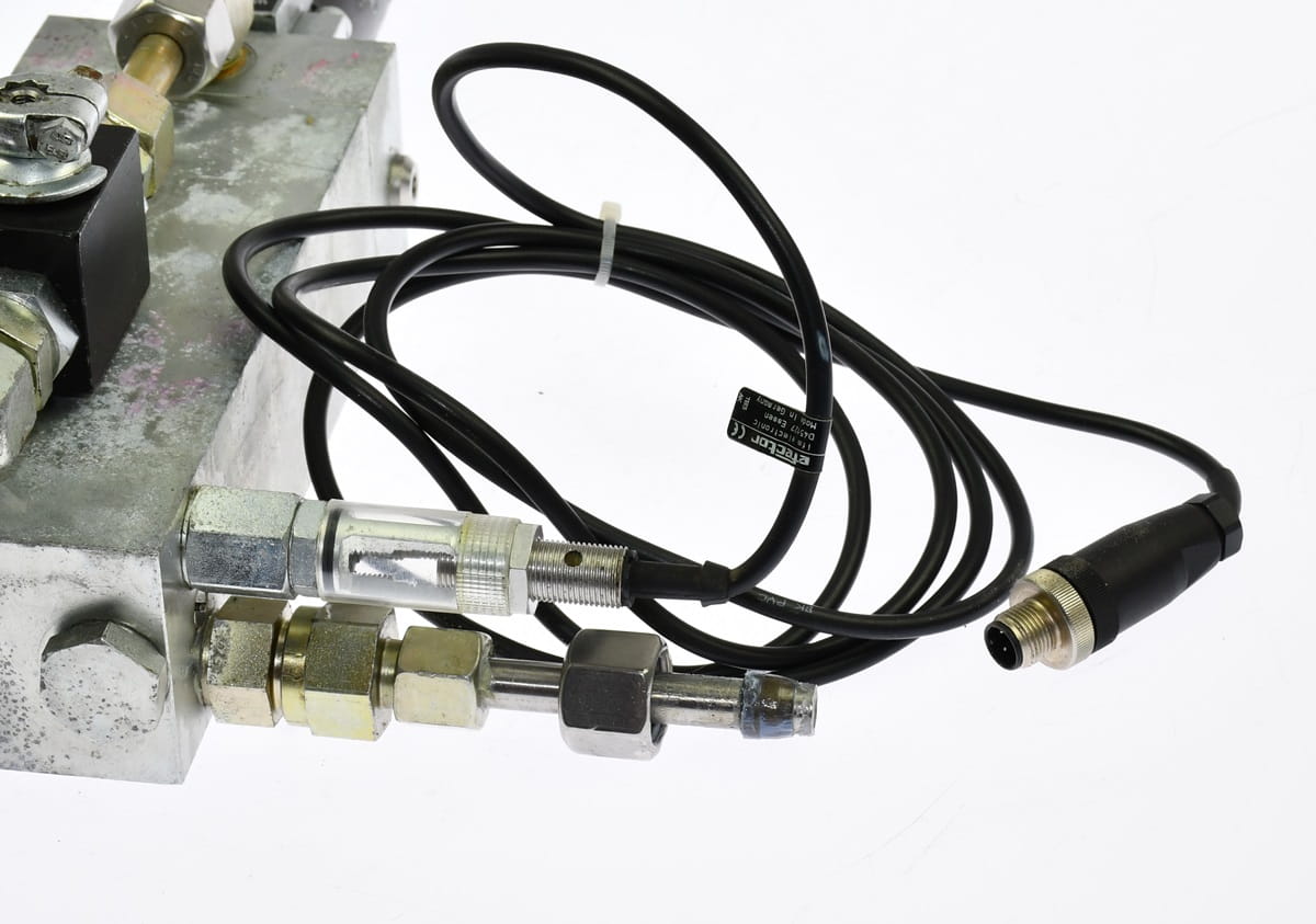 Używany, całkowicie sprawny element o oznaczeniu: EZV 2 04-12 1, produkt firmy LINCOLN. Progresywny dystrybutor smaru w układach centralnego smarowania wysokiego ciśnienia. W zestawie są wszystkie widoczne na zdjęciach elementy jak: zawór ręczny: BHGV7 firmy Bohmer, czujnik IF5188 firmy IFM, elektrozawór VP1ZA, SK 7915800 czy przewód sygnałowy z wtyczką M12.