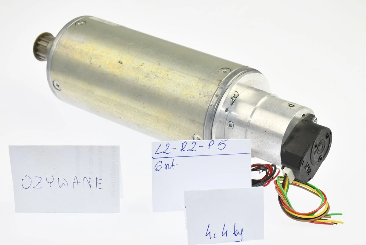 Używany, całkowicie sprawny serwosilnik prądu stałego o oznaczeniu: GR 80x80, producent Dunkermotoren GmbH. Kod produktu: 88448. Silnik prądu stałego zasilany napięciem 30V, zespolony z normalnie zablokowanym hamulcem oraz enkoderem inkrementalnym RE30. Hamulec sterowany napięciem stałym 24V.