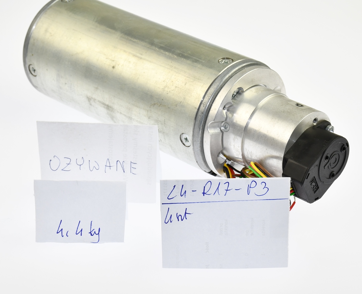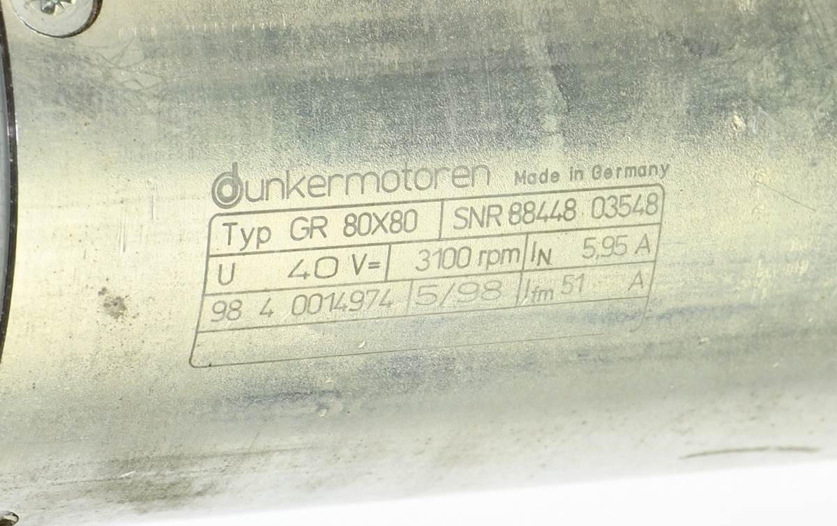 Używany, całkowicie sprawny serwosilnik prądu stałego o oznaczeniu: GR 80x80, producent Dunkermotoren GmbH. Kod produktu: 88448. Silnik prądu stałego zasilany napięciem 40V, zespolony z normalnie zablokowanym hamulcem oraz enkoderem inkrementalnym RE30-2-500. Hamulec sterowany napięciem stałym 24V.