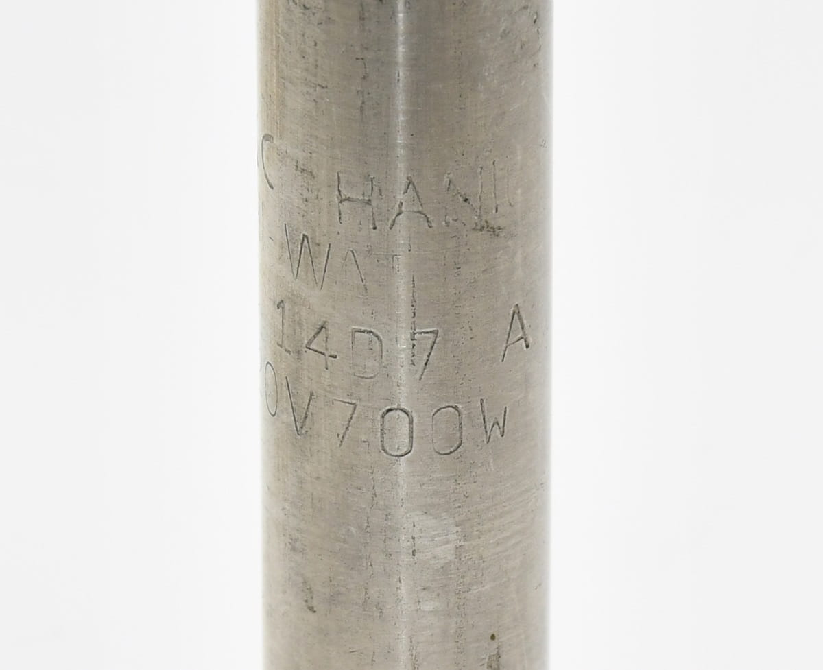 Nowy, nie używany element o symbolu: HB14D7A, produkt firmy Hanil. Grzałka patronowa o mocy 700W, zasilanie 220V, średnica tuby grzejnej 13,7mm, długość grzałki 370mm. Pochodzi z likwidowanych zapasów magazynu utrzymania ruchu. Opakowanie zastępcze.