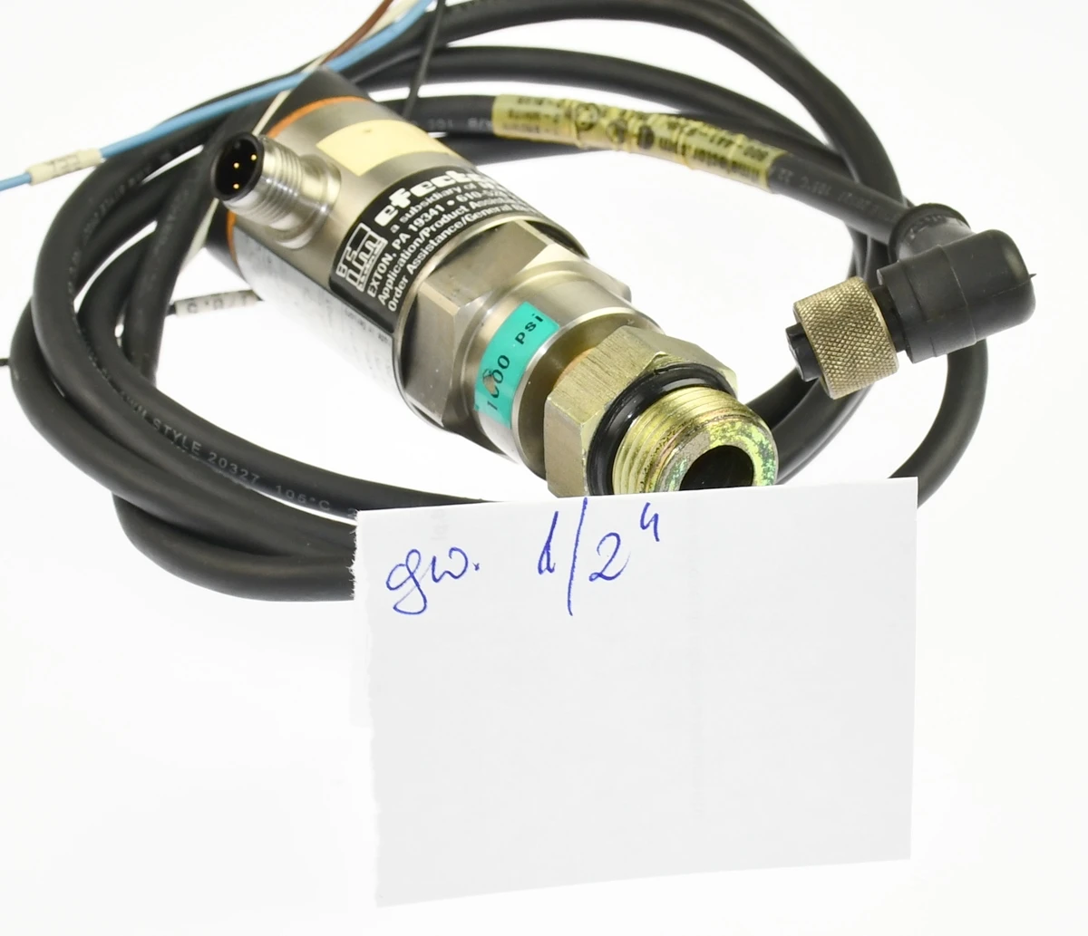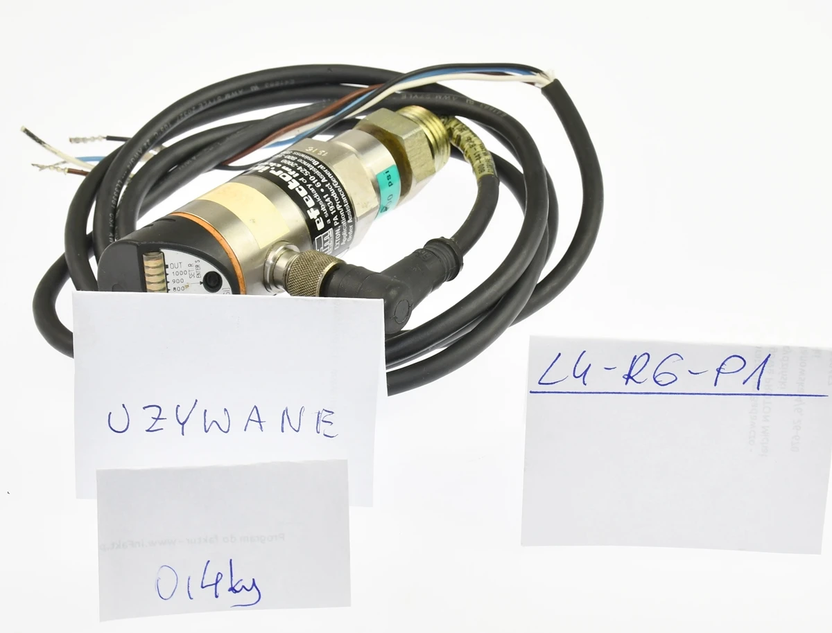Elektroniczny czujnik ciśnienia renomowanej firmy: ifm electronic. Model: PB5222 przeznaczony do zastosowań przemysłowych. Urządzenie umożliwia pomiar oraz kontrolę ciśnienia w zakresie 50–1000 PSI i wyposażone jest w wyjścia przełączające oraz funkcję nastawy punktów pracy (setpoint). Czujnik posiada przyłącze procesowe 1/4” NPT, zasilanie 18–30 V DC oraz zabezpieczenie przeciwzwarciowe. Obudowa o wysokiej klasie szczelności IP67 zapewnia niezawodną pracę w trudnych warunkach przemysłowych. Wbudowany wskaźnik LED umożliwia łatwą konfigurację i odczyt stanu pracy. Przejściówka na męskie przyłącze 1/2''. W zestawie jest też przewód sygnałowy z wtyczką M12.