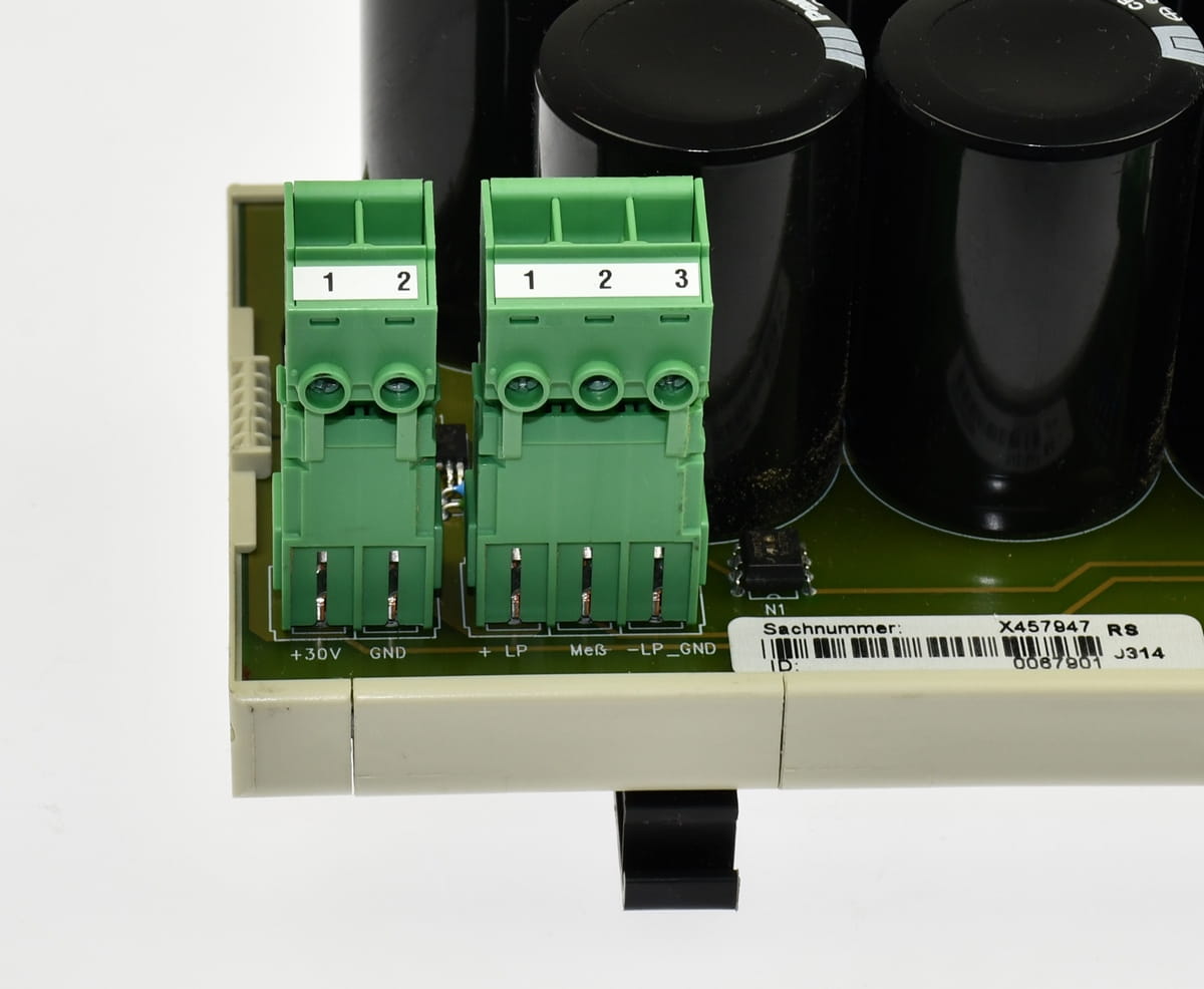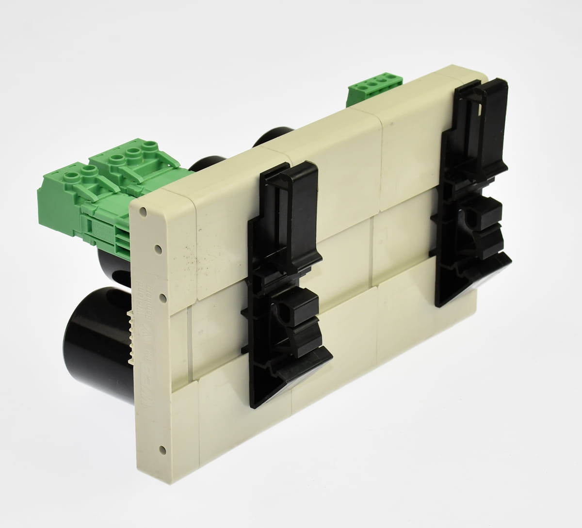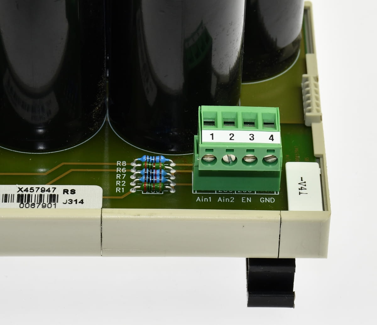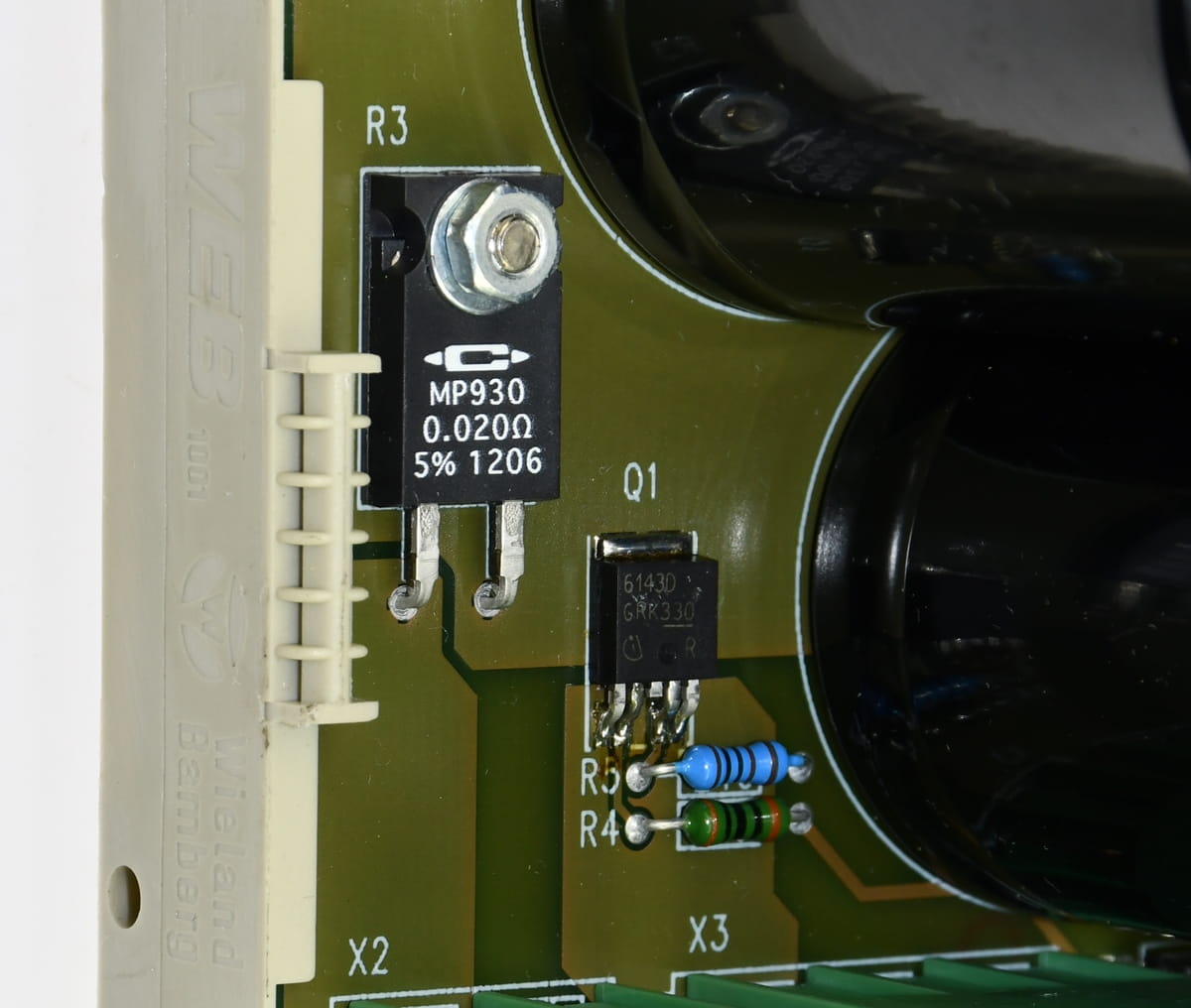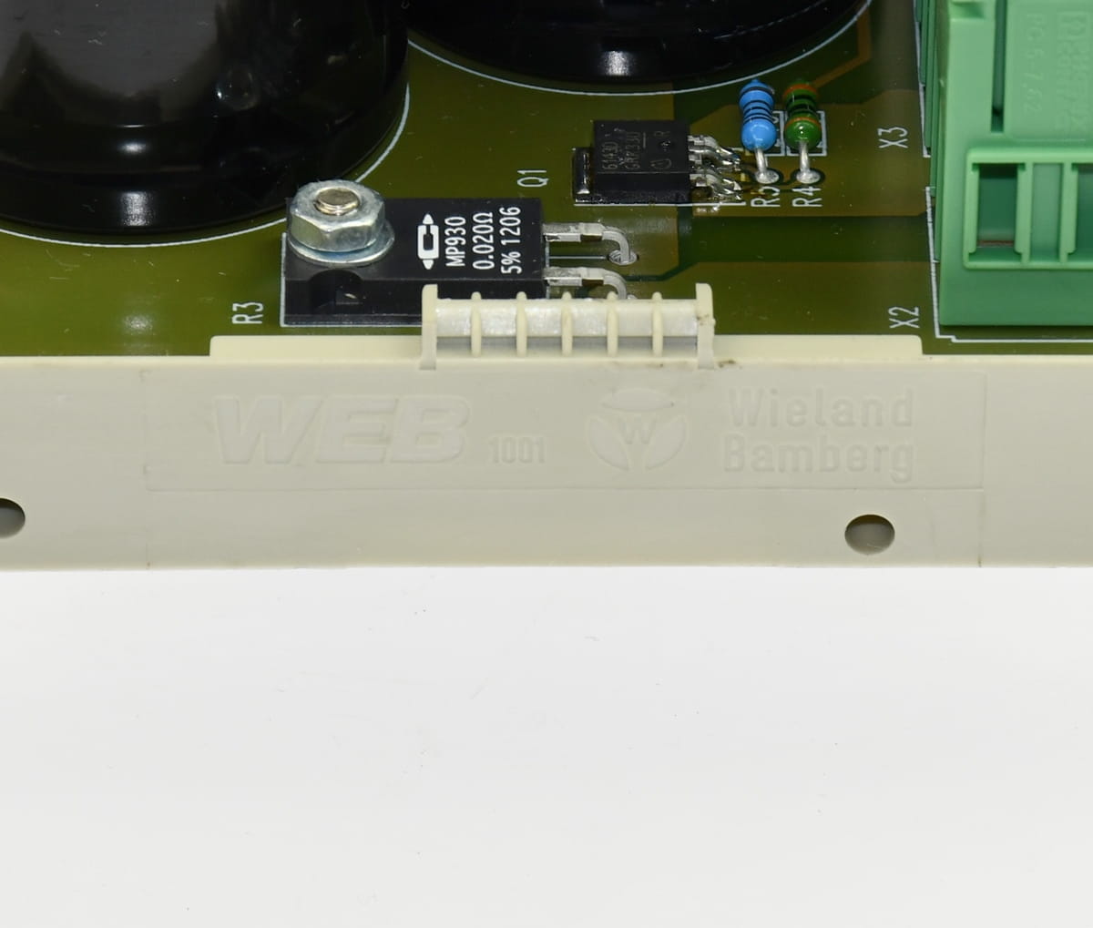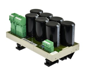 Używany moduł z siedmioma kondensatorami wysokiej jakości o pojemności 12000uF i na napięcie 63V każdy, wyprodukowane przez firmę Panasonic. Na płytce PCB w obudowie z uchwytami do montażu na szynie DIN. Na płytce są też wysokoprądowe złącza mocy i mniejsze kontrolne. Jest rezystor do pomiaru prądu: MP930 o rezystancji 0.020R, jest też półprzewodnikowy przełącznik zabezpieczenia: BTS6143D. Moduły pracowały jako stabilizatory napięcia wysokowydajnych zasilaczy przemysłowych. Każdy indywidualnie testowany w naszej pracowni.