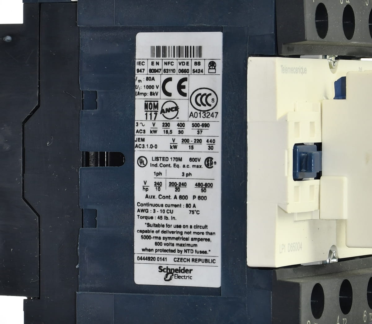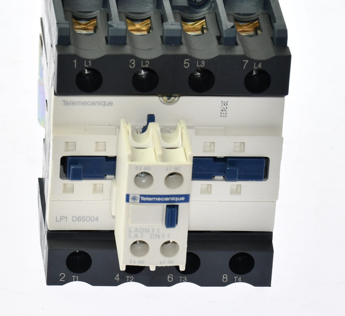 Używany, całkowicie sprawny stycznik o symbolu: LP1 D65004, produkt firmy Telemecanique. Stycznik 4 polowy, moc łączeniowa 30 kW, cewka zasilana napięciem stałym 24V. Posiada w zestawie mocowanie na szynie DIN, jest też moduł stykowy, dodatkowy: LADN11, LA1 DN11. Testowany i przeglądany w naszym laboratorium - brak zużycia styków.