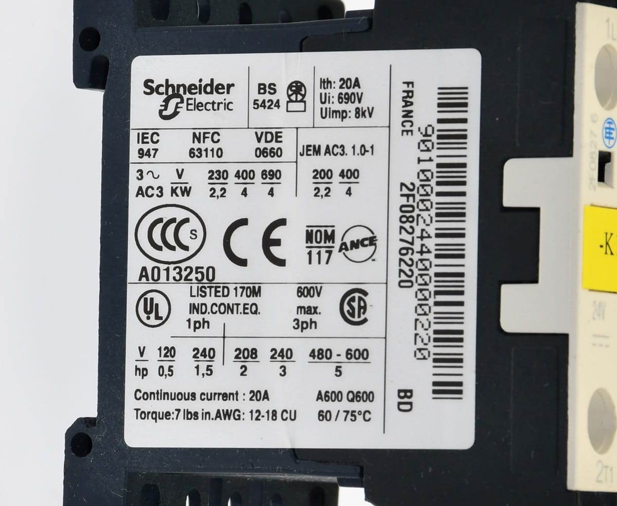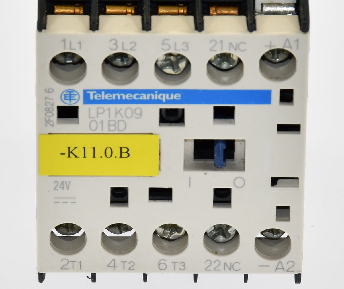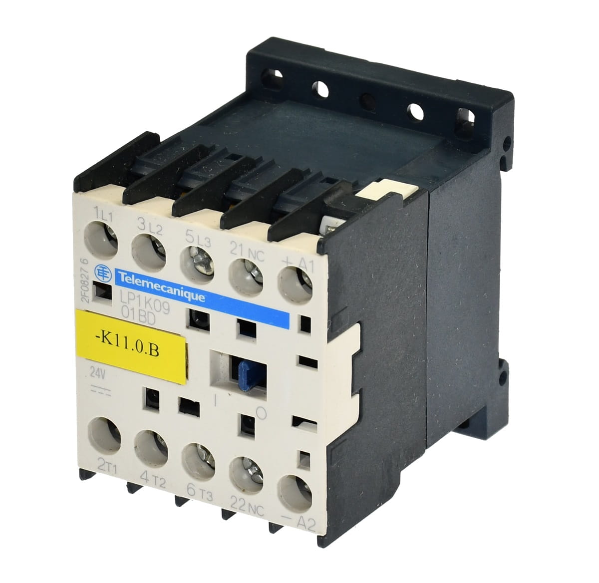 Używany element o oznaczeniu: LP1K09 01BD, produkt firmy Telemecanique. Stycznik trójfazowy dla obwodów o mocy do 4kW, Cewka sterowana napięciem DC24V.